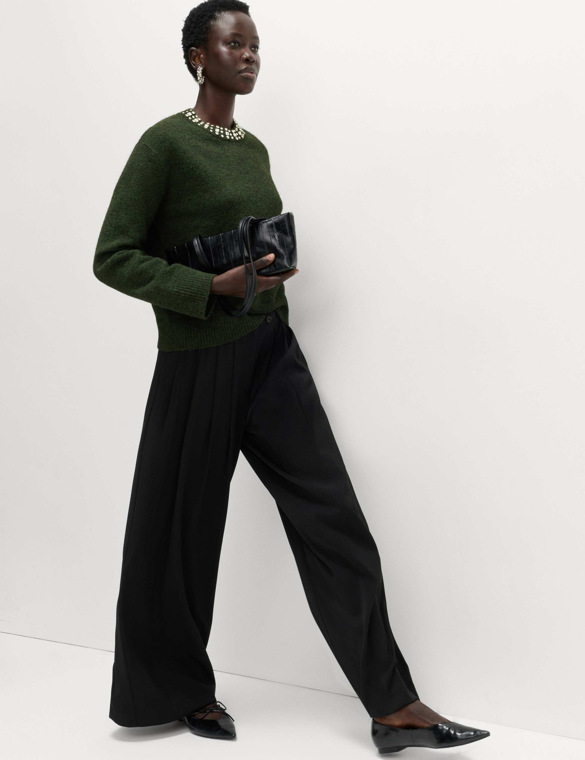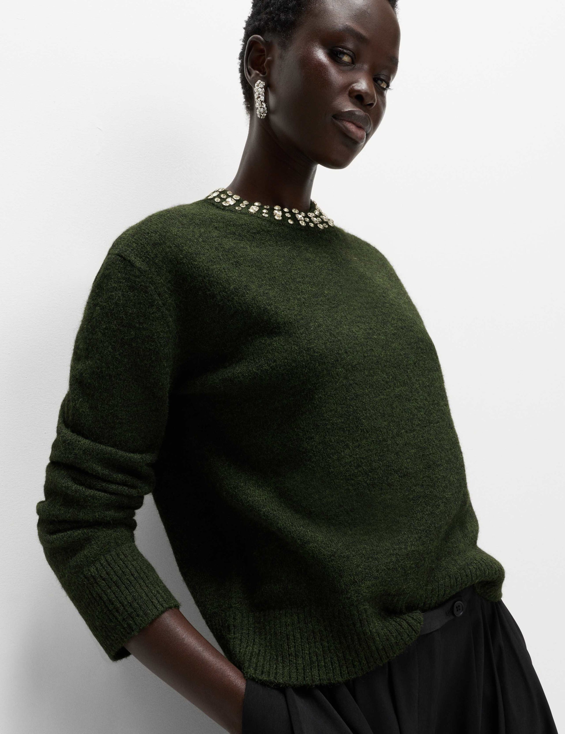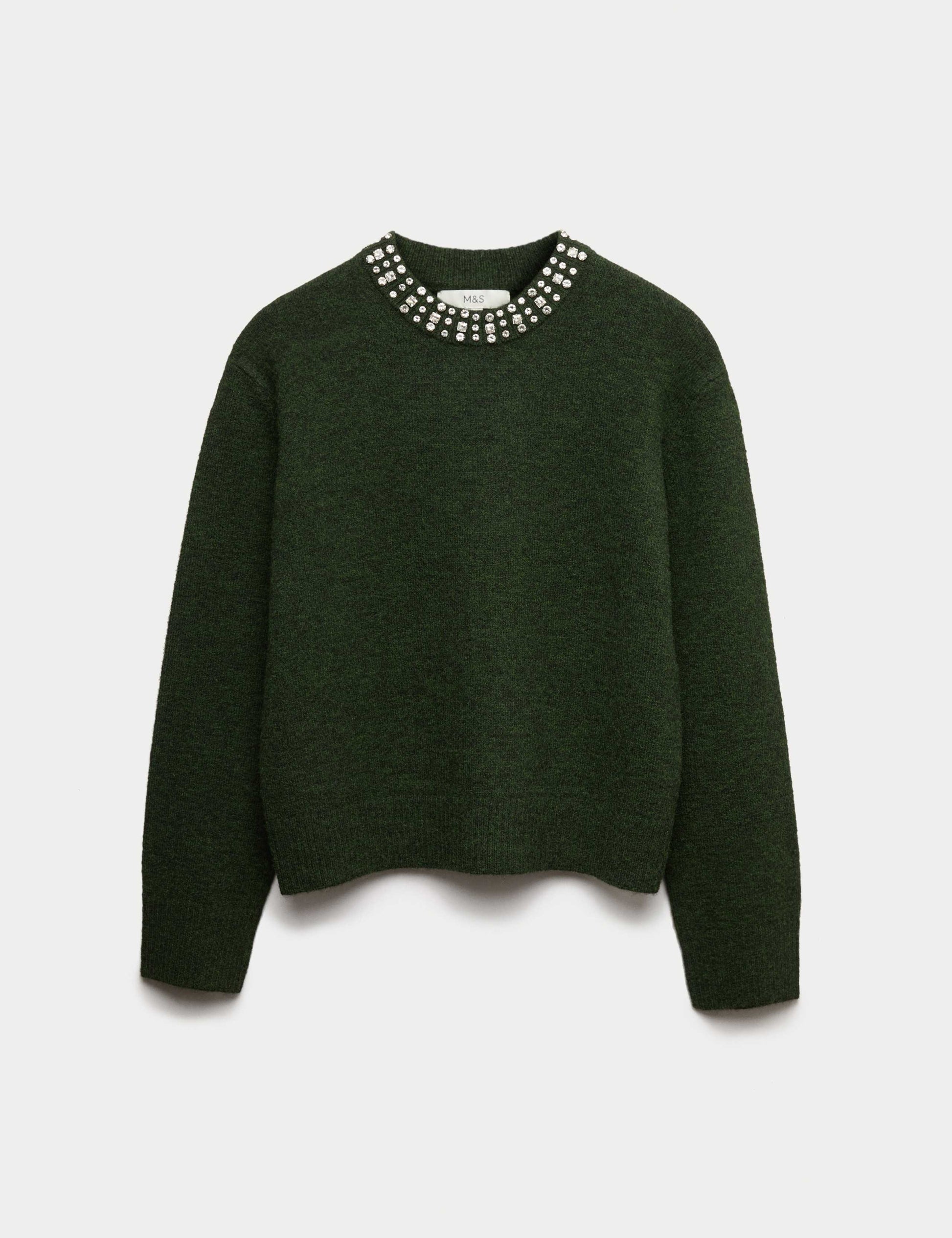 Elevate your knitwear collection with this cosy jumper, made with a touch of wool for a luxurious feel. It's designed in a relaxed fit, with a crew neckline which features sparkling embellishments for a truly glamorous finish.