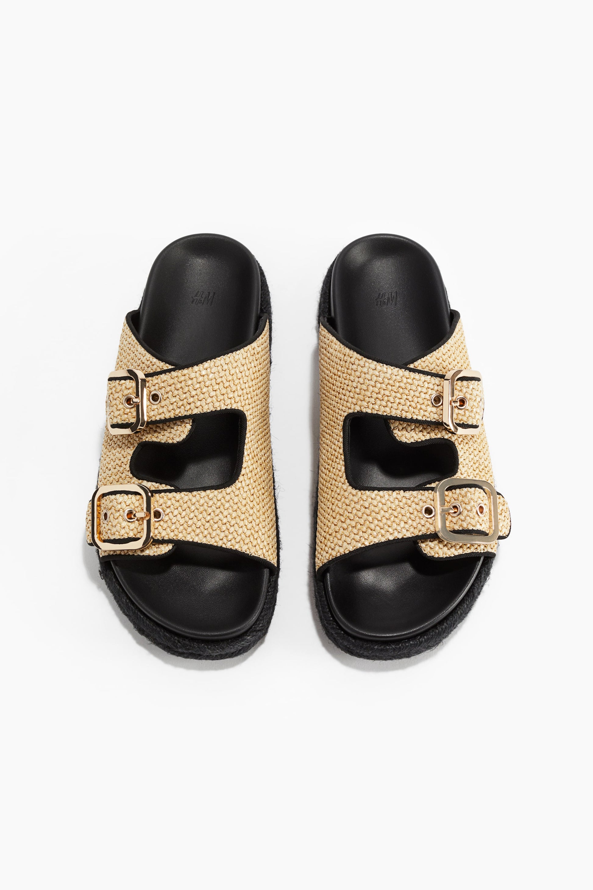 Sandals with braided, adjustable foot straps, rounded toes and a braided trim around the soles.