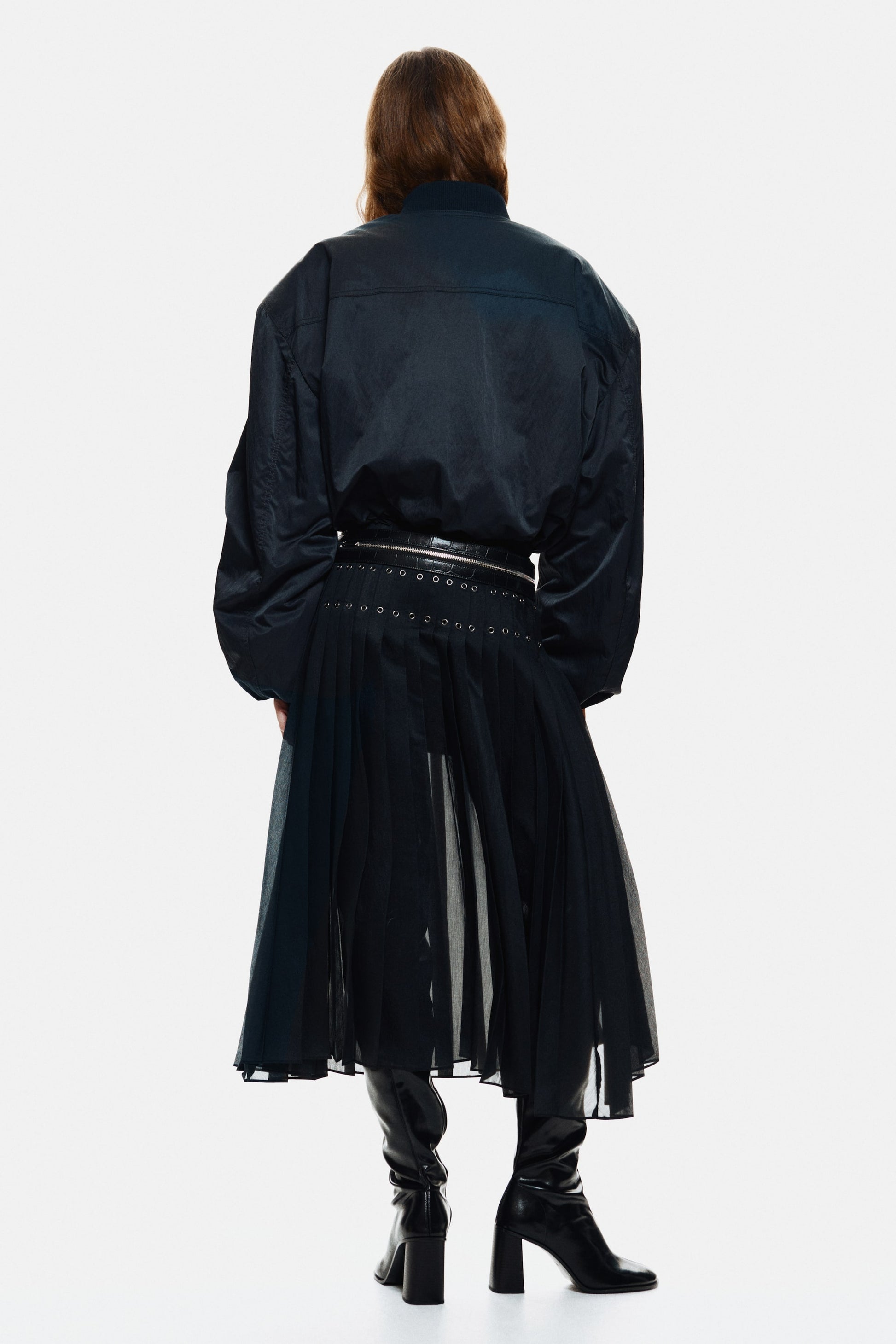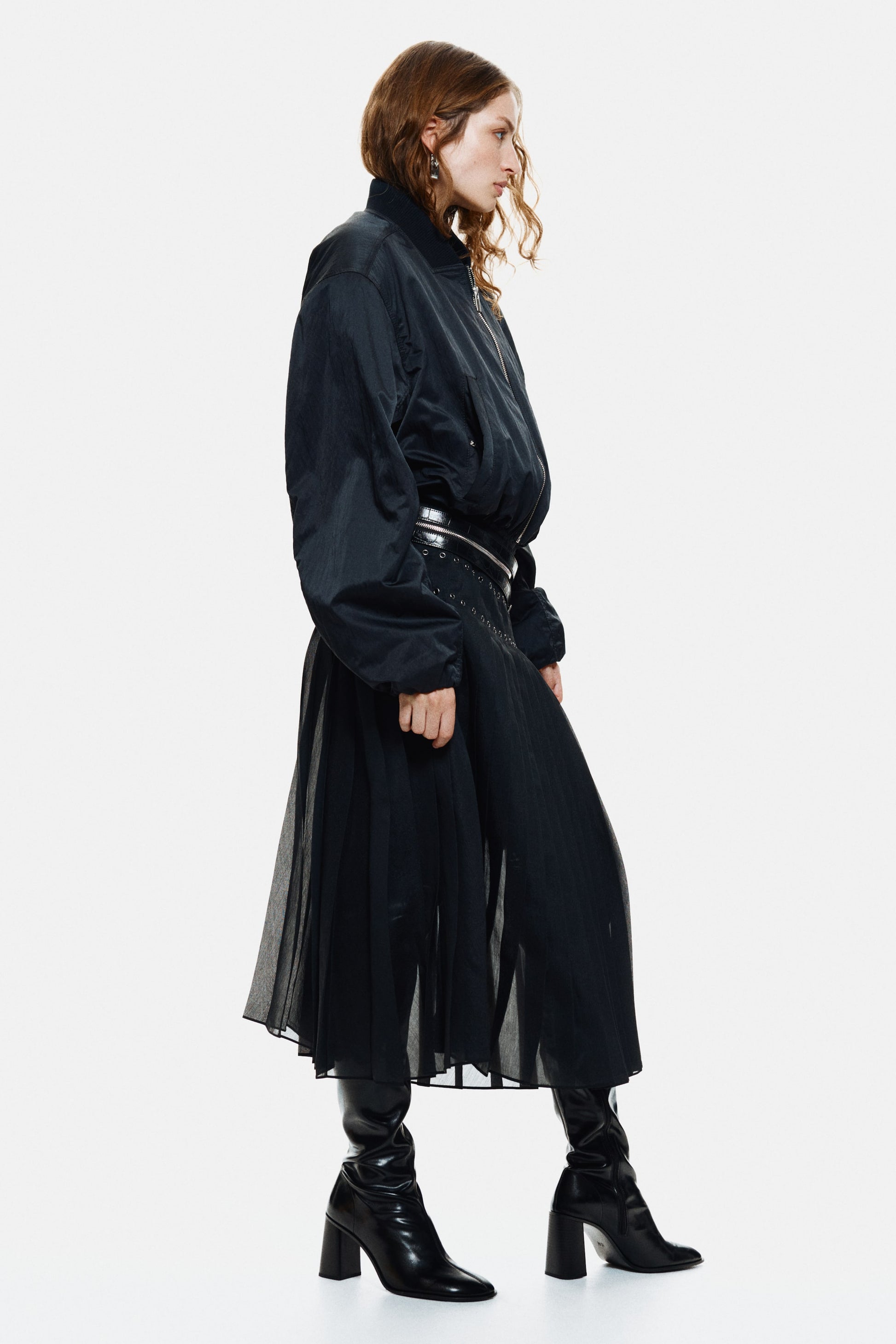 Calf-length, flared skirt in pleated chiffon featuring a regular waist with three rows of metal eyelets and a concealed zip at one side. Lined.