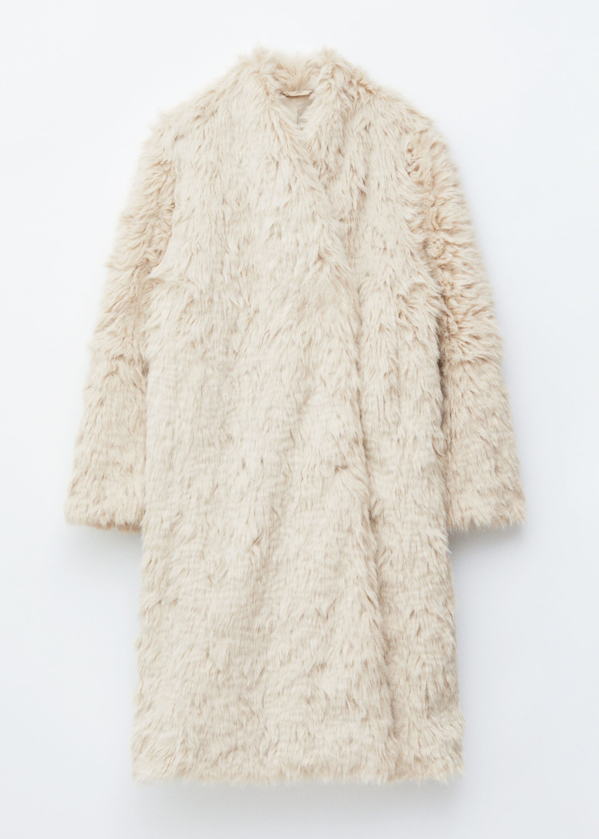 Made from soft faux fur, this coat is cut in a straight, loose silhouette with long sleeves and a subtle shawl-style collar. Completed with side-seam pockets and two button closures at the front.