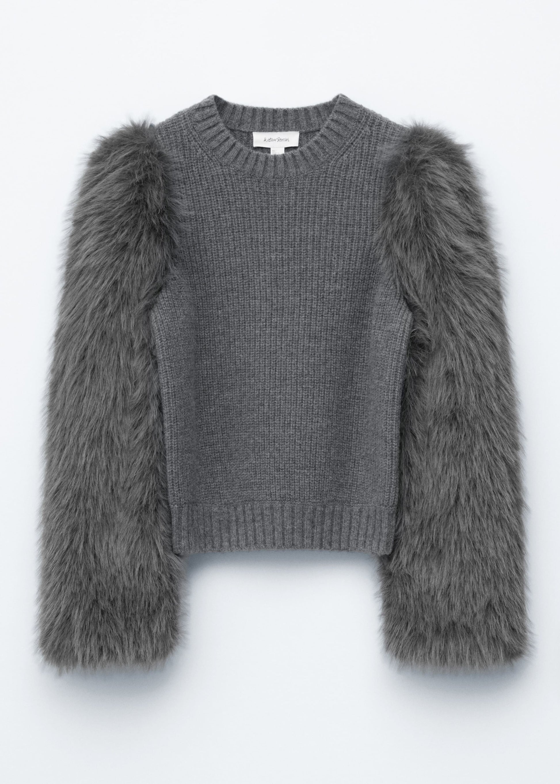 This jumper features a knitted wool-cotton blend body with faux fur puff sleeves lined in jersey, creating a wearable statement. Finished with a round rib-trimmed neckline and ribbed hem.
