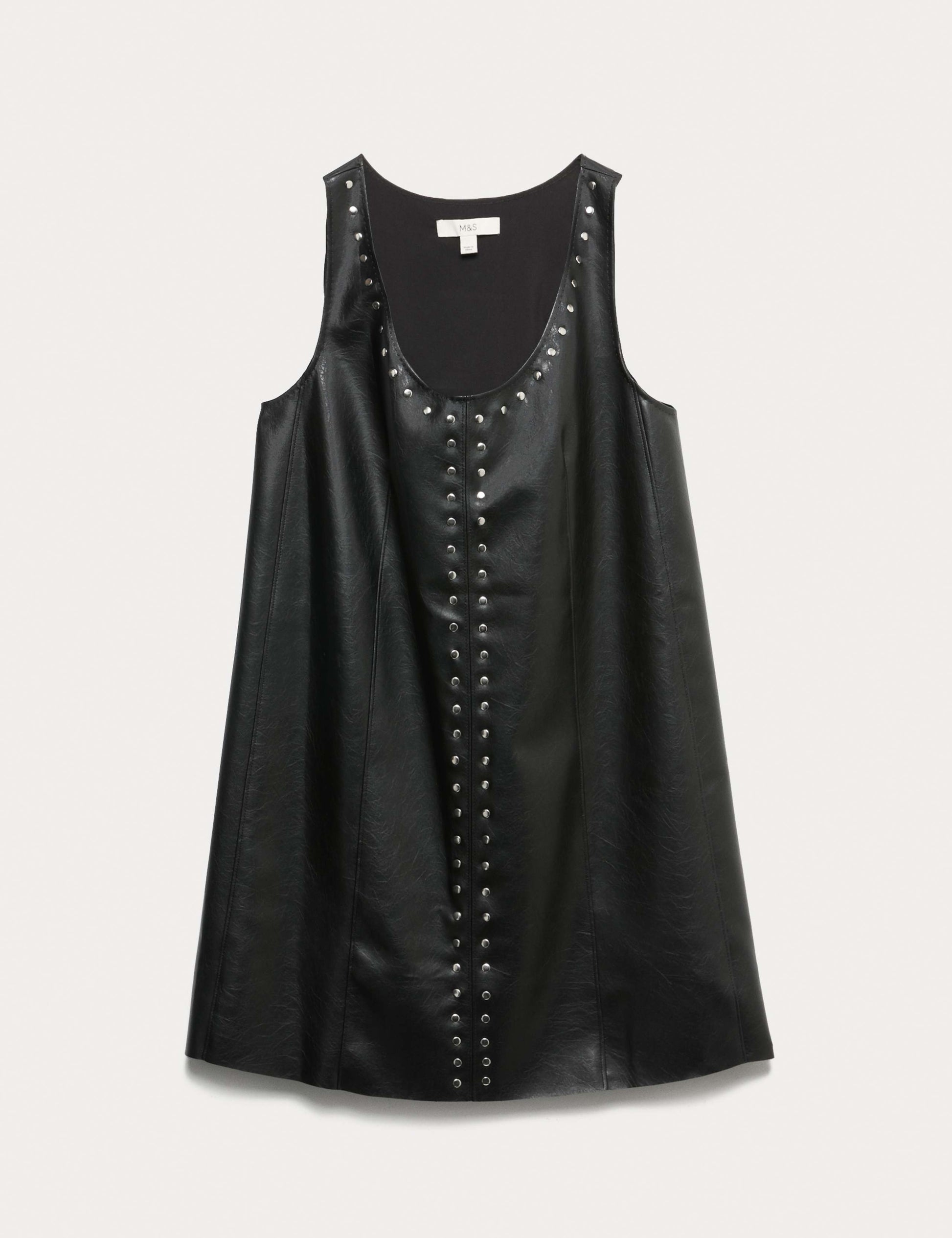 Studded detailing brings edgy glamour to this faux leather dress. It's cut to a regular fit, with a simple shift shape that falls to a mini length. A scoop neckline and sleeveless cut complete the bold, contemporary look.