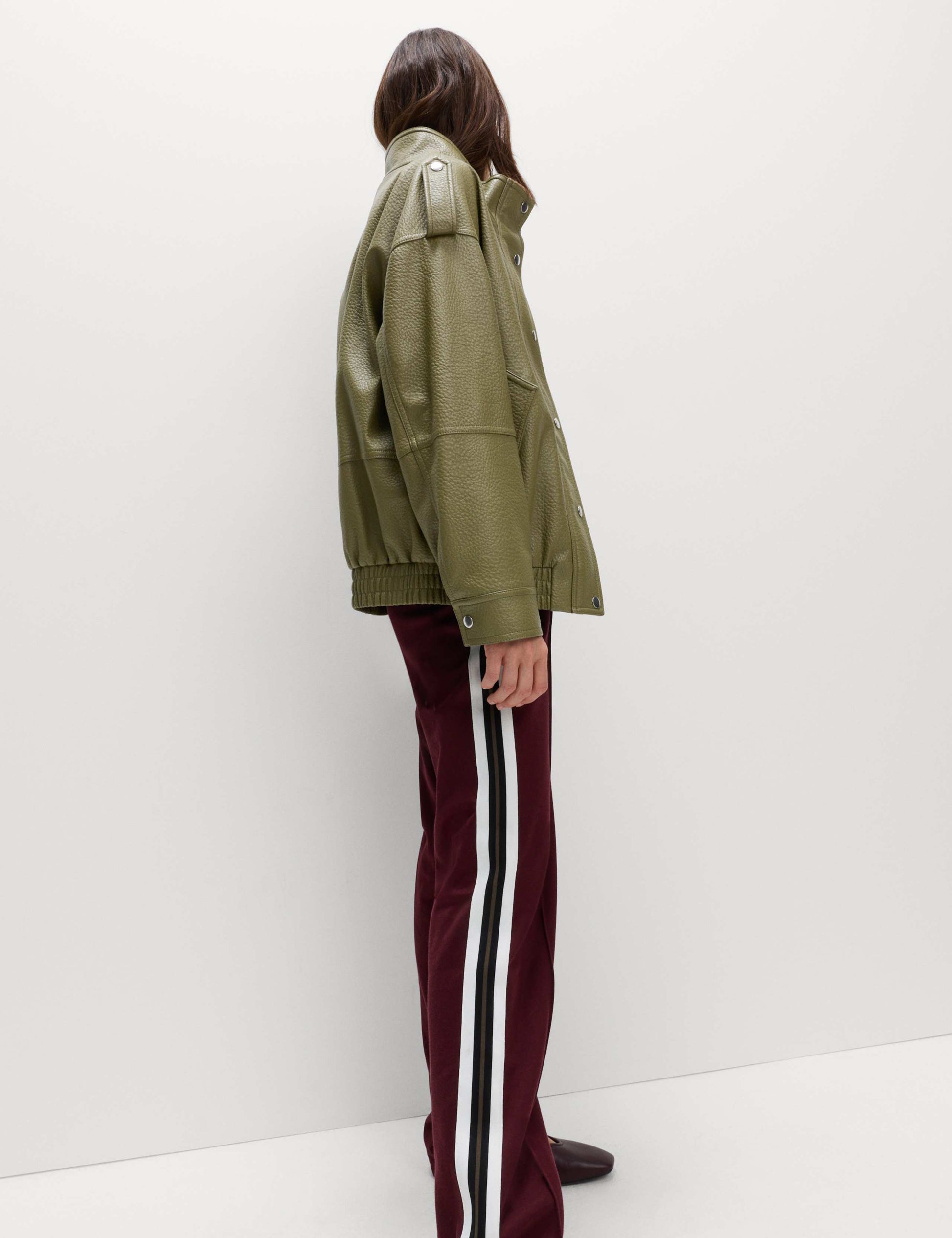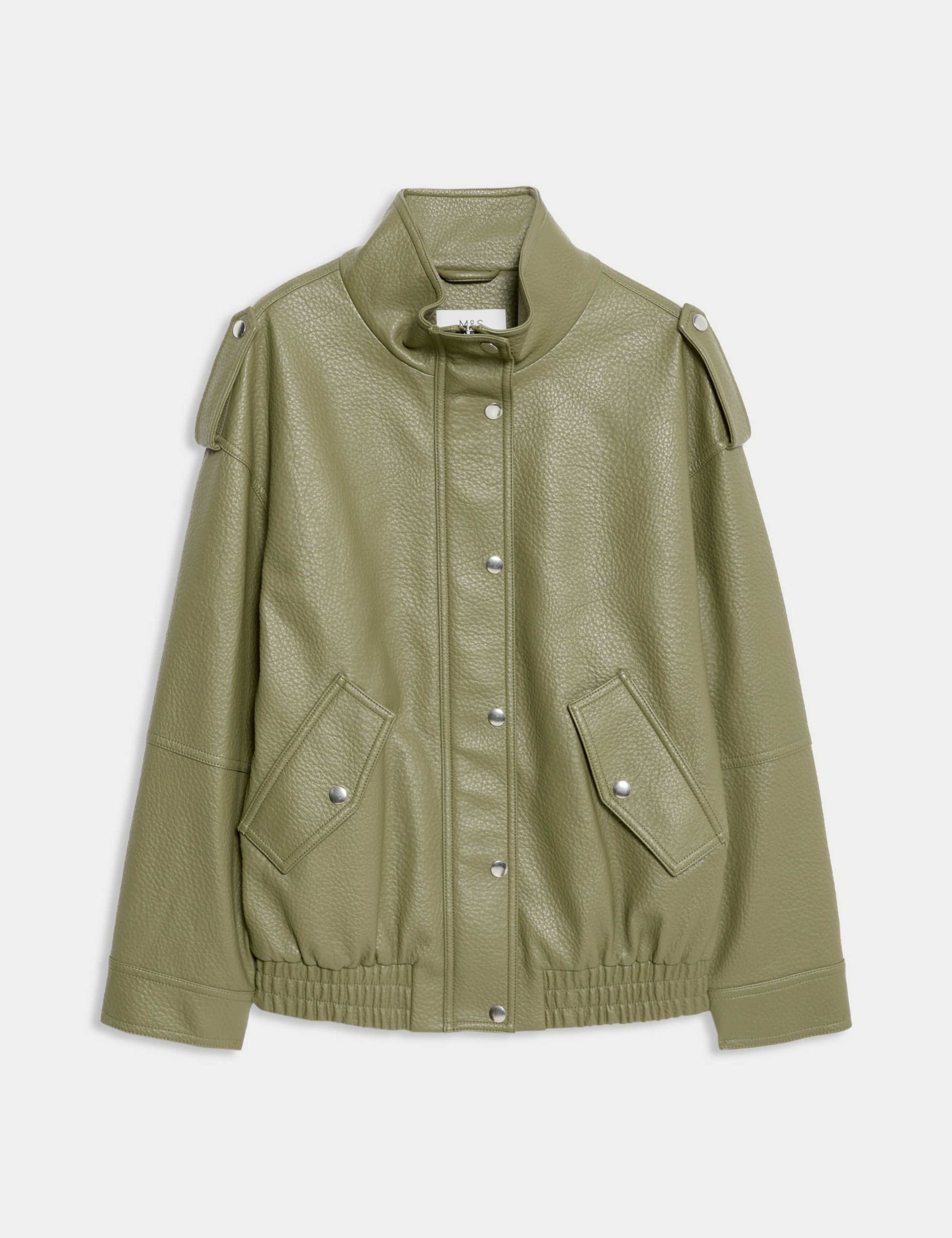 This bomber jacket is crafted from textured faux leather for an on-trend look. It's designed in a relaxed fit with casual dropped shoulders and features an elasticated ribbed hem for an authentic silhouette. The funnel neck, snap-button placket and epaulettes add to the utilitarian feel. Two angled front pockets complete the piece.