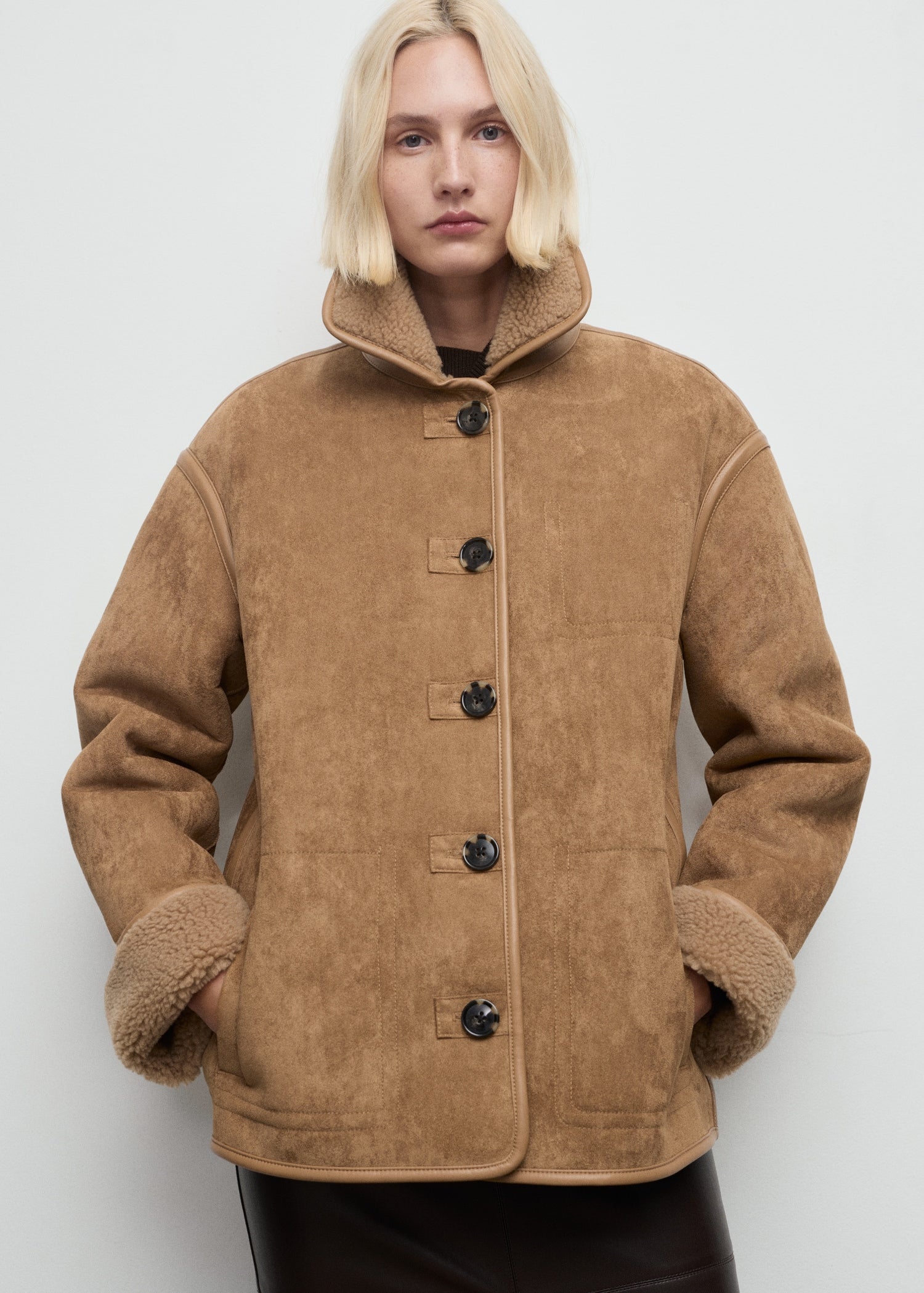 With a suede-effect, this straight design features a shearling shirt collar and long sleeves. It has two side pockets and a front button closure. The interior lining is also shearling
