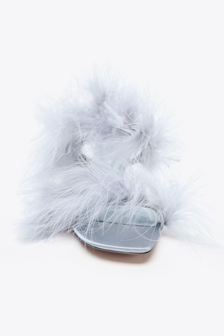 Heeled sandal shoes with straps on the front and feather detail. Mule style. High stiletto heel. Round toe.