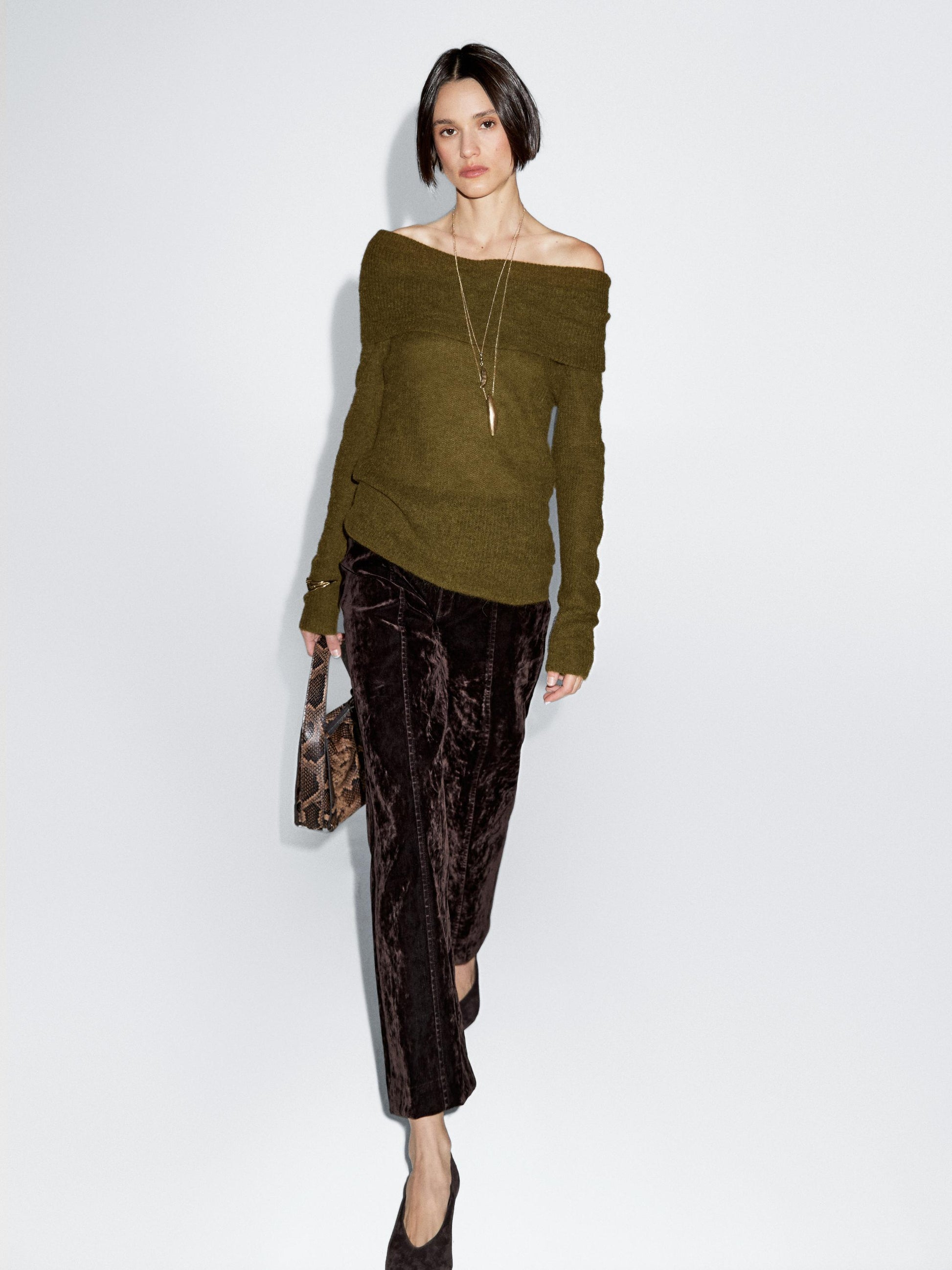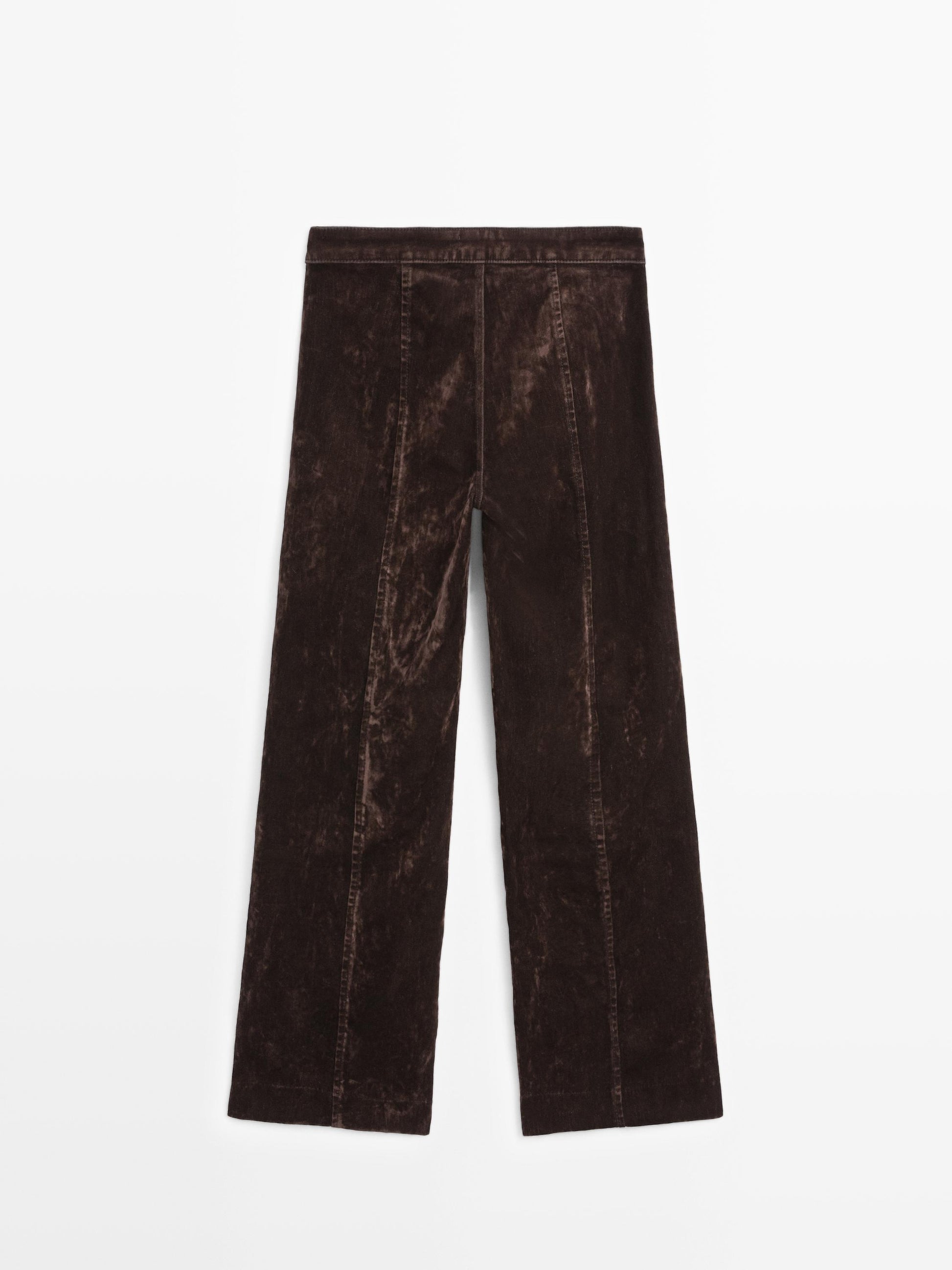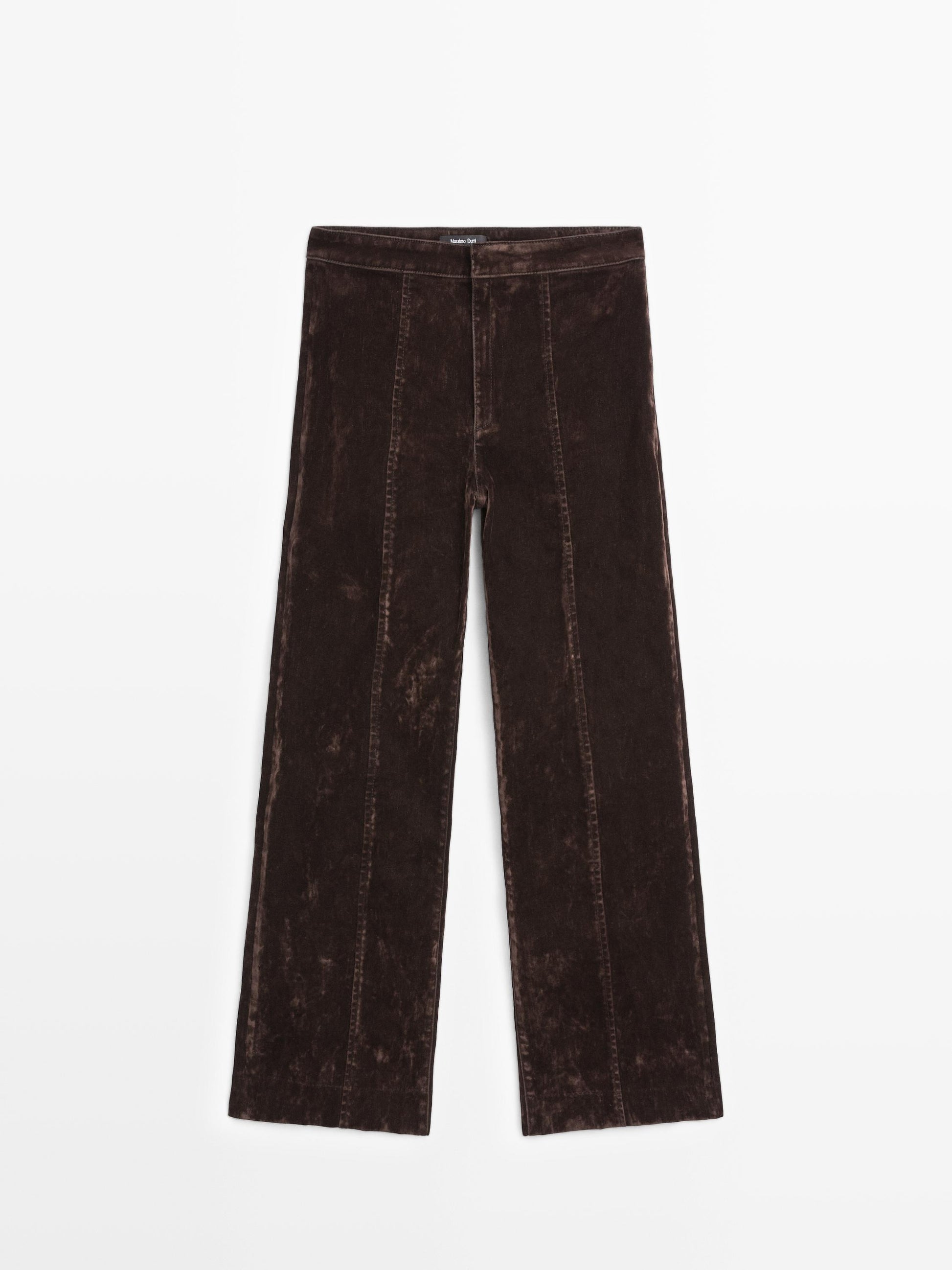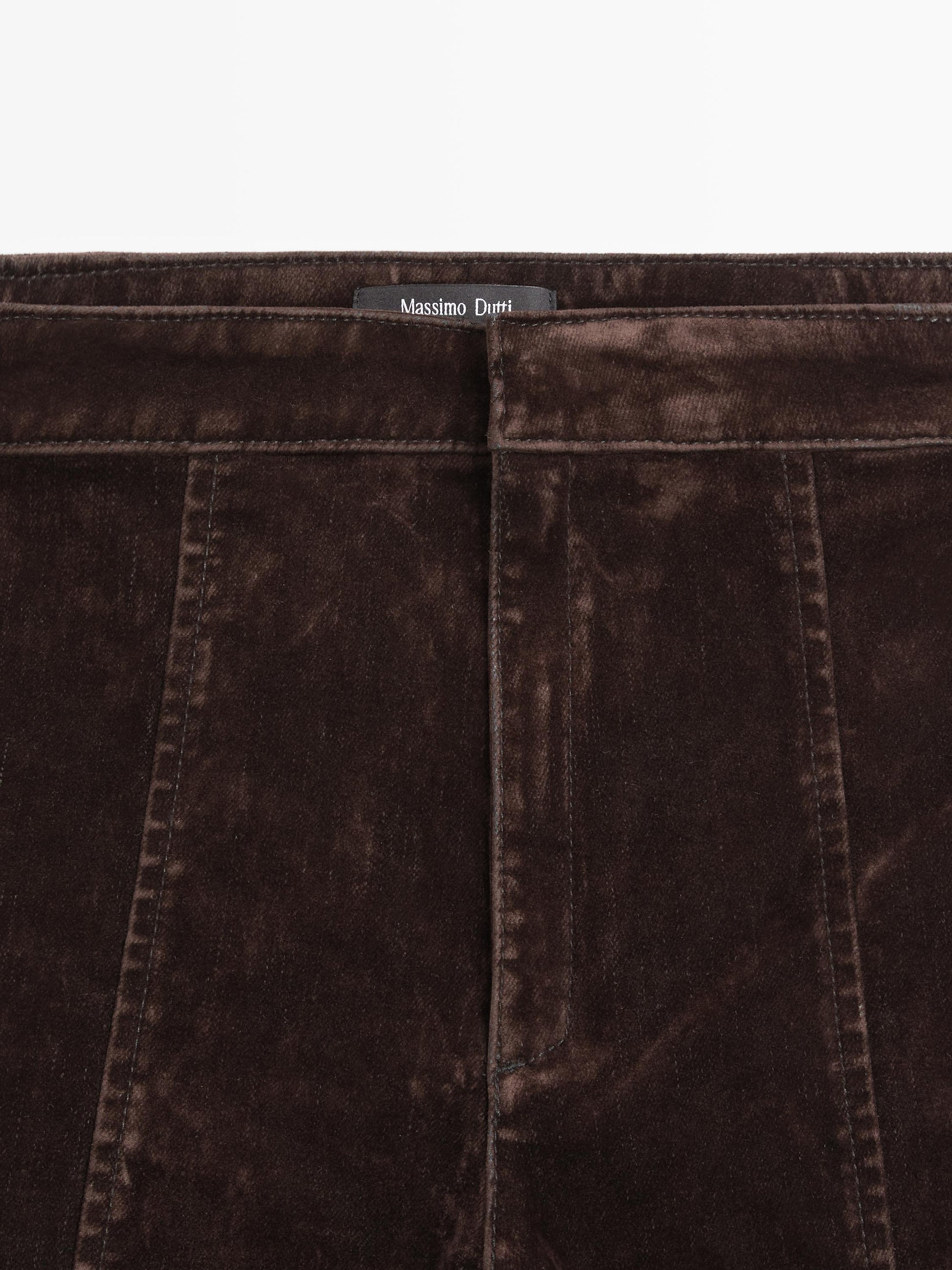 Flare fit jeans: this fit offers a cut that gradually widens from the knee to the ankle, visually lengthening the legs.. High-rise. Zip and hook-and-eye fastening with inside button . Seam details . Matching garment available. Flock finish, velvety effect, soft to the touch. Soft and velvety finish.