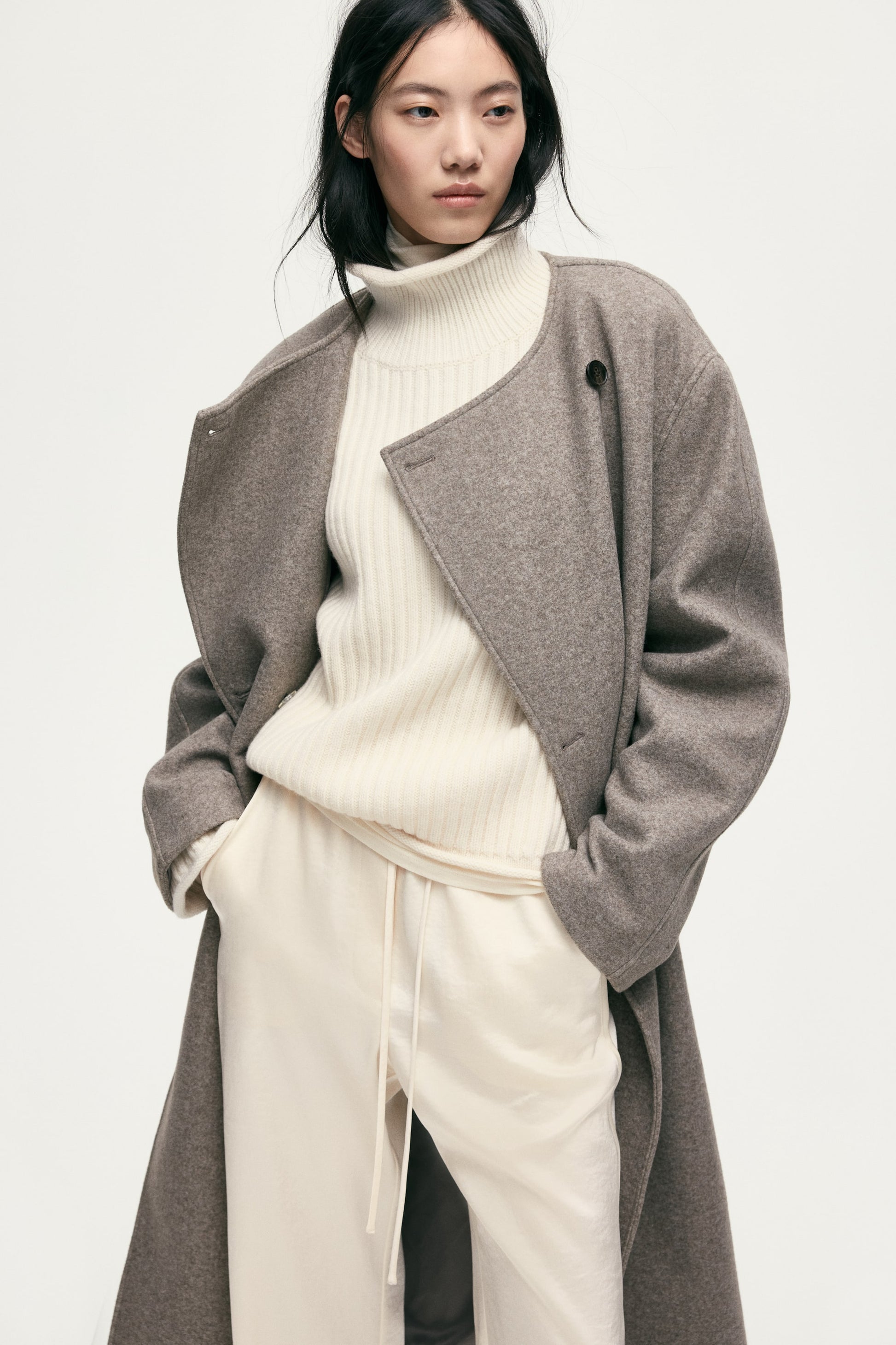 Trousers in softly draping satin featuring a wide, elasticated waistband with a narrow drawstring. Fake fly, diagonal side pockets and flared legs with tone-on-tone binding along the sides.