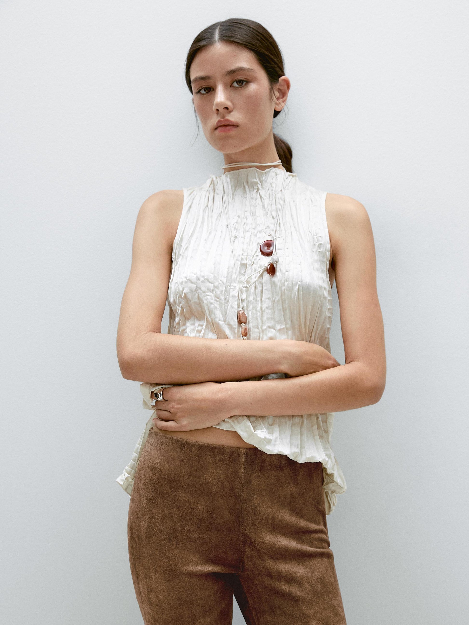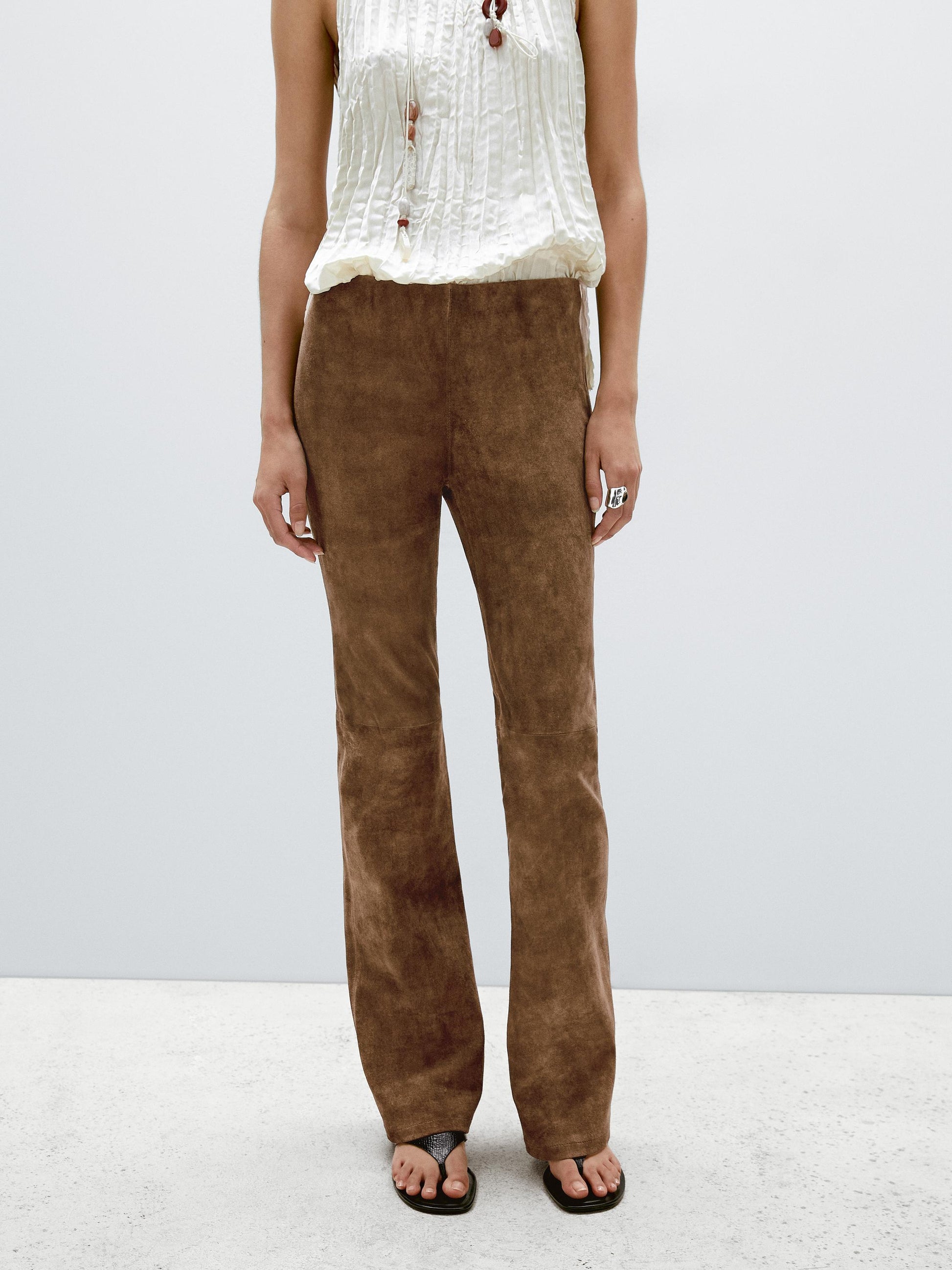 Flared trousers made of 100% goatskin leather with a suede finish. Side zip fastening. Elasticated waistband detail.