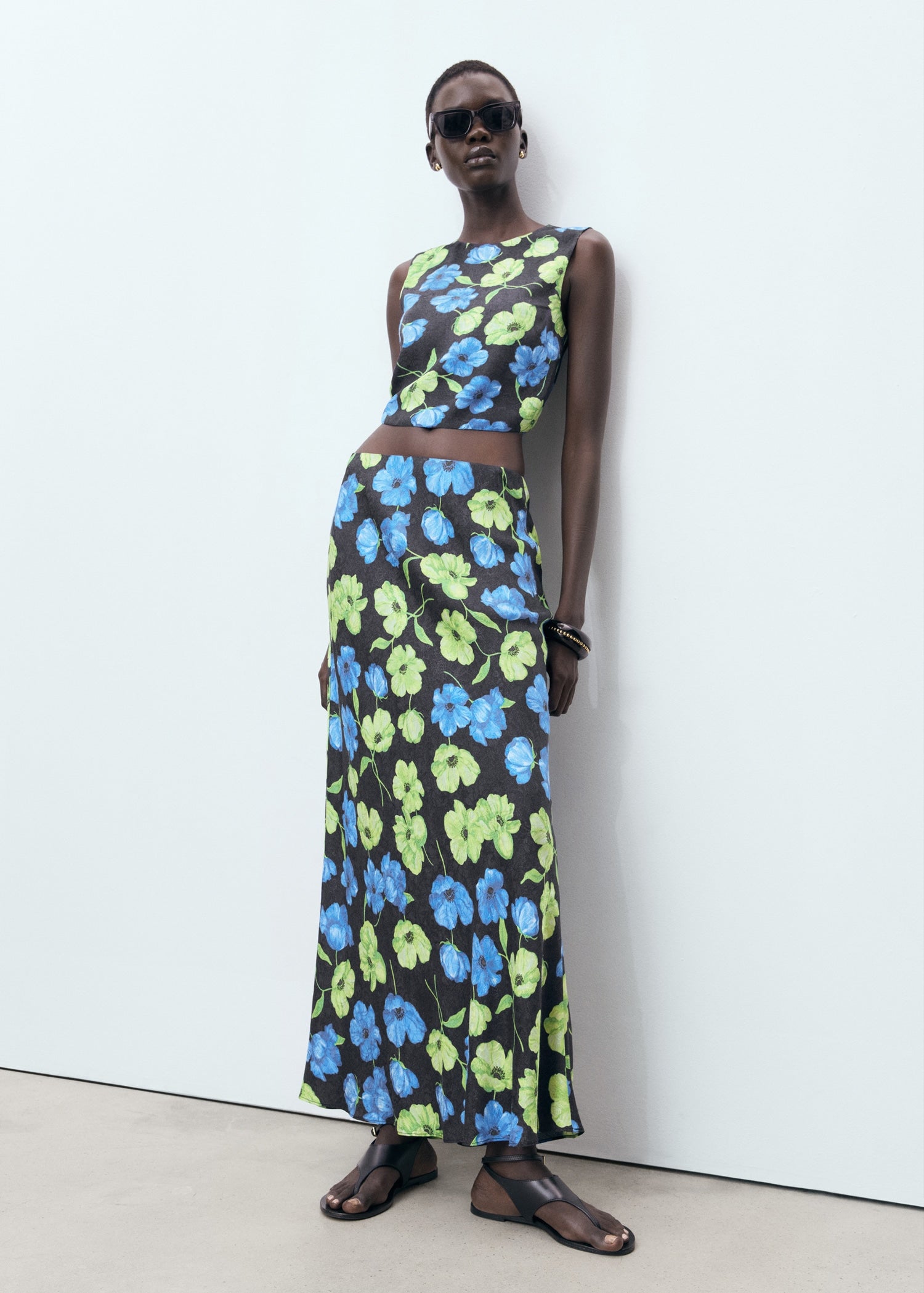 Flowy long skirt with a floral print that flatters the figure with its straight cut. It offers comfort and movement. Ideal for a total look with the matching blouse, it is perfect for any occasion