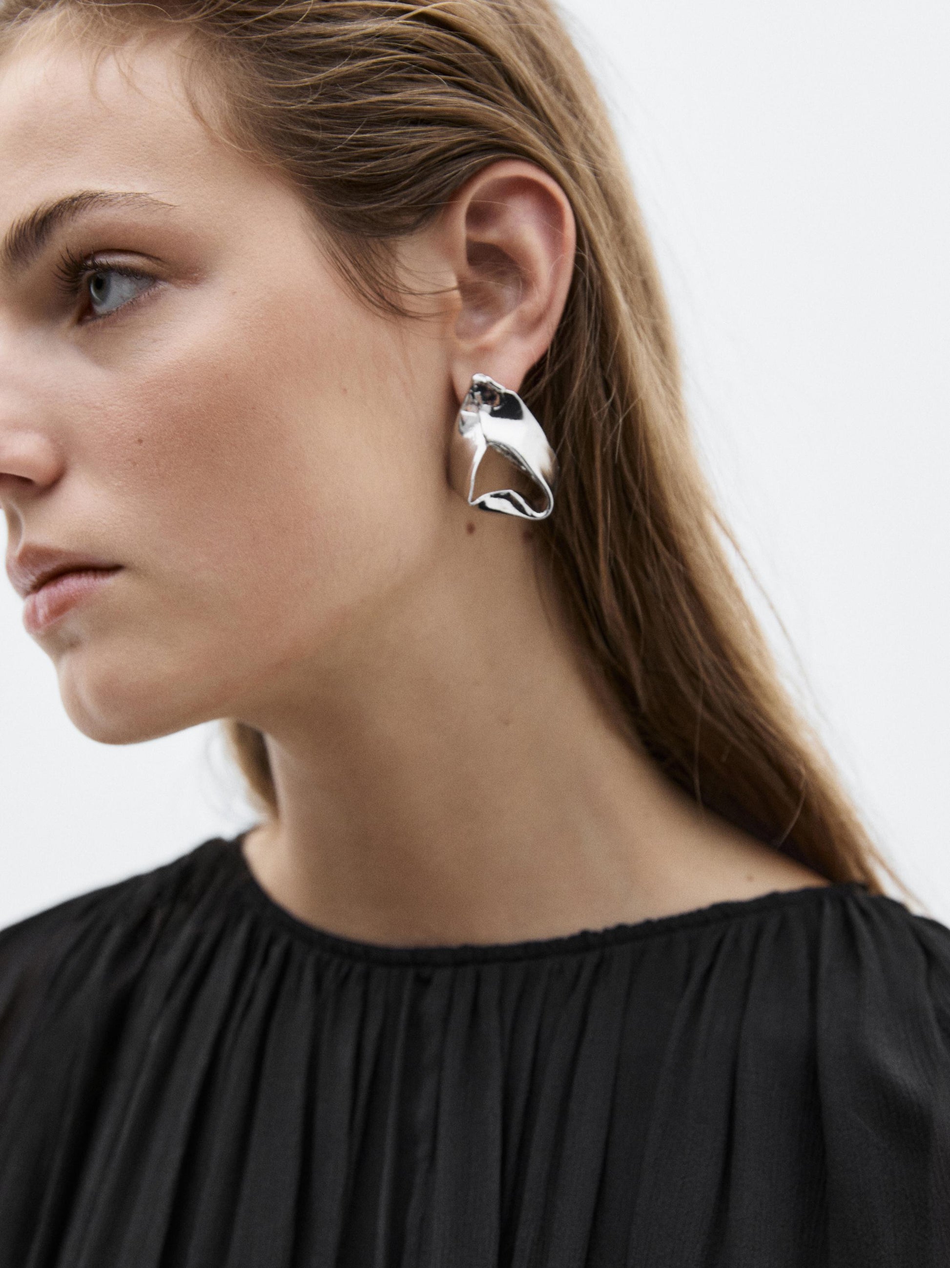 Flowing blouse. Crew neck. Batwing sleeves. Back button fastening and teardrop opening. Semi-sheer fabric.