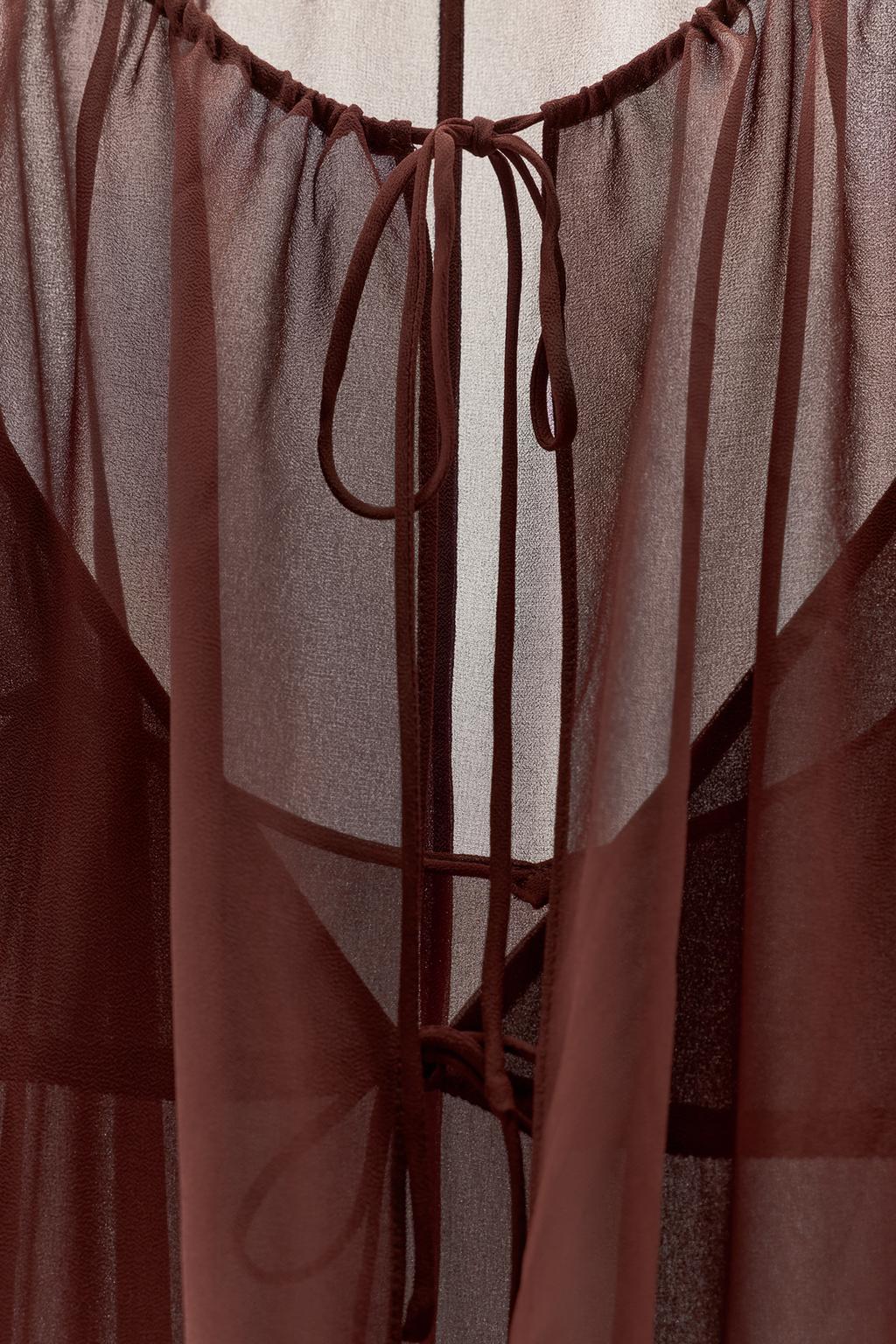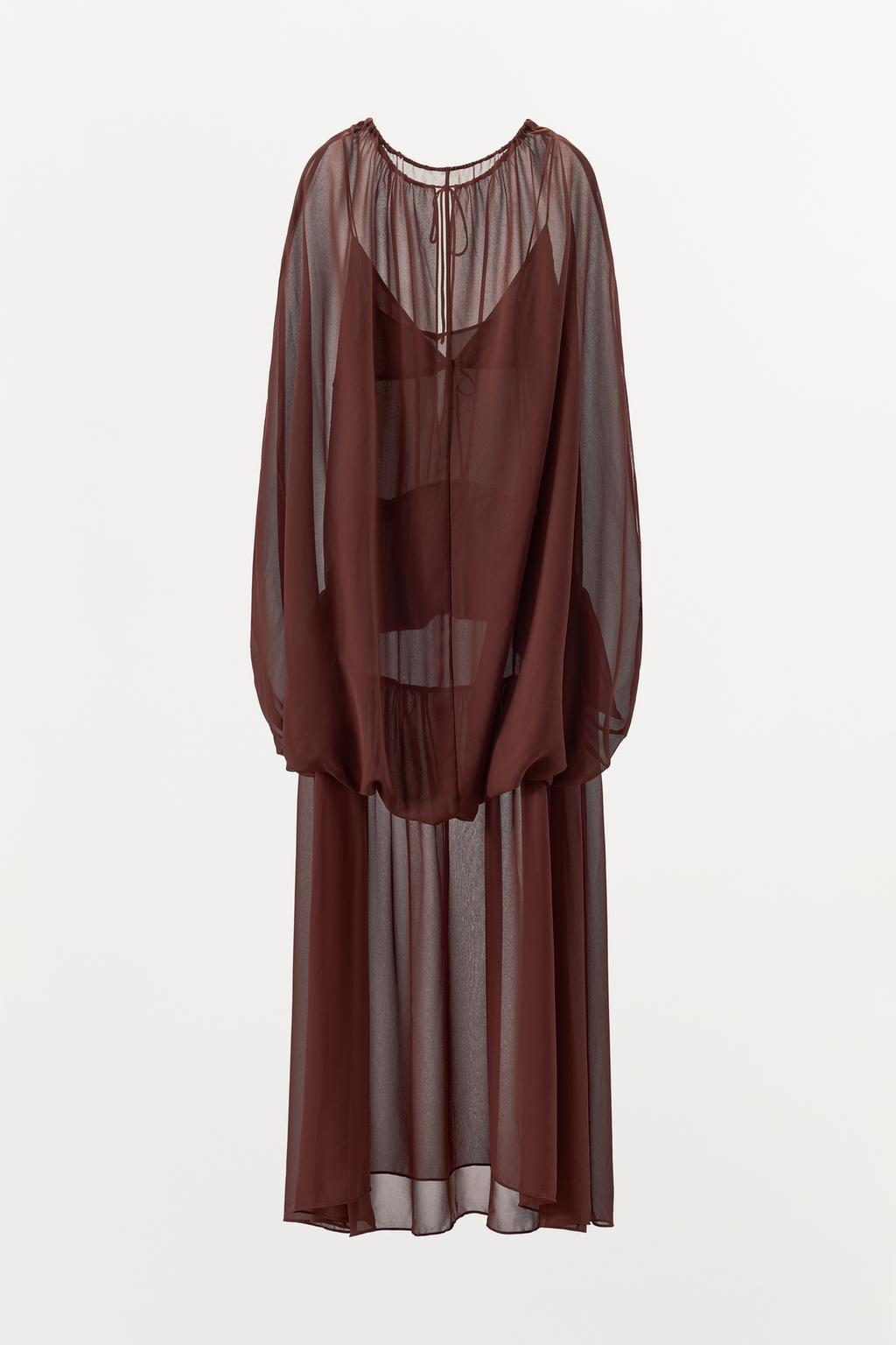 Long flowing dress with a round neck and adjustable V-neck with ties. Features cape sleeves.