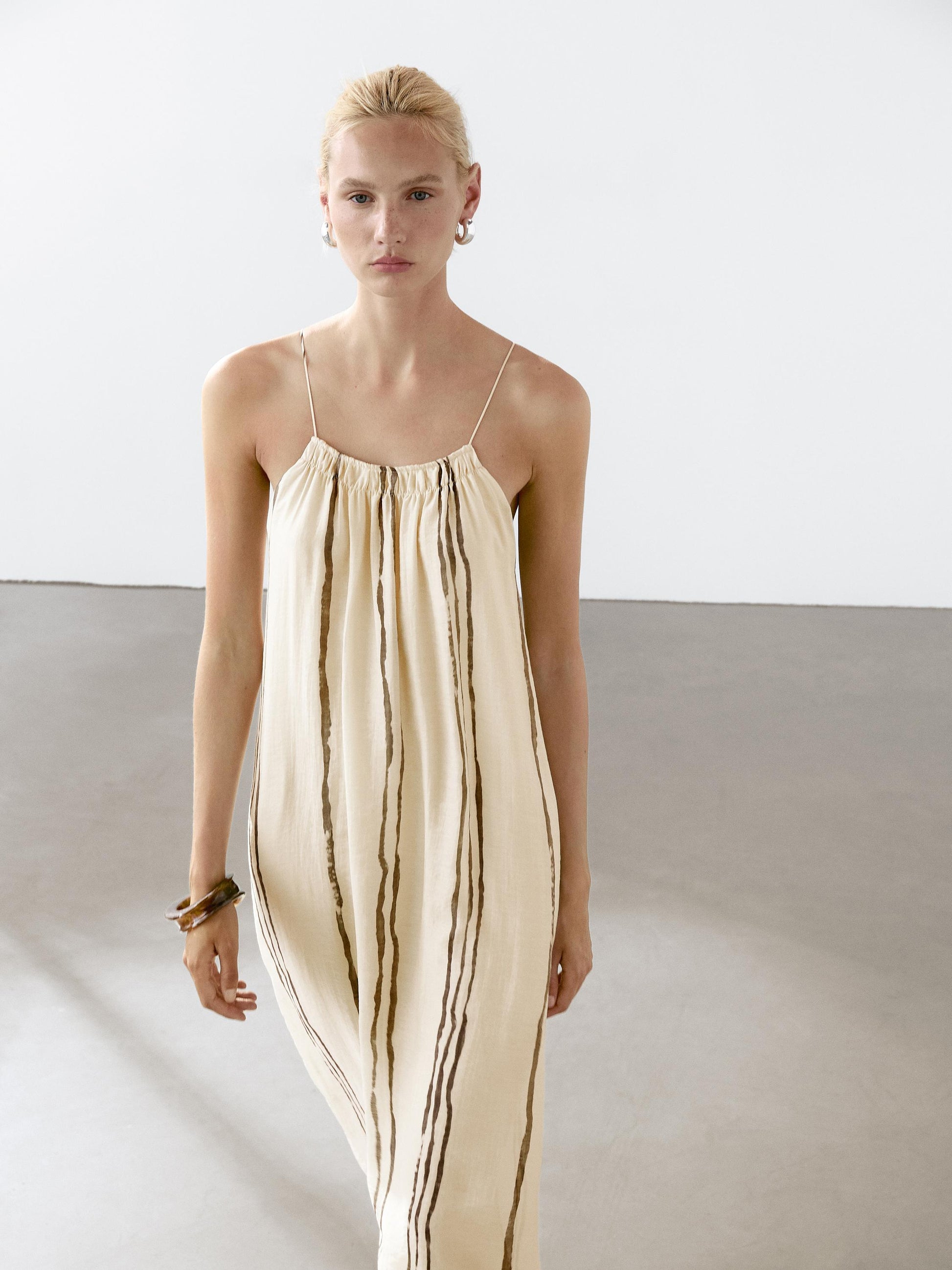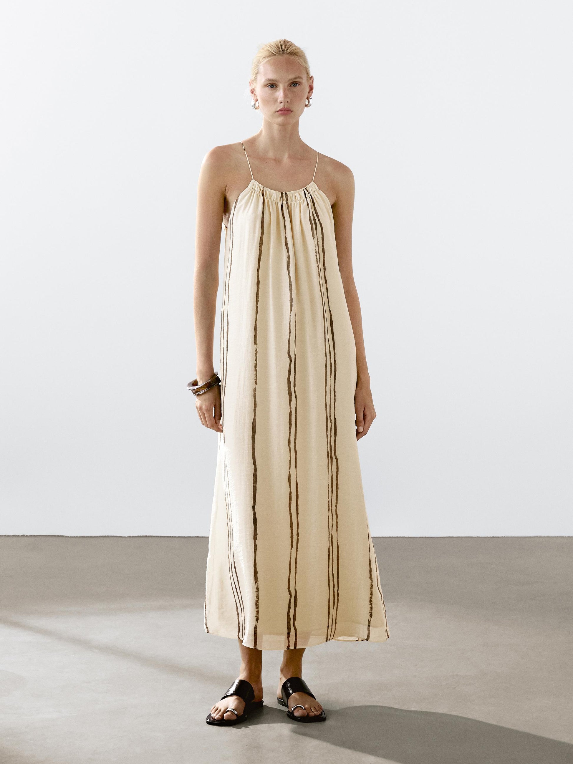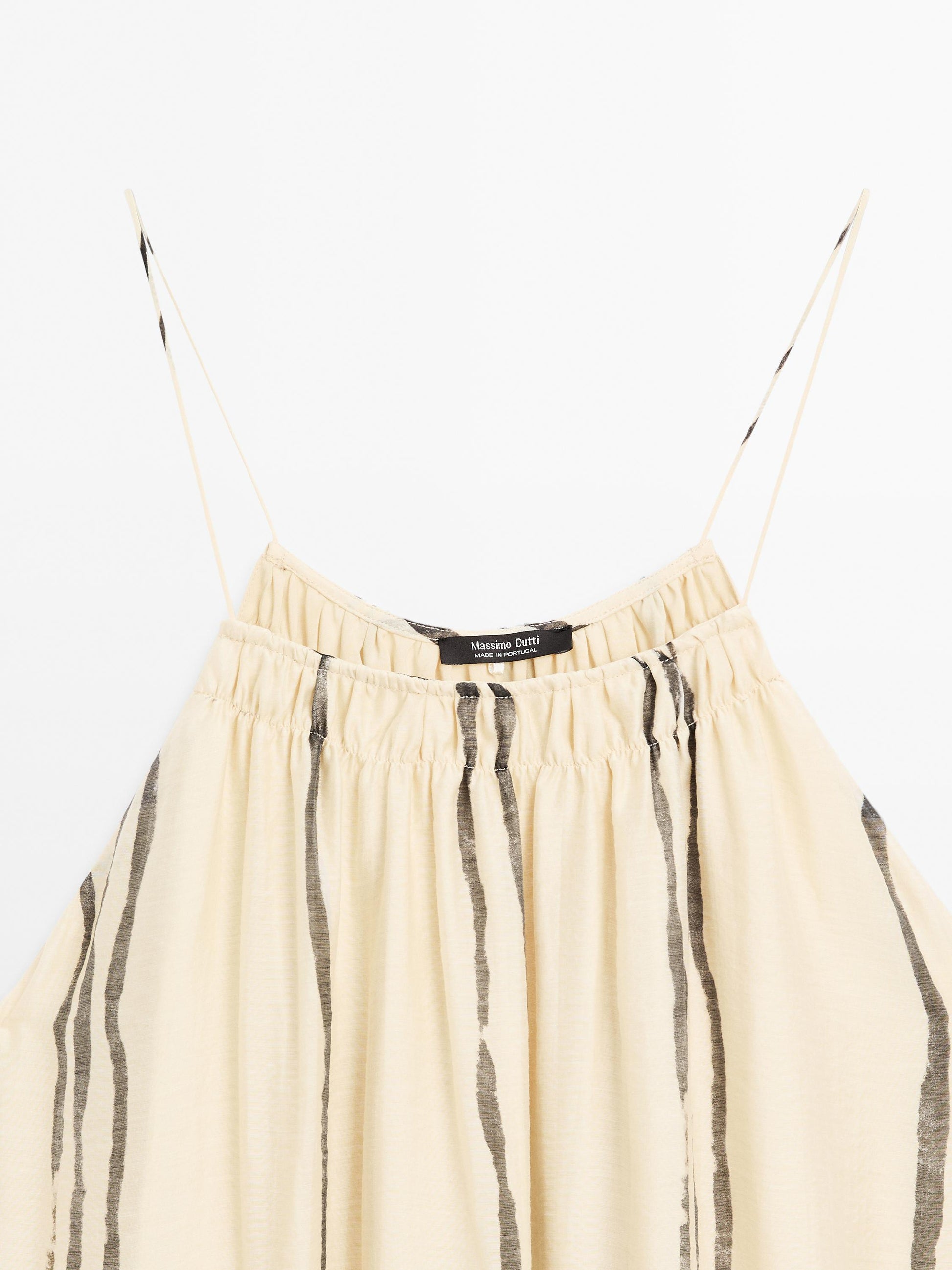 Strappy. Lined. Gathered detail. Striped print.