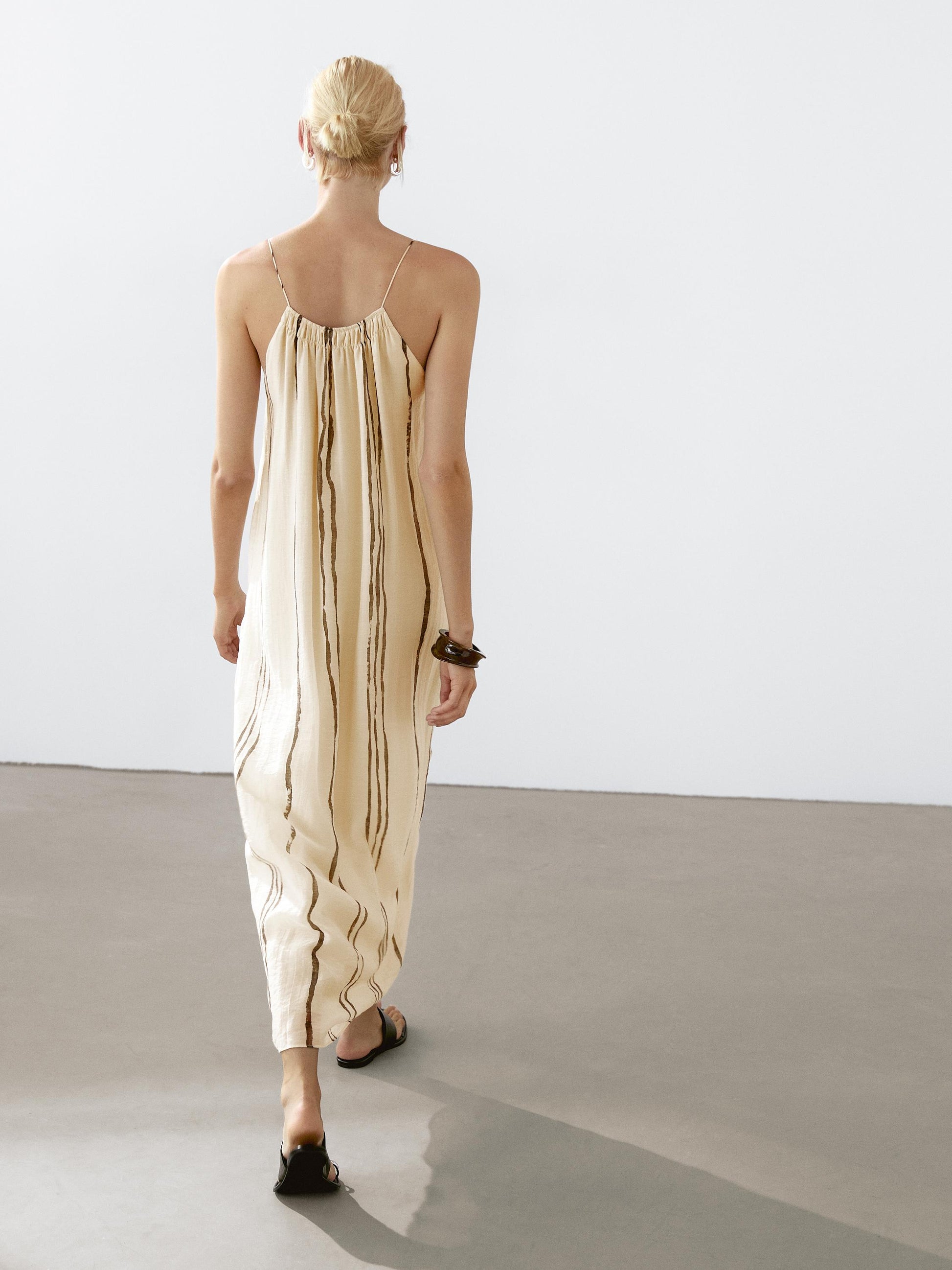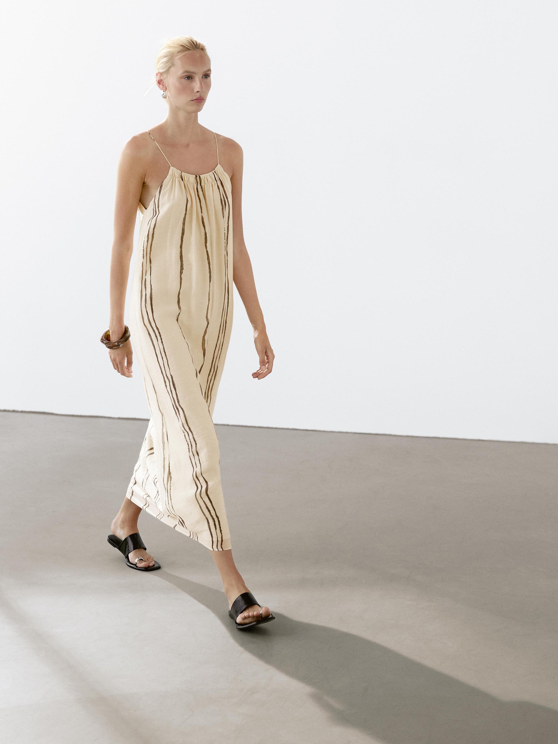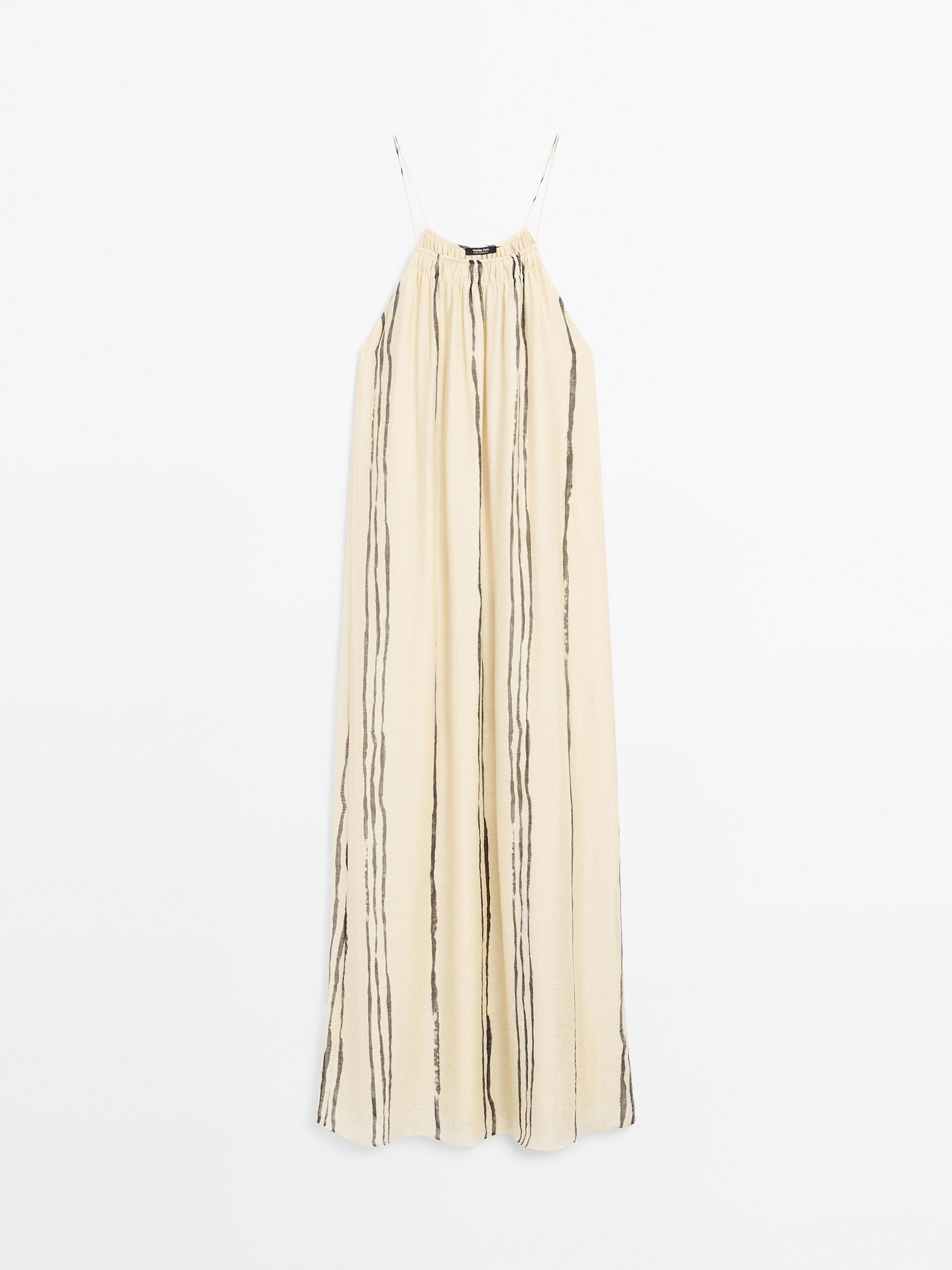 Strappy. Lined. Gathered detail. Striped print.