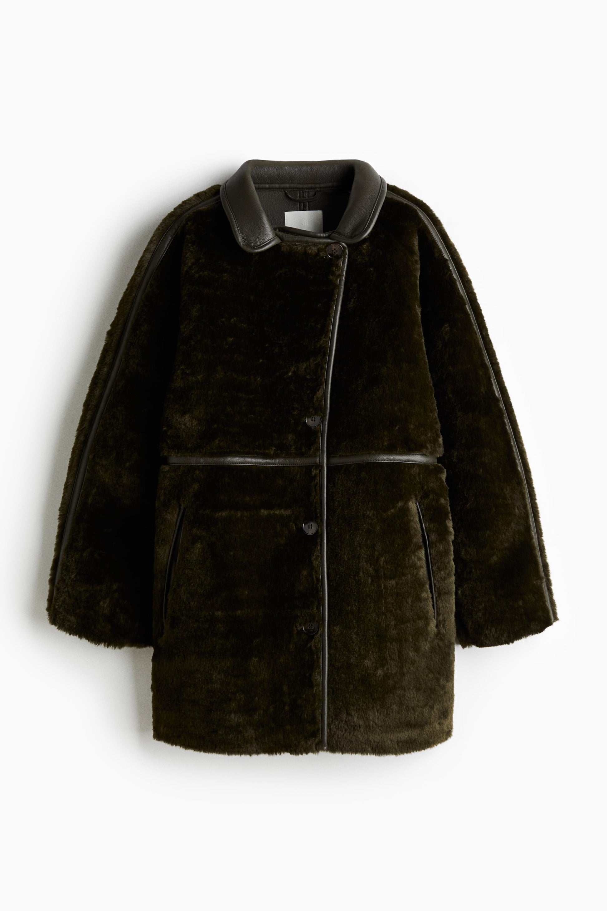 Knee-length, loose-fit coat in fluffy fabric with a collar and trims in coated fabric. Buttons down the front, long raglan sleeves and jetted side pockets.