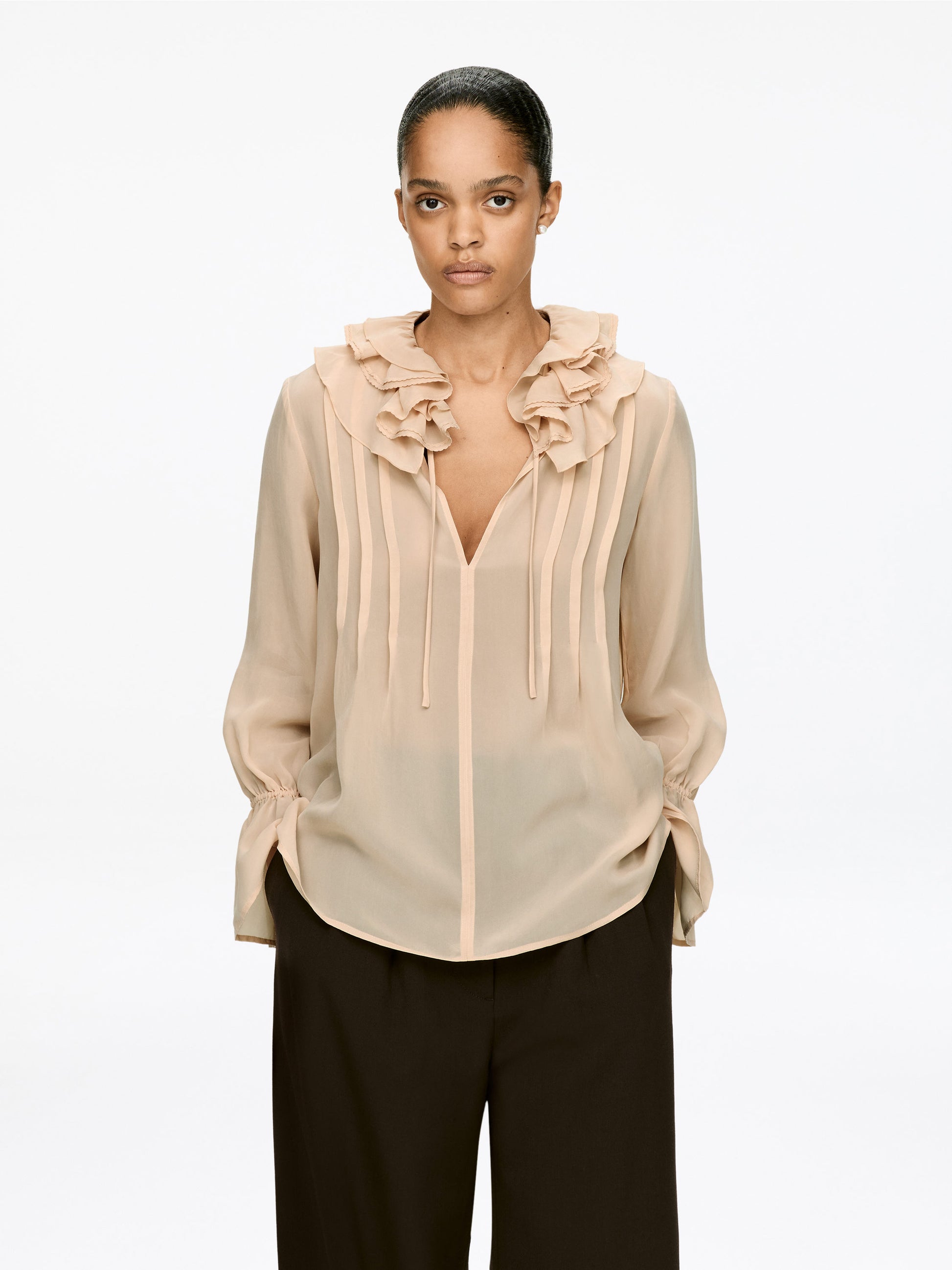 Sheer cupro blouse with a frilled collar and tie bands at the neckline and cuffs.