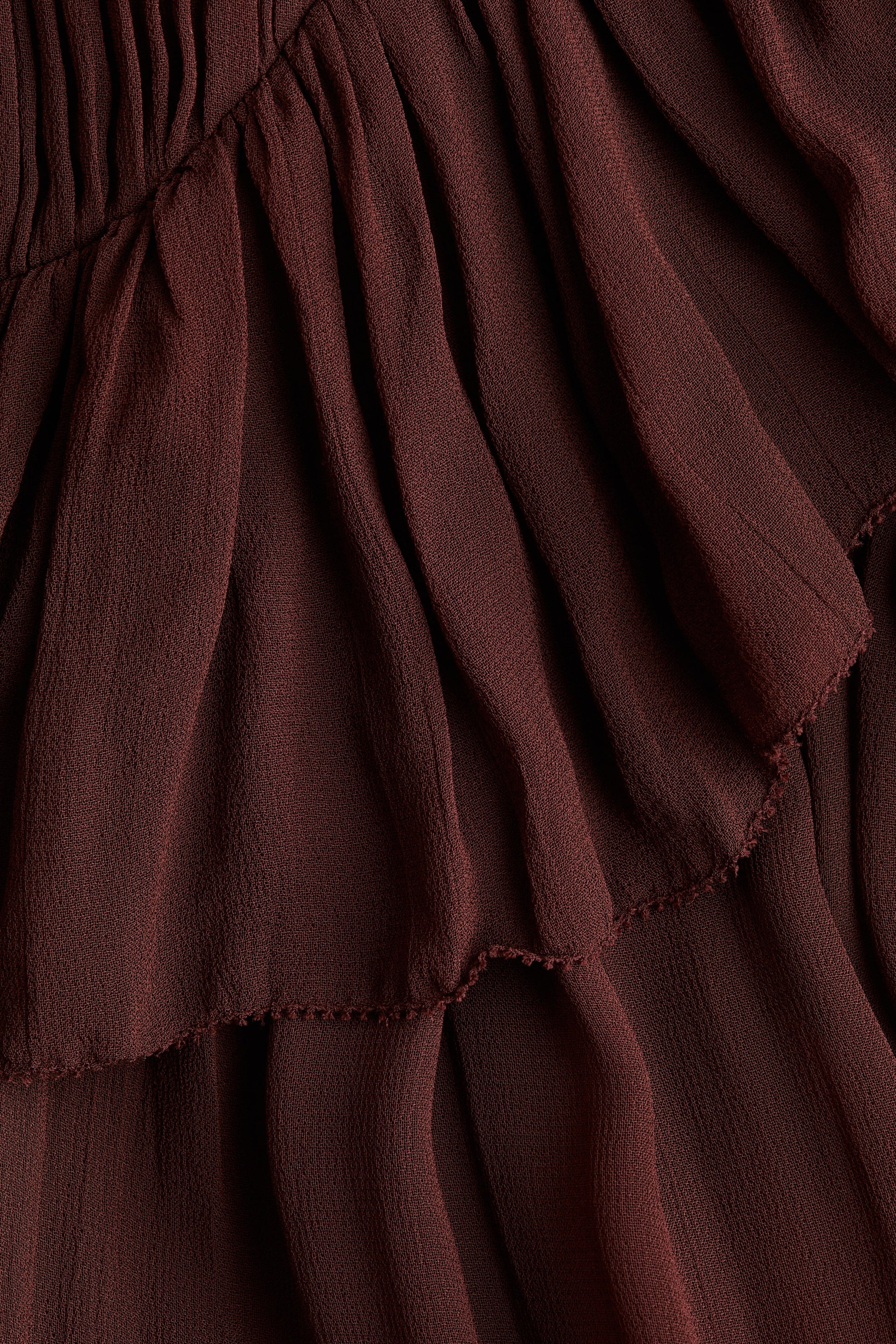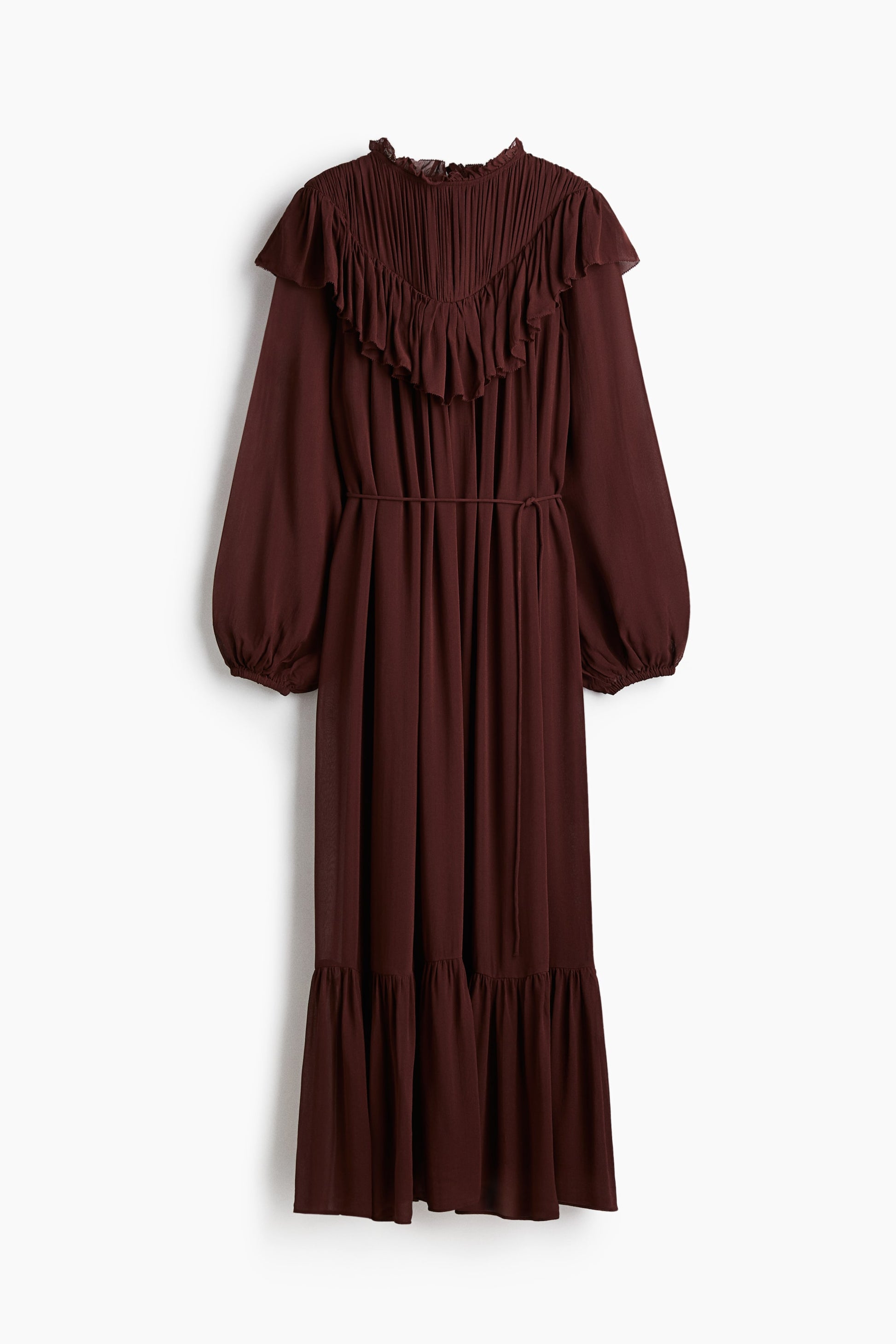 Ankle-length dress in sheer chiffon featuring a frilled collar and a keyhole opening with a button at the back. V-shaped yoke with pleats at the front and a wide frill trim that continues over the shoulders and back. Long balloon sleeves with elasticated cuffs and a spaghetti tie belt at the waist. Flared skirt with a gathered tier for added volume. Underdress with adjustable shoulder straps.