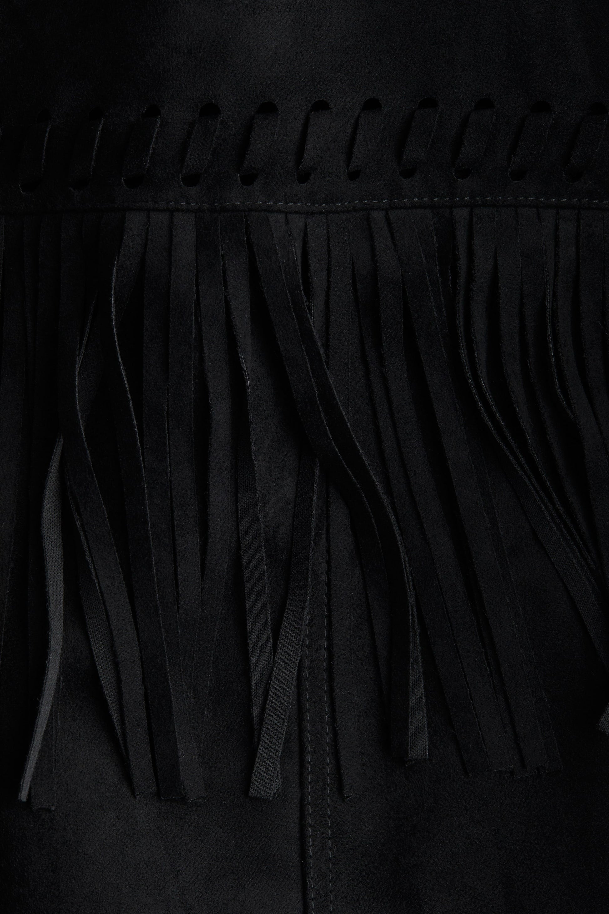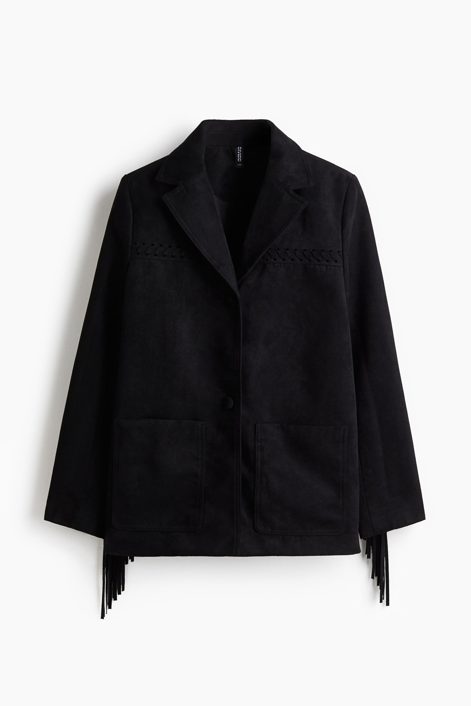 Single-breasted blazer with a soft, napped finish. Notch lapels, two buttons at the front, shoulder pads and a yoke with a stitched detail at the front and back. Patch front pockets and a fringe trim along the back yoke that continues down the back of the sleeves. Lined.