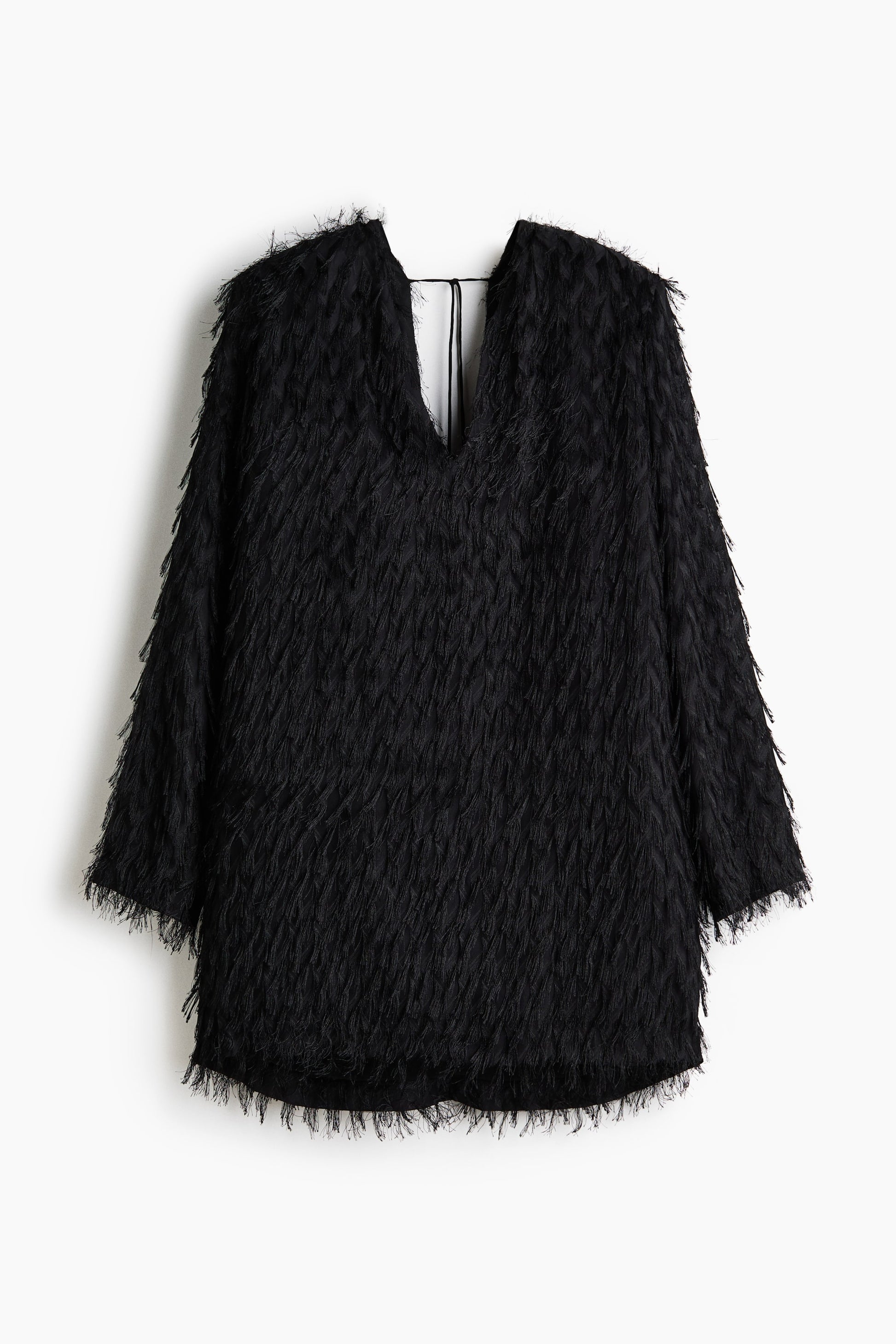 Short dress in woven fabric with feather-look fringes. V-shaped neckline at the front and back and horizontal spaghetti ties at the back of the neck. Shoulder pads for a defined silhouette and long sleeves. Partly lined.