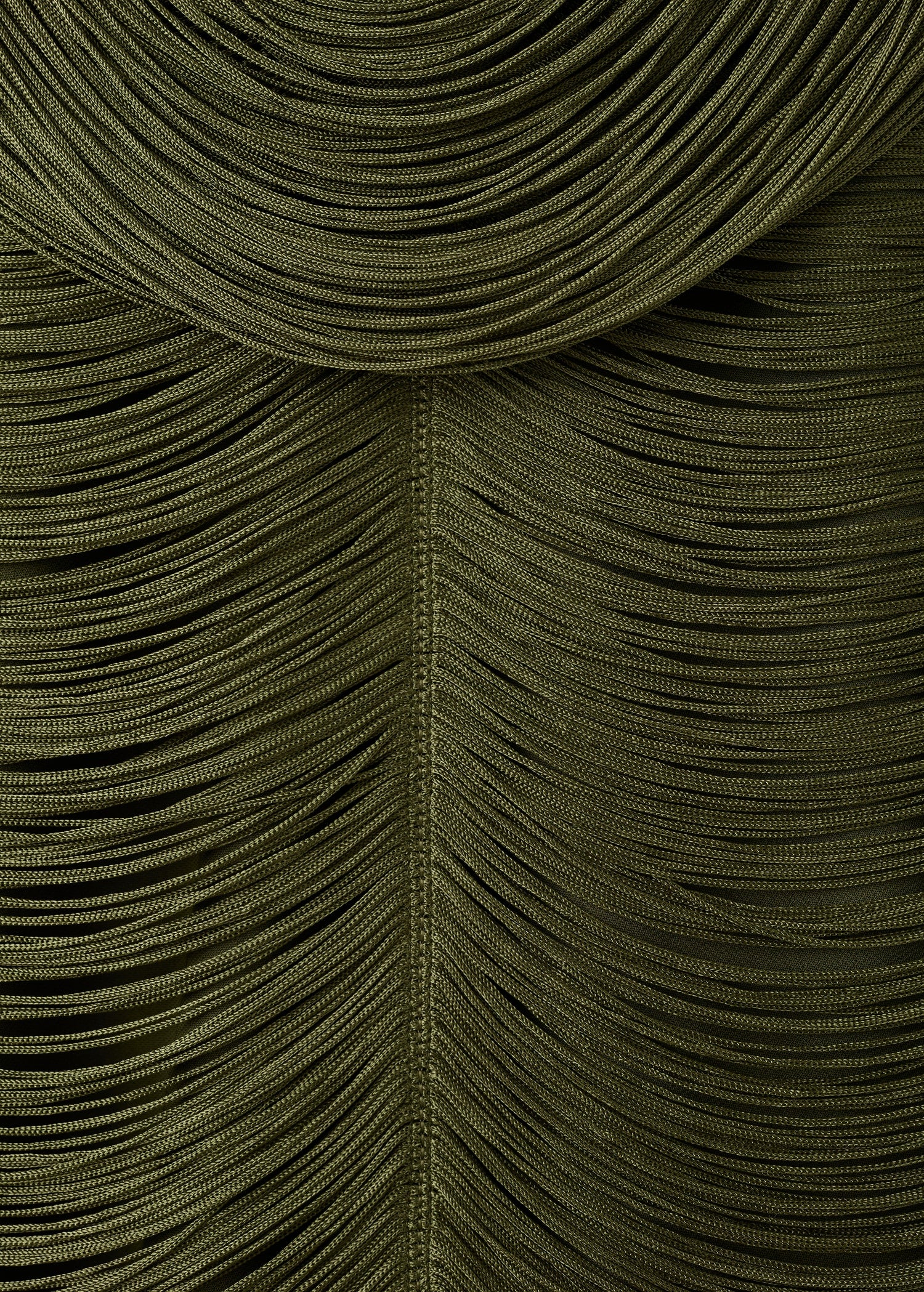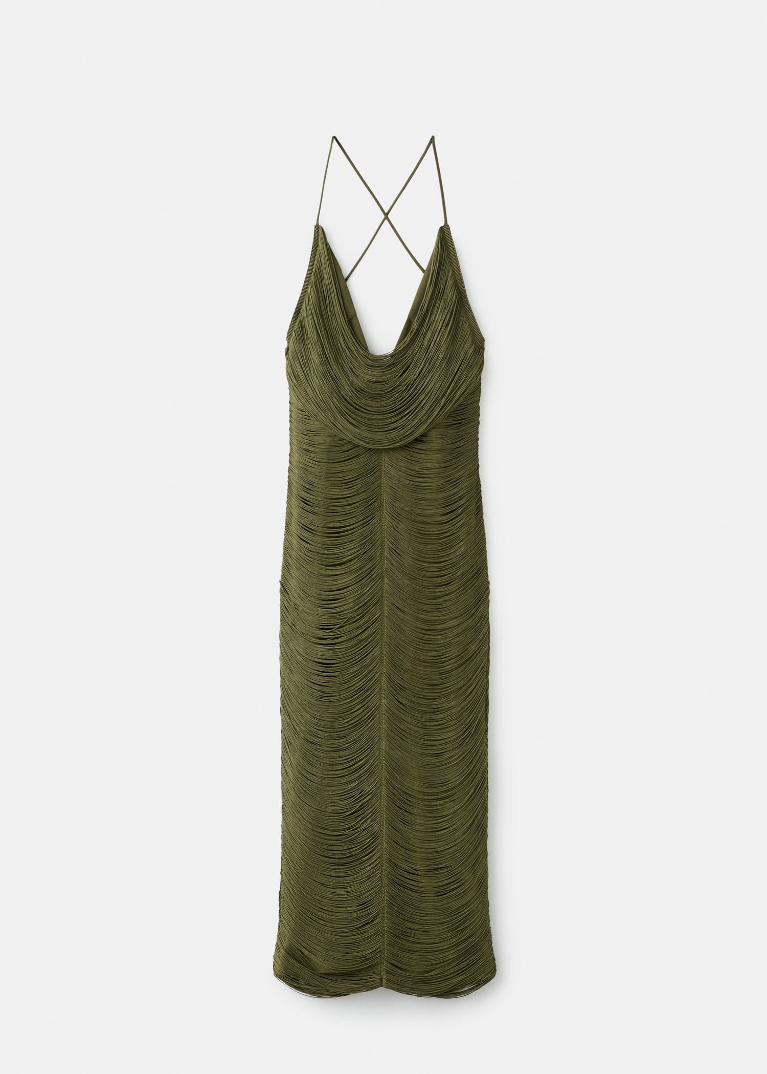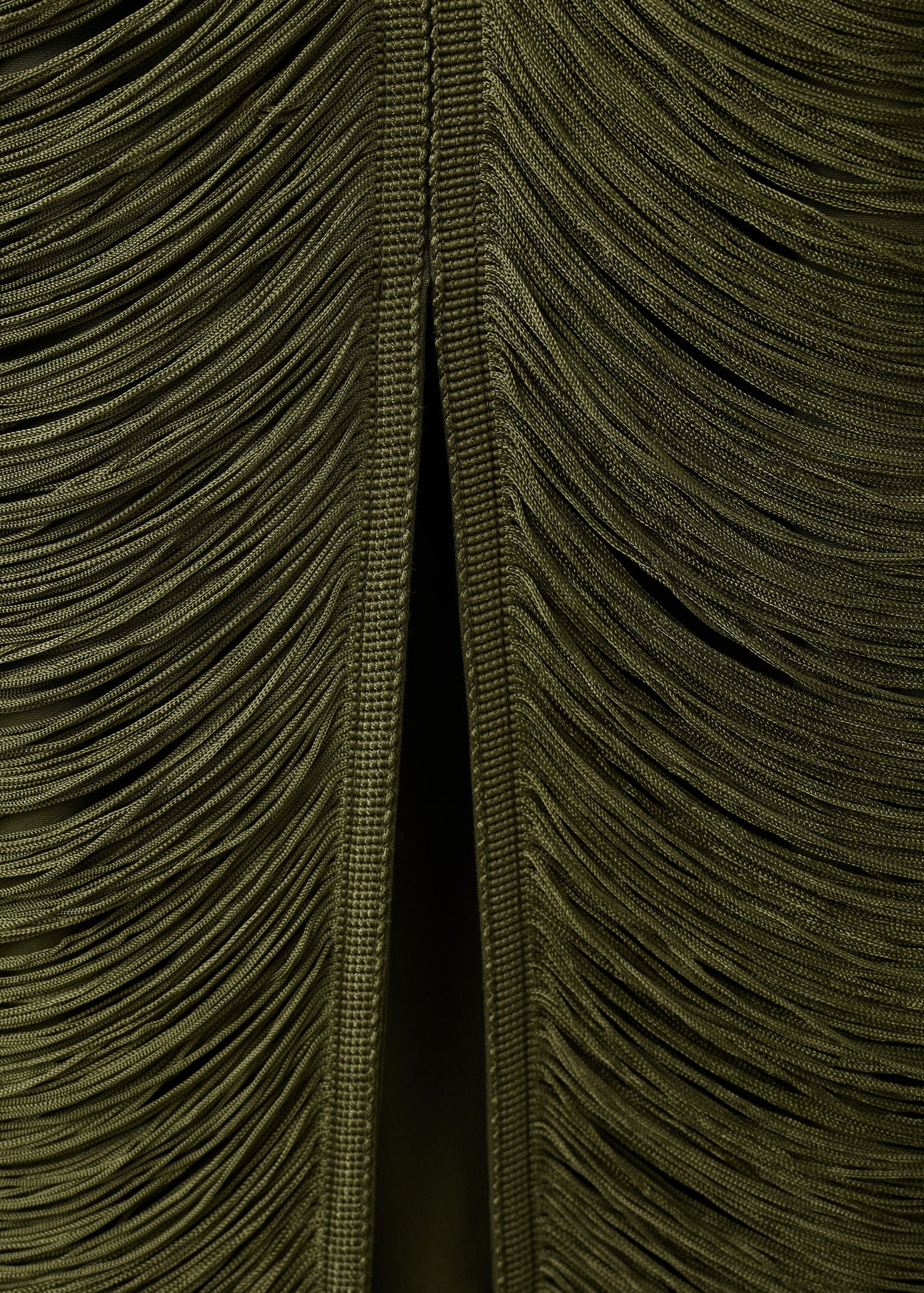 This dress embodies modern elegance with its carefully designed fringes that create a fluid and sophisticated movement. The thin crossed straps at the back offer an elegant design that enhances the structure of the dress, while the deep back neckline adds a touch of refined sensuality.. Fringe design. Fitted design. Midi design. Draped neckline. Sleeveless. Crossover straps on the back. V-neckline in the back. Zip fastening on the back section. Inner lining. This garment is part of our party and event collection, designed to elevate your looks for special occasions. Items from the CAPSULE collection can be exchanged or returned within 14 days from the date of shipment.