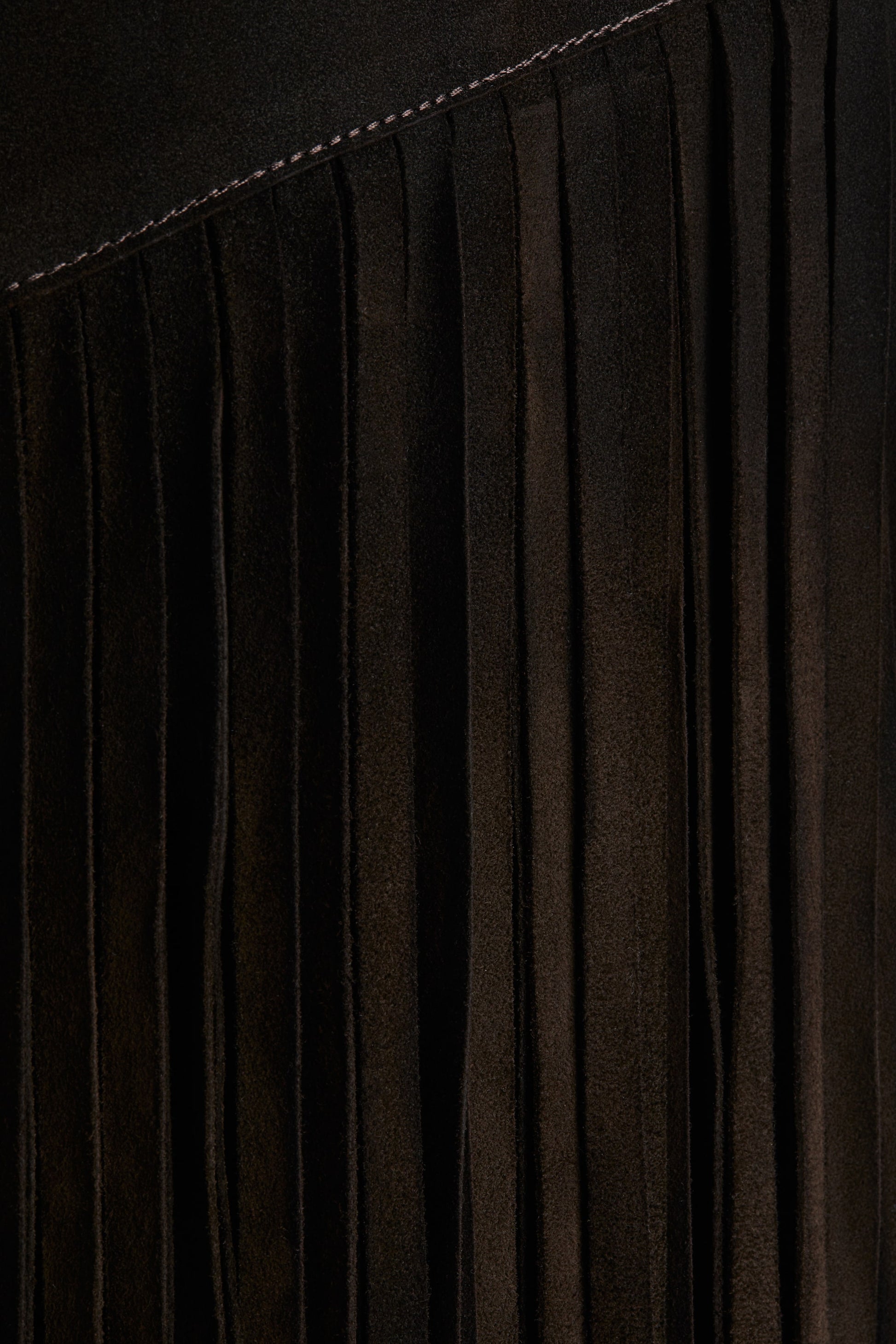 Long, fitted skirt crafted from soft suede highlighted by a diagonal cut from the thigh to the knee with three layers of long, laser-cut fringes. Double-layered waistband with a concealed zip and button at the back. The zip pull is engraved with the designers logo. Viscose twill lining.