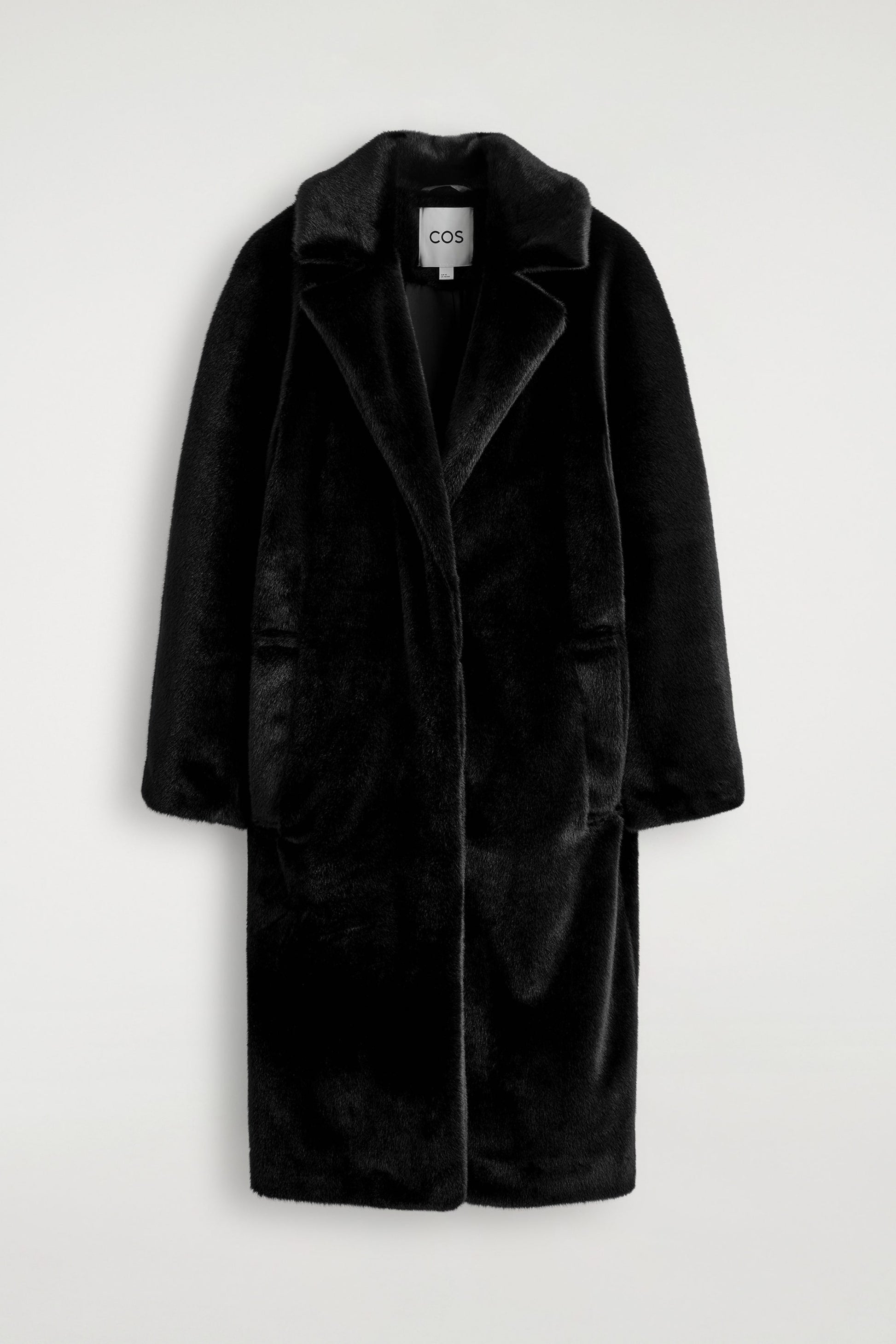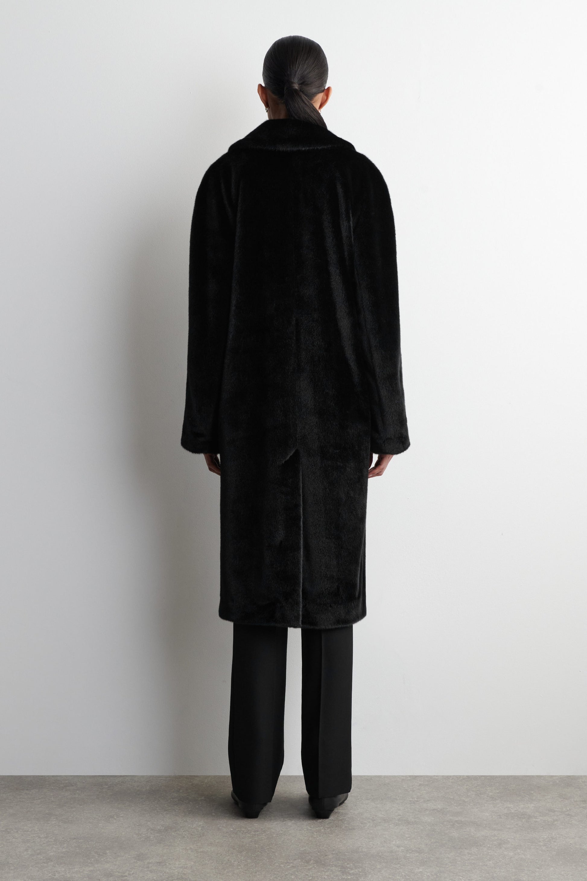 Distinctive textures charge this season's outerwear collection with a rich tactility. This longline coat is crafted from softly brushed fur-effect material in a midnight-black hue and shaped in a single-breasted silhouette with notch lapels and welt pockets. Style it as the centre piece of a tonal look.