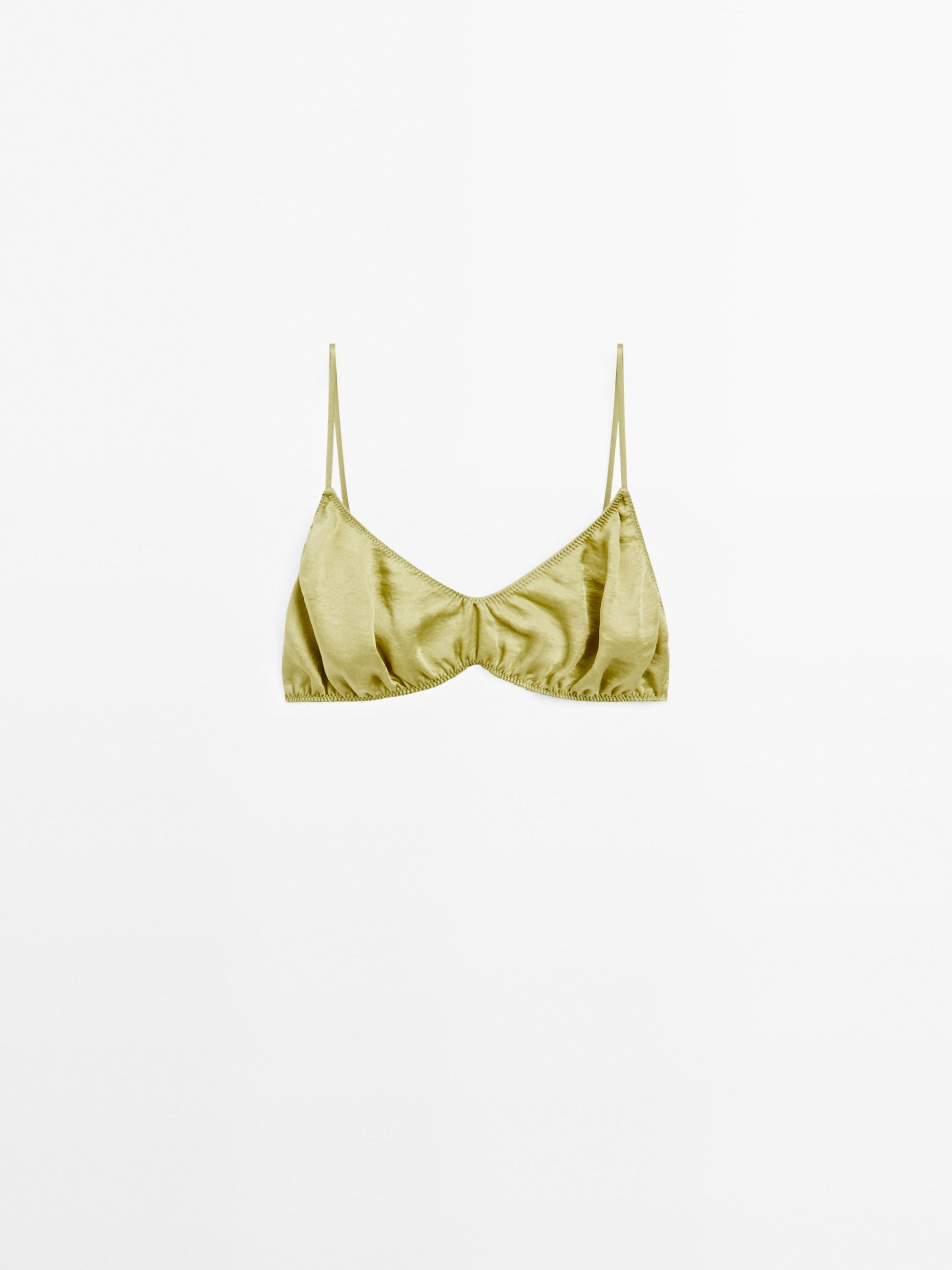 Triangle bra with elastic on the edge for a gathered effect. Adjustable straps. Back fastening. Satin finish.