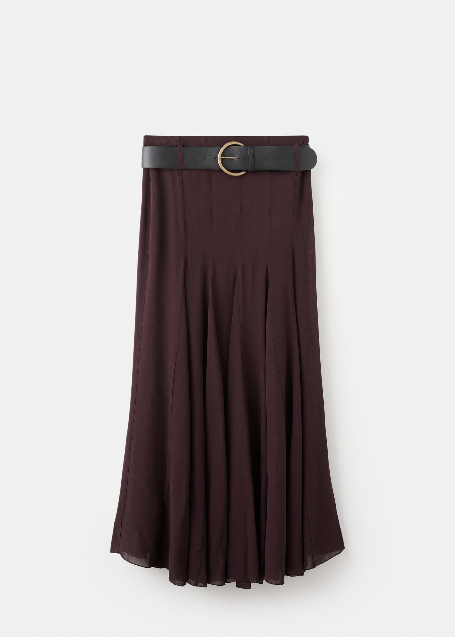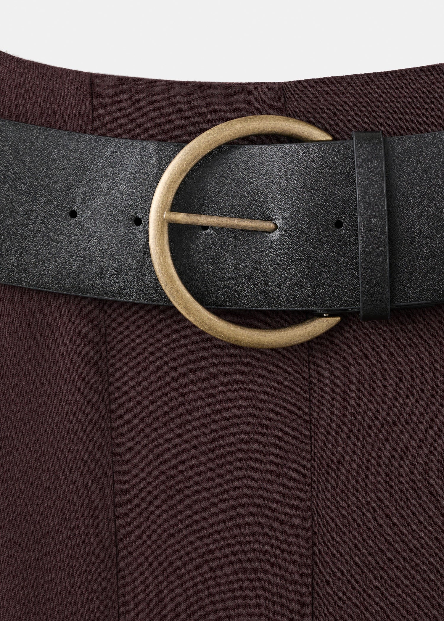 With a long design and a mid-rise, this garment features belt loops and a buckle fastening belt. It has godet details and a side zip fastening. It includes an inner lining for enhanced comfort