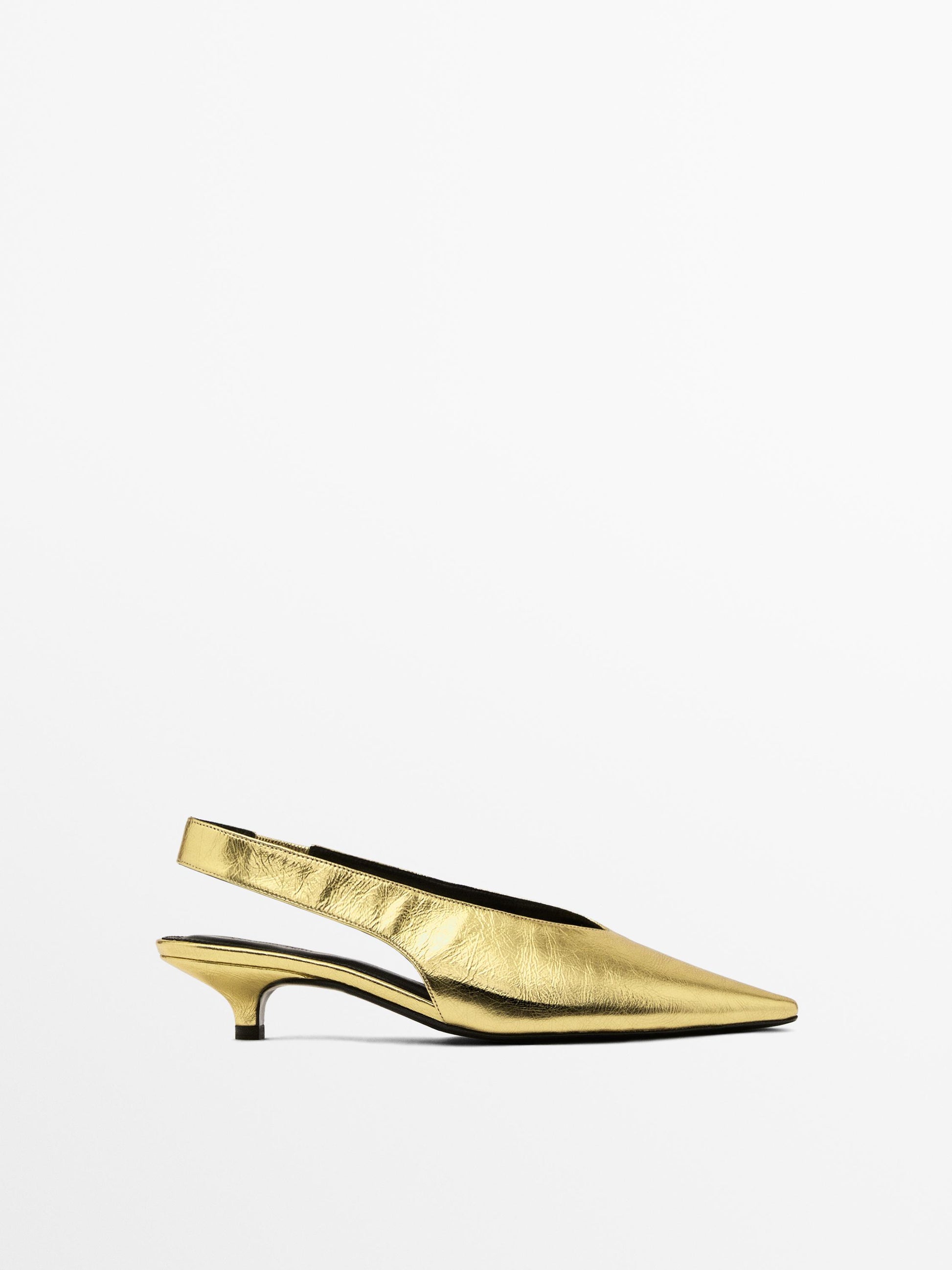 Made of sheepskin with a crackled finish. Leather with a nappa finish. Elastic strap detail. Kitten heel. Heel 3,5cm.