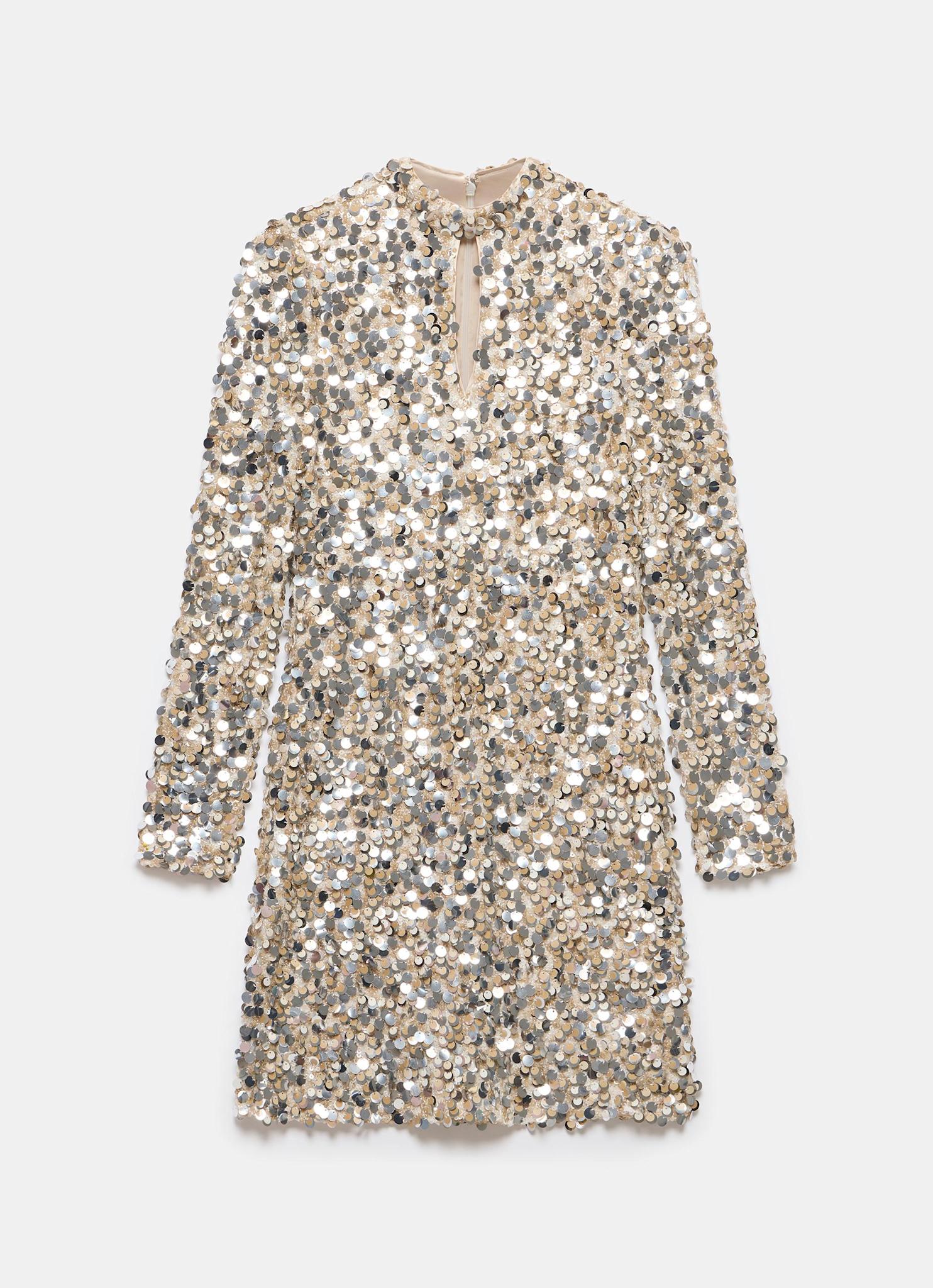 - Gold tone sequin dress in a mini silhouette featuring a high neckline, keyhole detail, long sleeves with a zip fastening through the back.