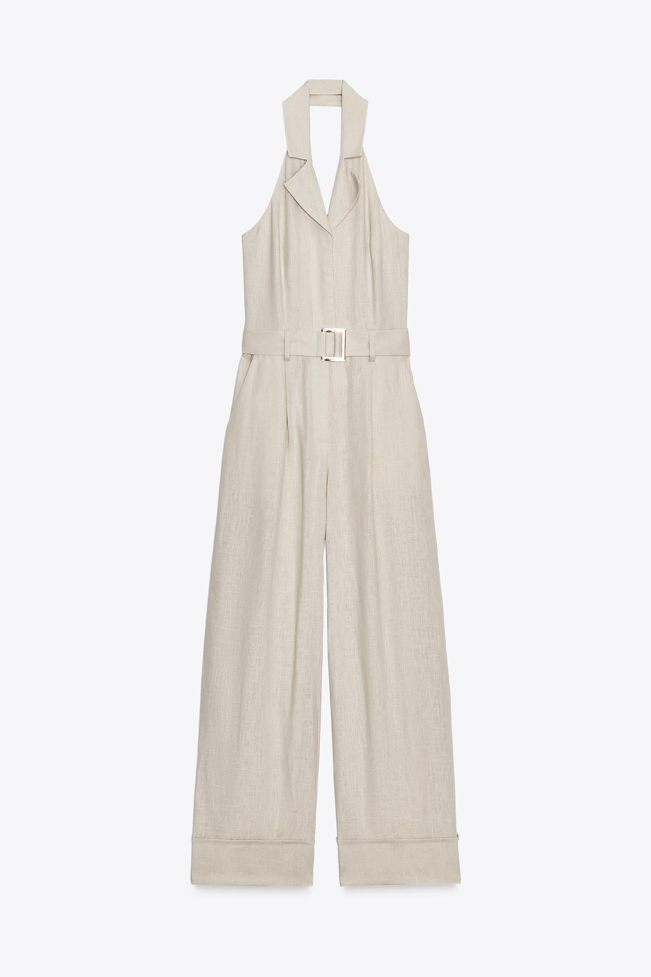 Jumpsuit crafted in a linen blend. Halter neck with V-neck and open back. Matching fabric belt detail. Front pockets and mock welt pockets at the back. Wide leg with turn-up hem. Front fastening with zip, hooks and hidden buttons.
