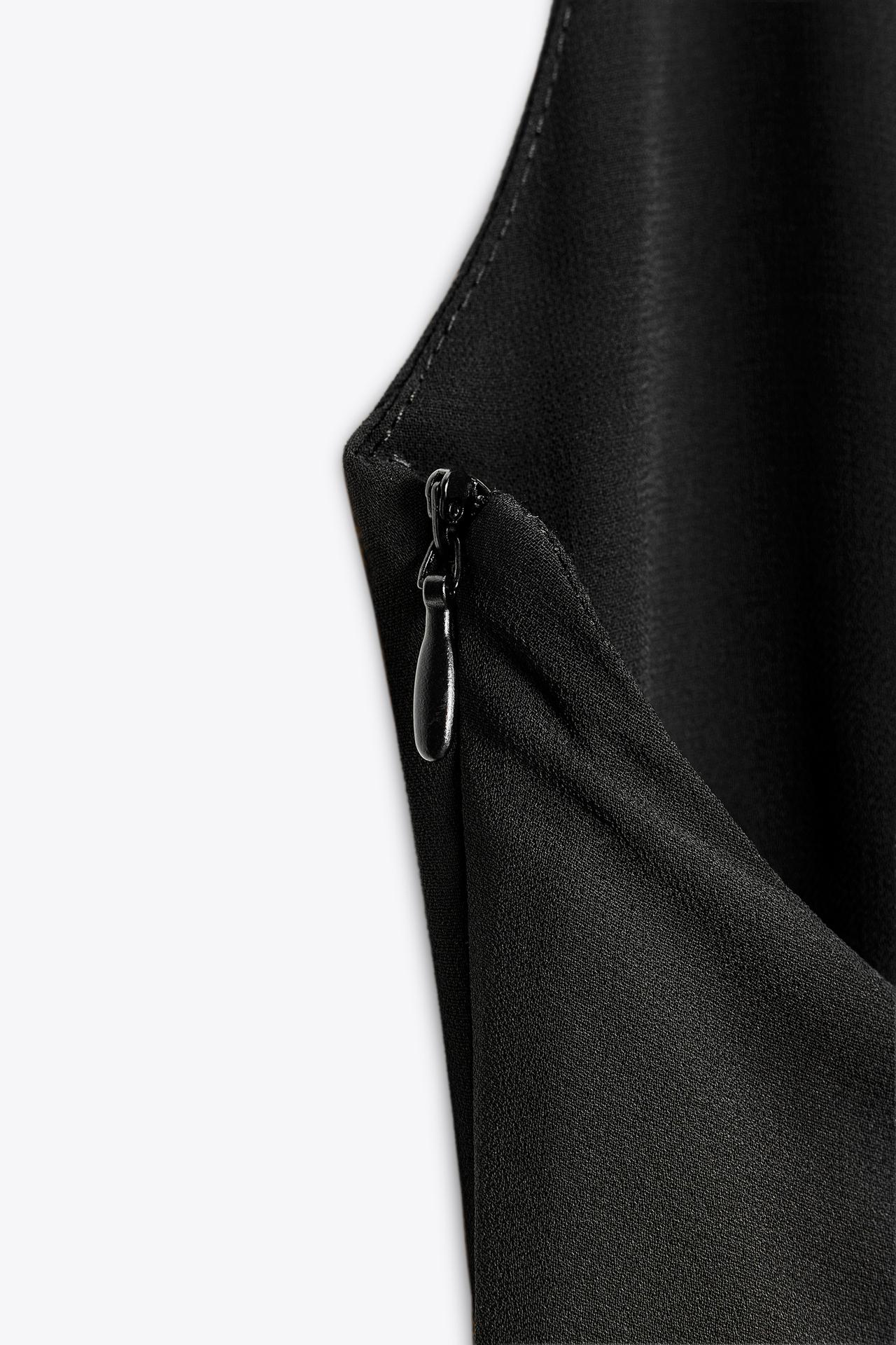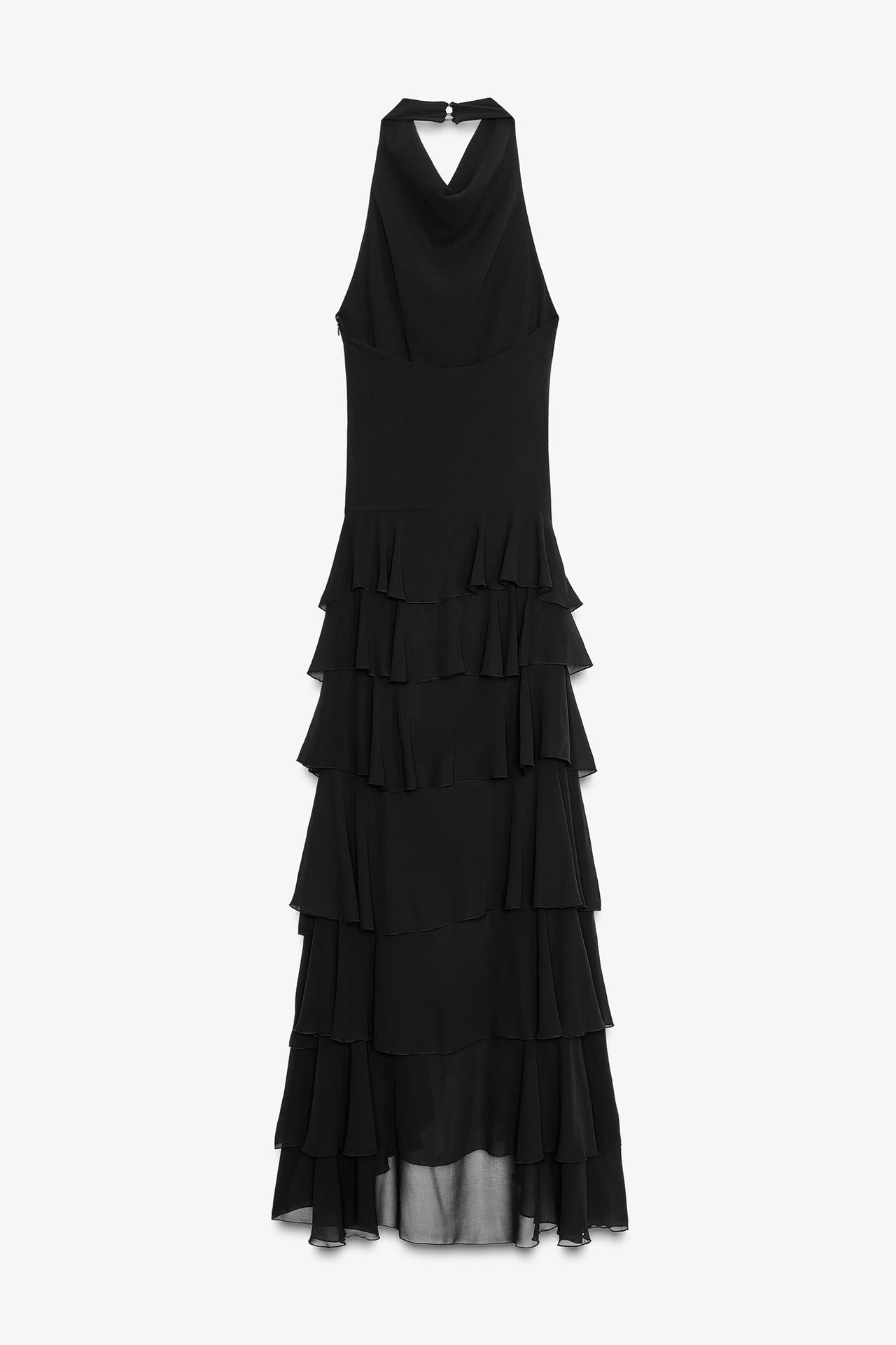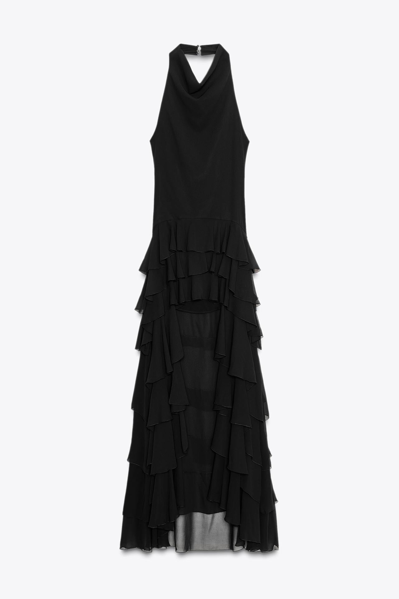 Halter neck long dress with buttons. Ruffle detail. Inner lining. Asymmetric hem. Side zip fastening concealed in the seam.