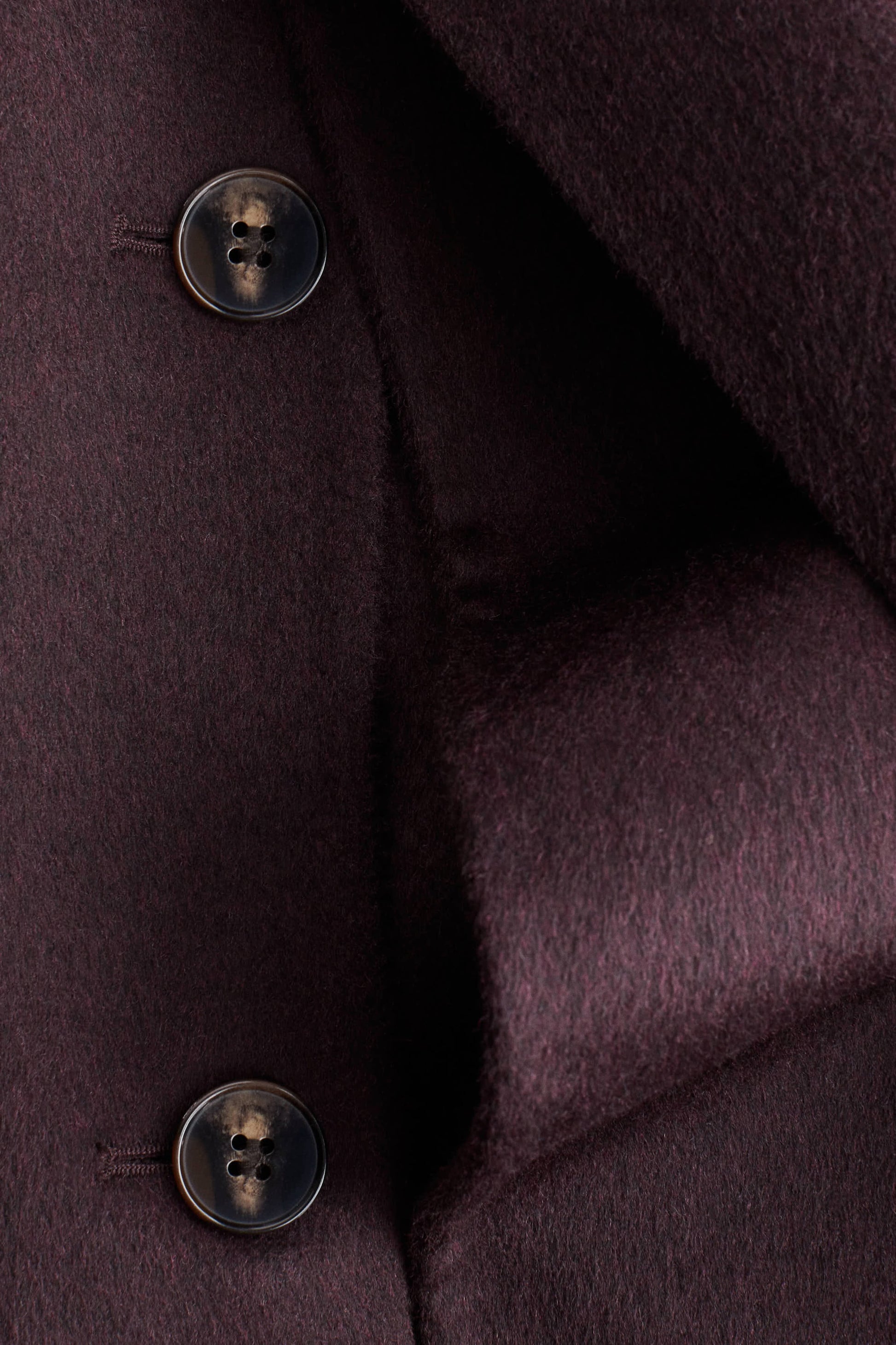 Coat in a felted wool blend with a detachable scarf for various styling options. Round neckline, buttons down the front, jetted side pockets and low dropped shoulders. Unlined.
