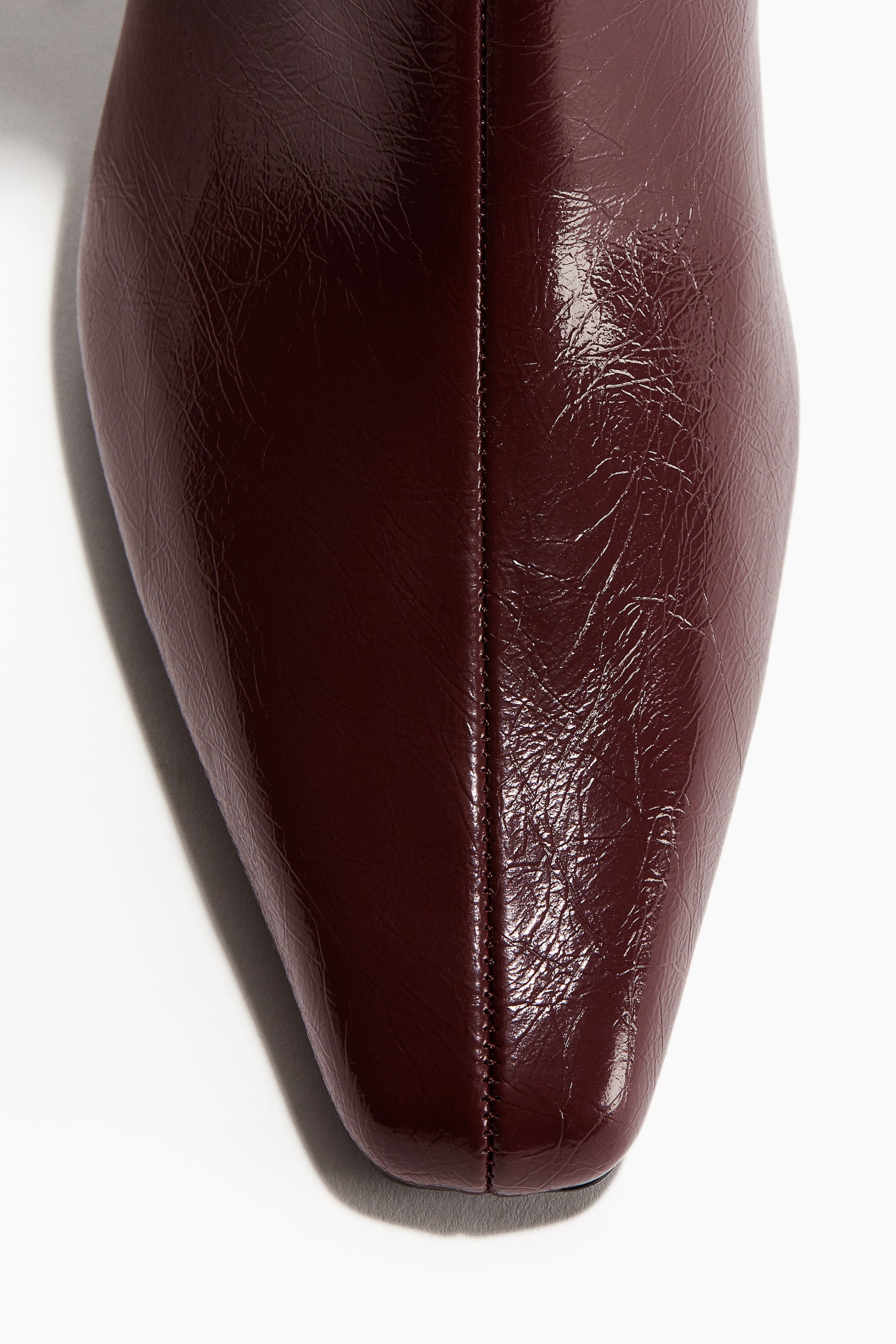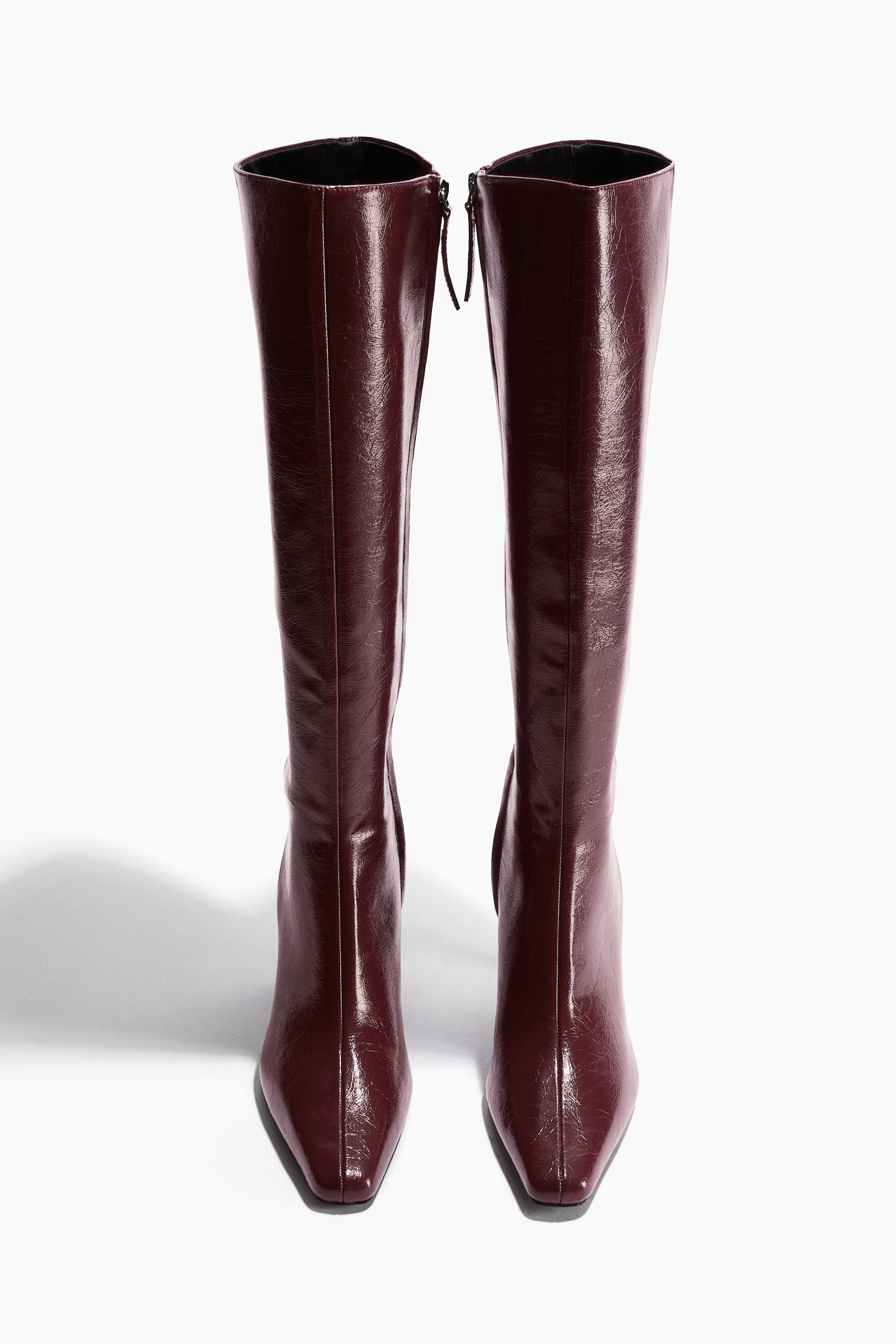 Boots with chisel toes, narrow, covered heels and knee-high shafts with a concealed zip at one side. Satin linings.