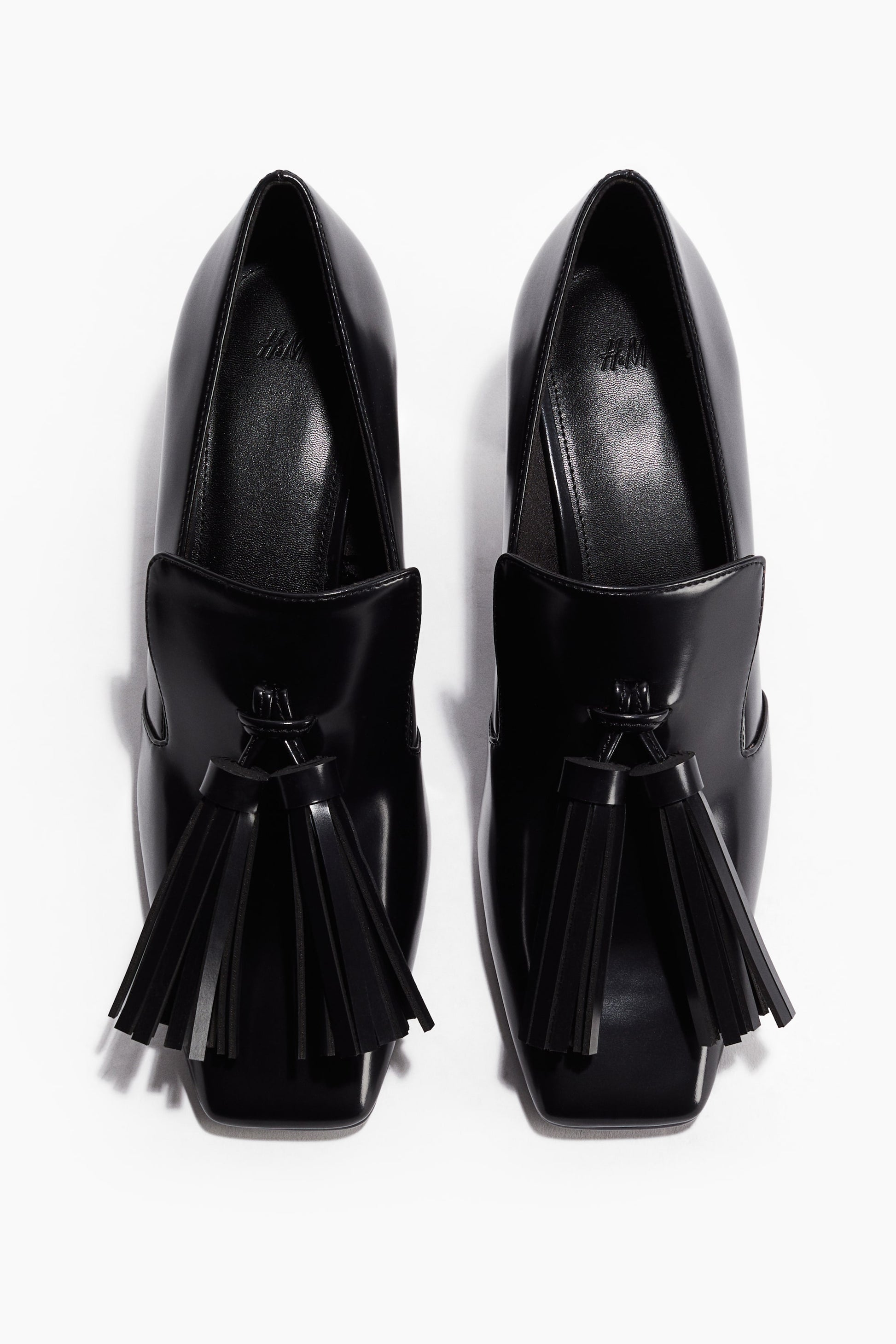 Heeled loafers in coated fabric with square toes and tassels at the front. Satin linings.