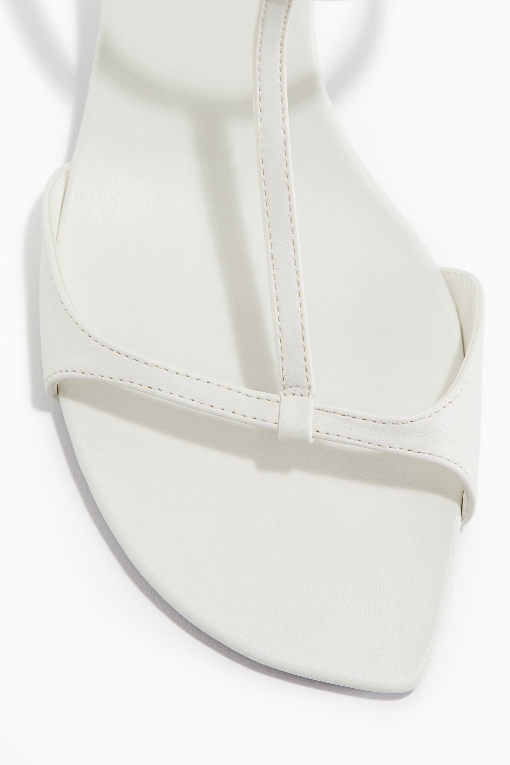 Sandals with a classic T-strap design featuring curved toes and kitten heels.