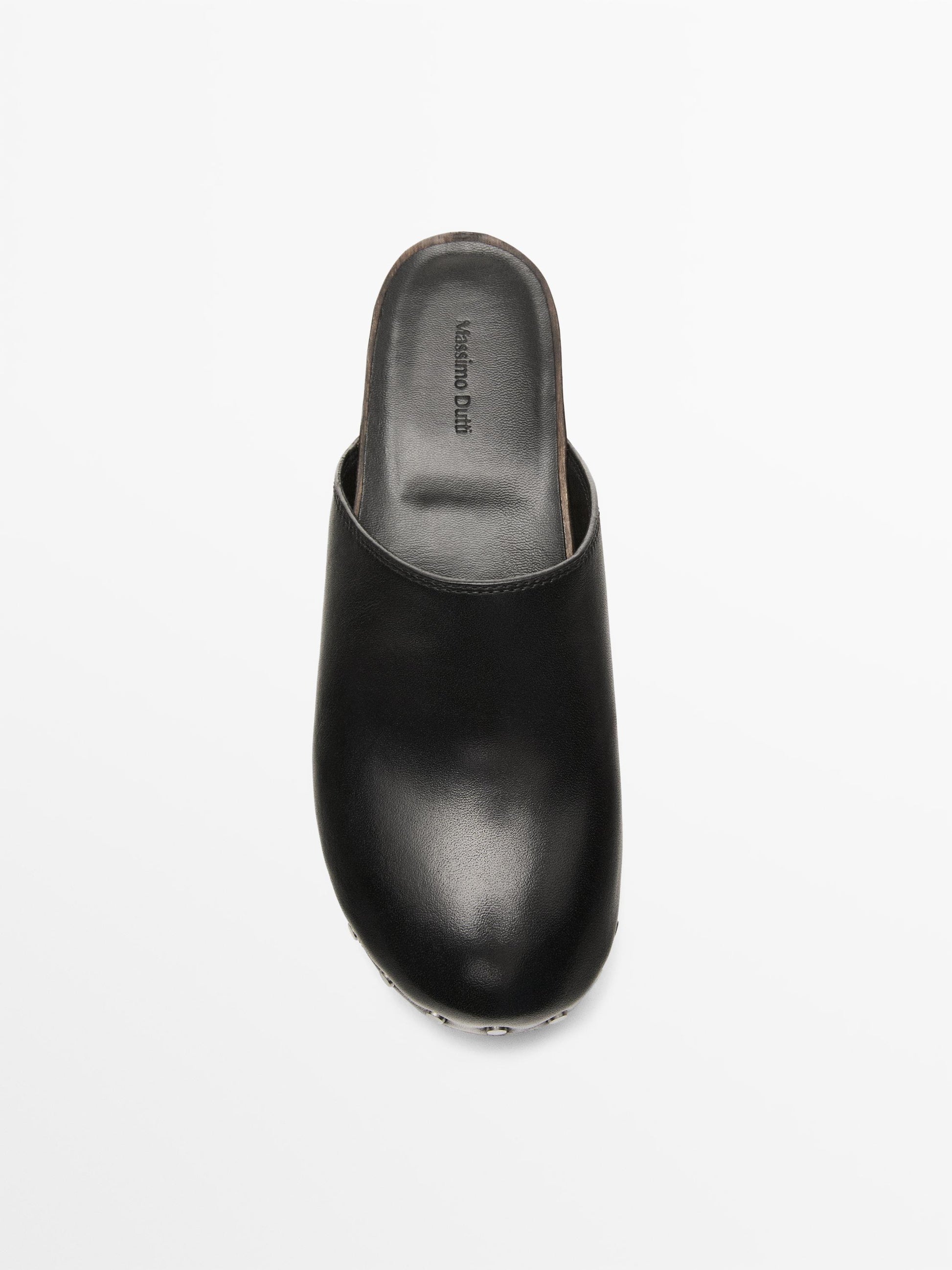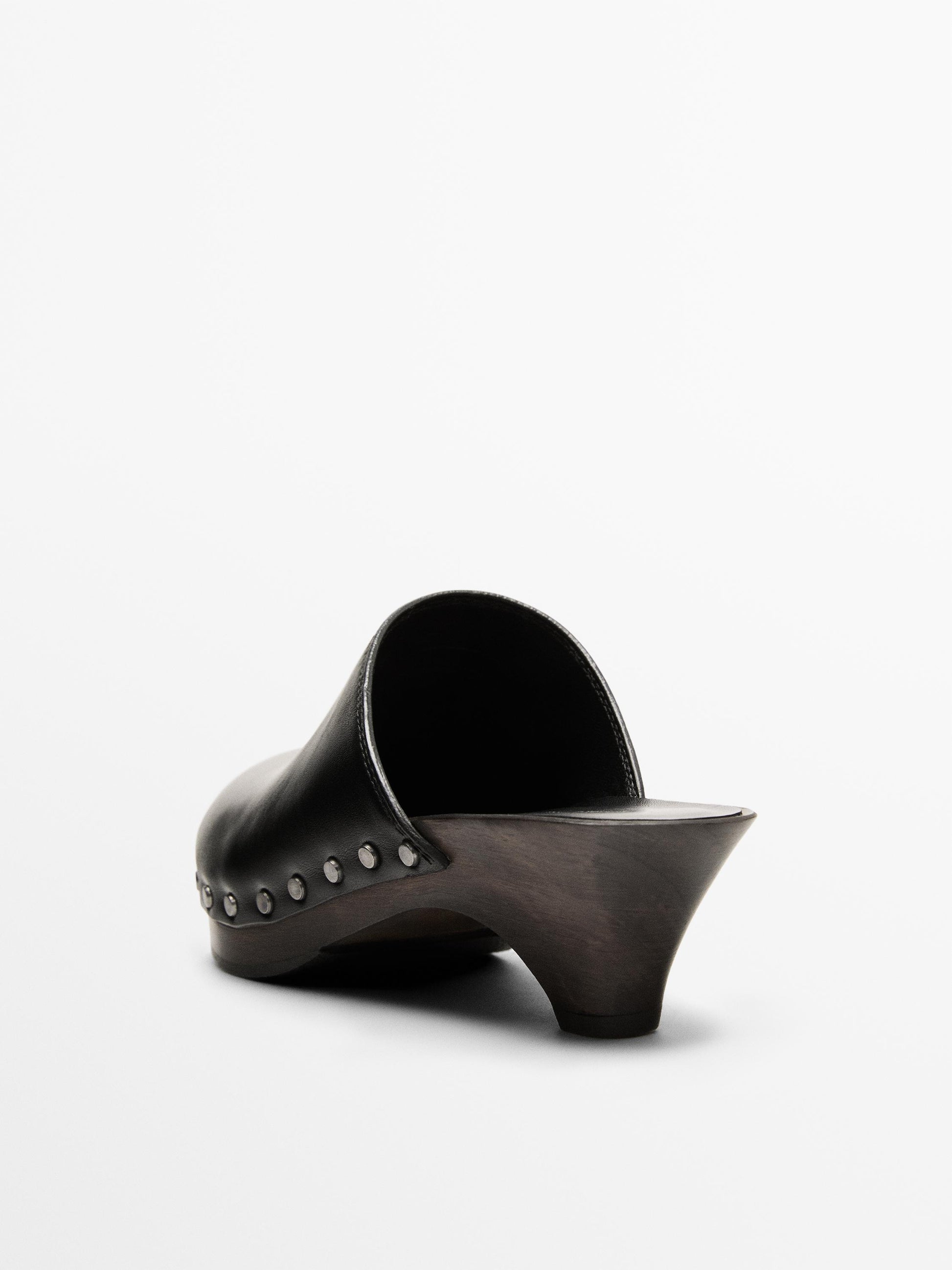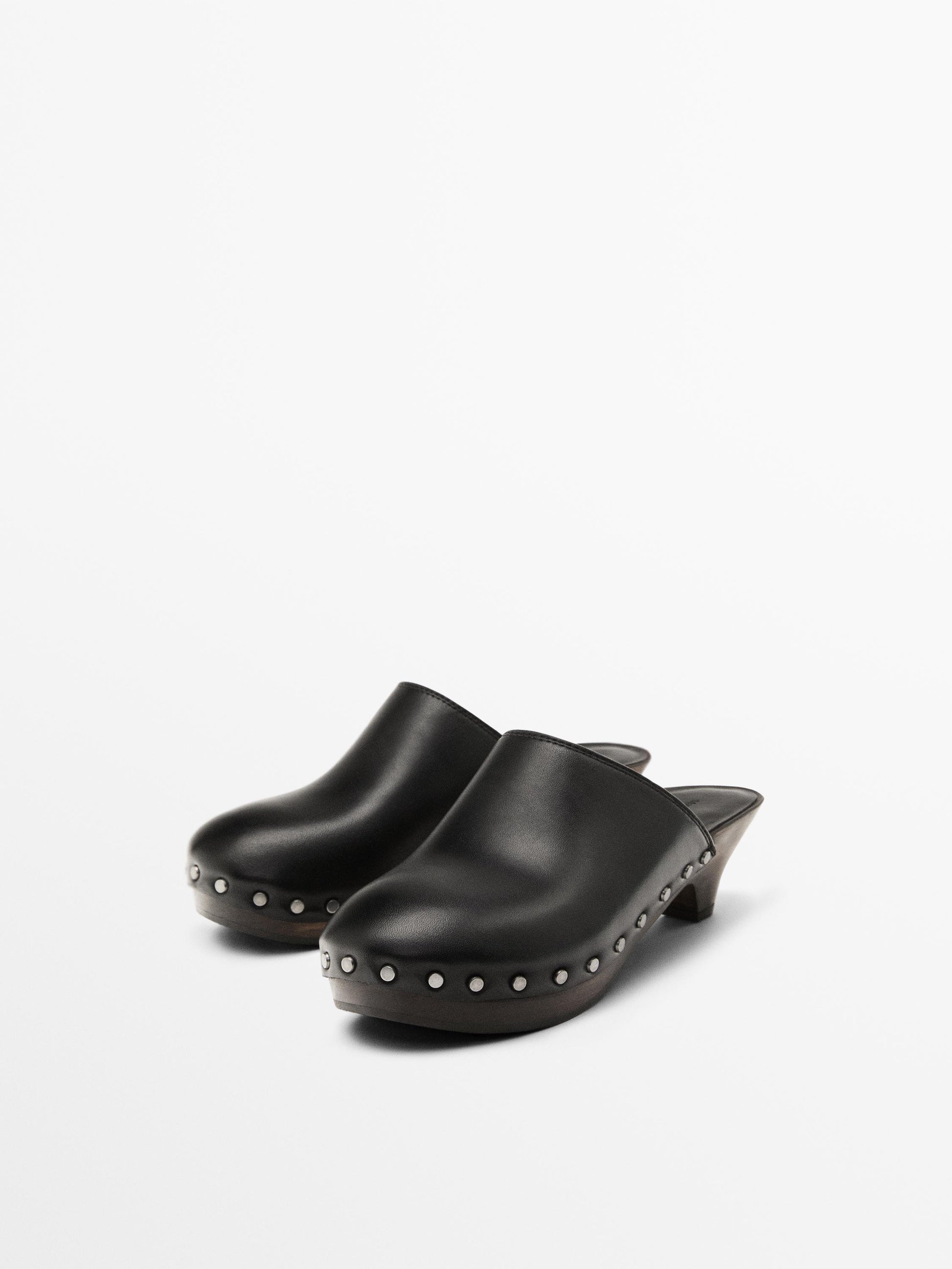 Made of cowhide leather. Embossed logo on the sole. Silver-plated studs along the vamp. Wooden clogs with rubber sole. Leather lining. Heel 5cm.