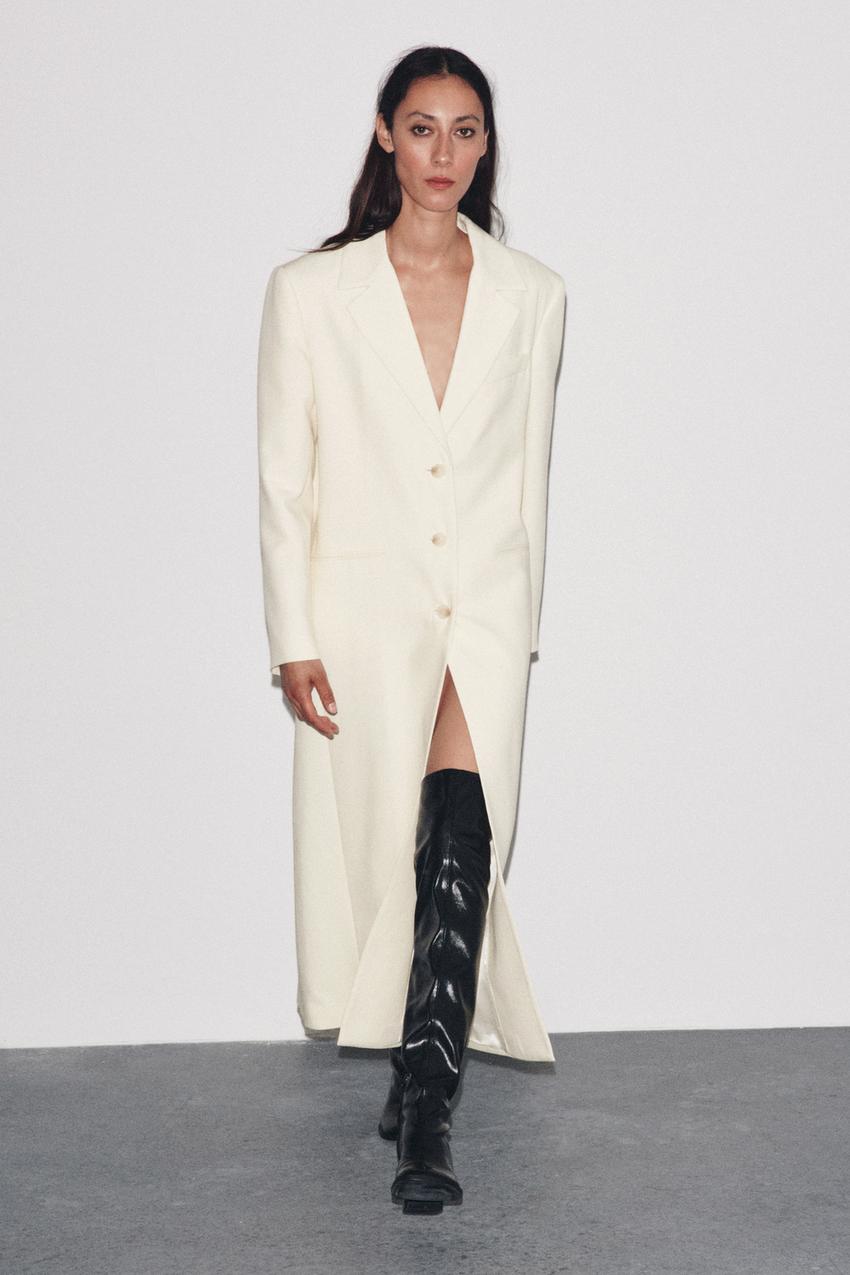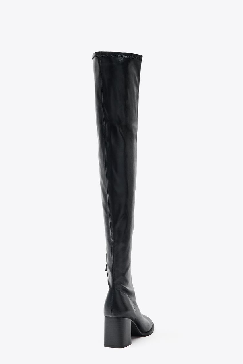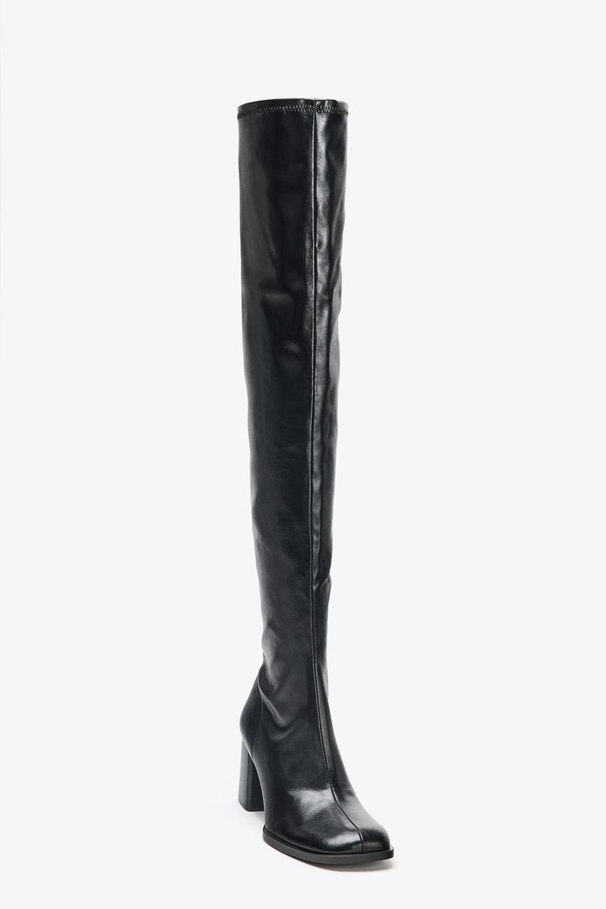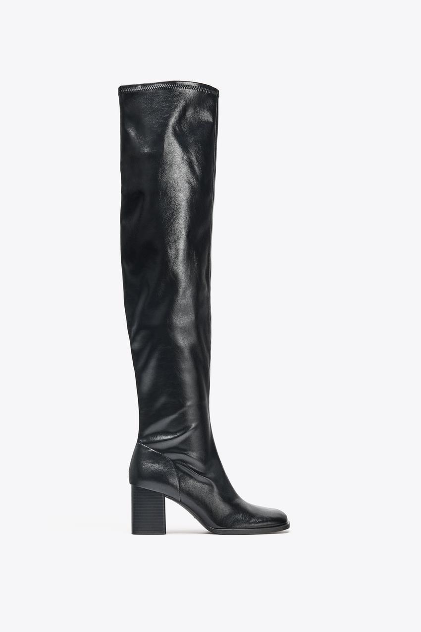 Patent-effect heeled boot shoes. Extra-long leg. Topstitching detail on the front. Block heel. Zip fastening. Square toe.
