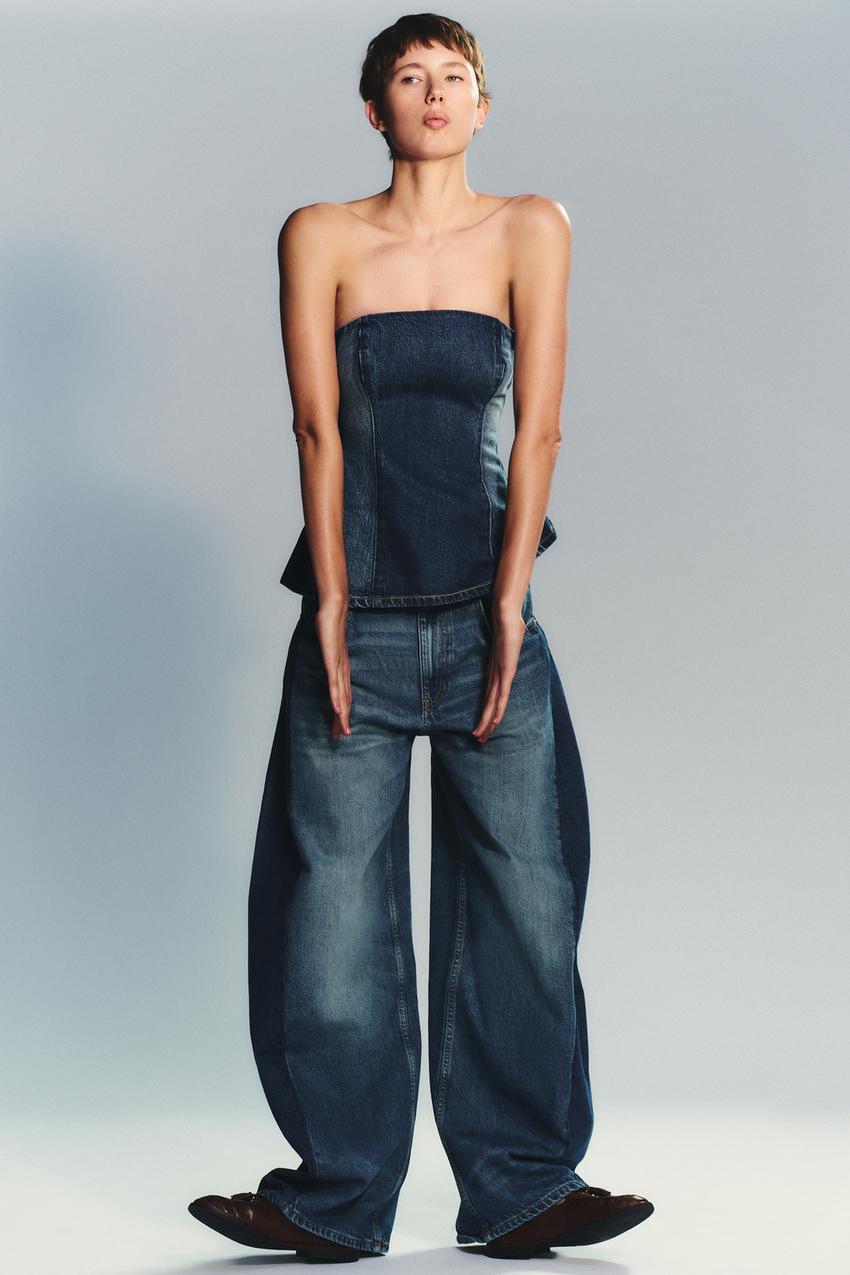 High-waist, five-pocket jeans. Front zip and metal button fastening.