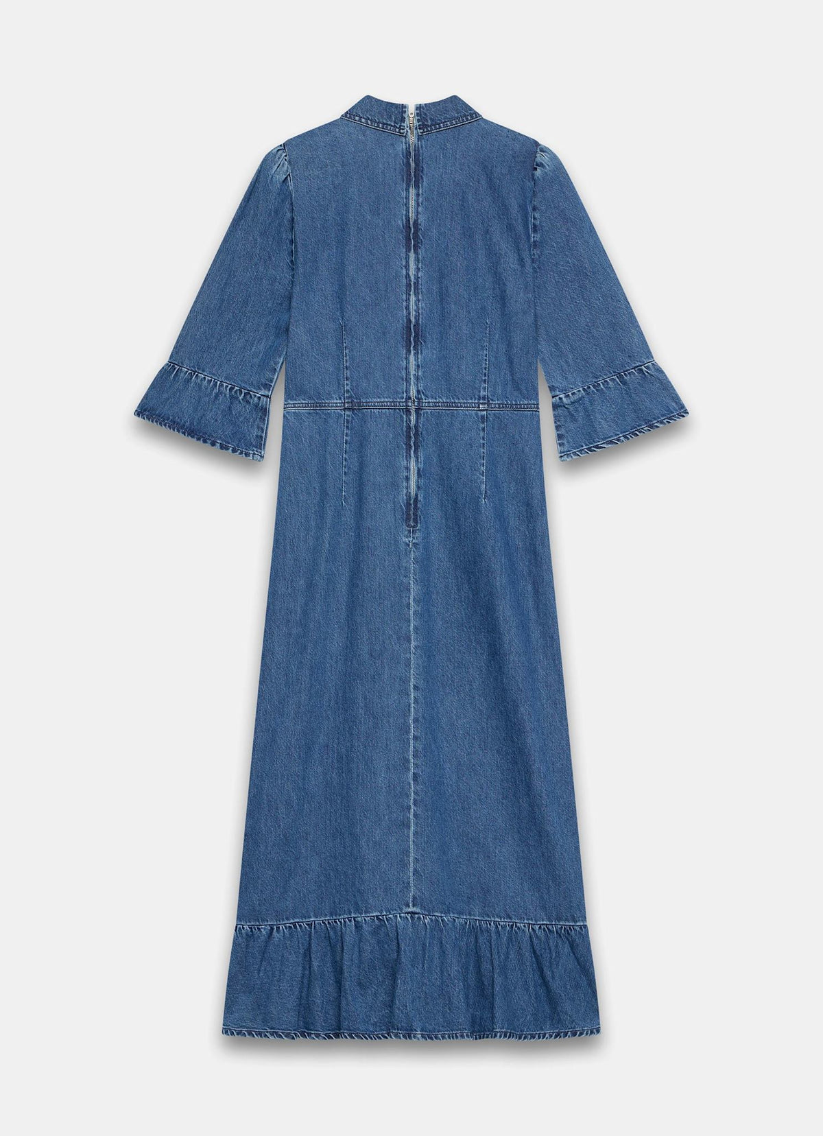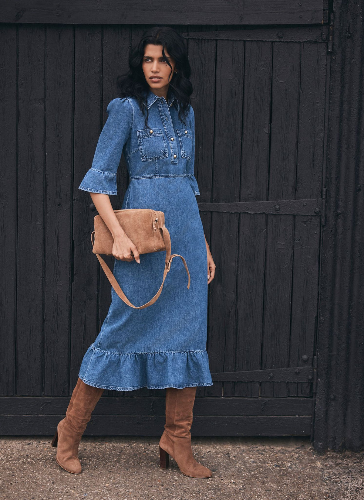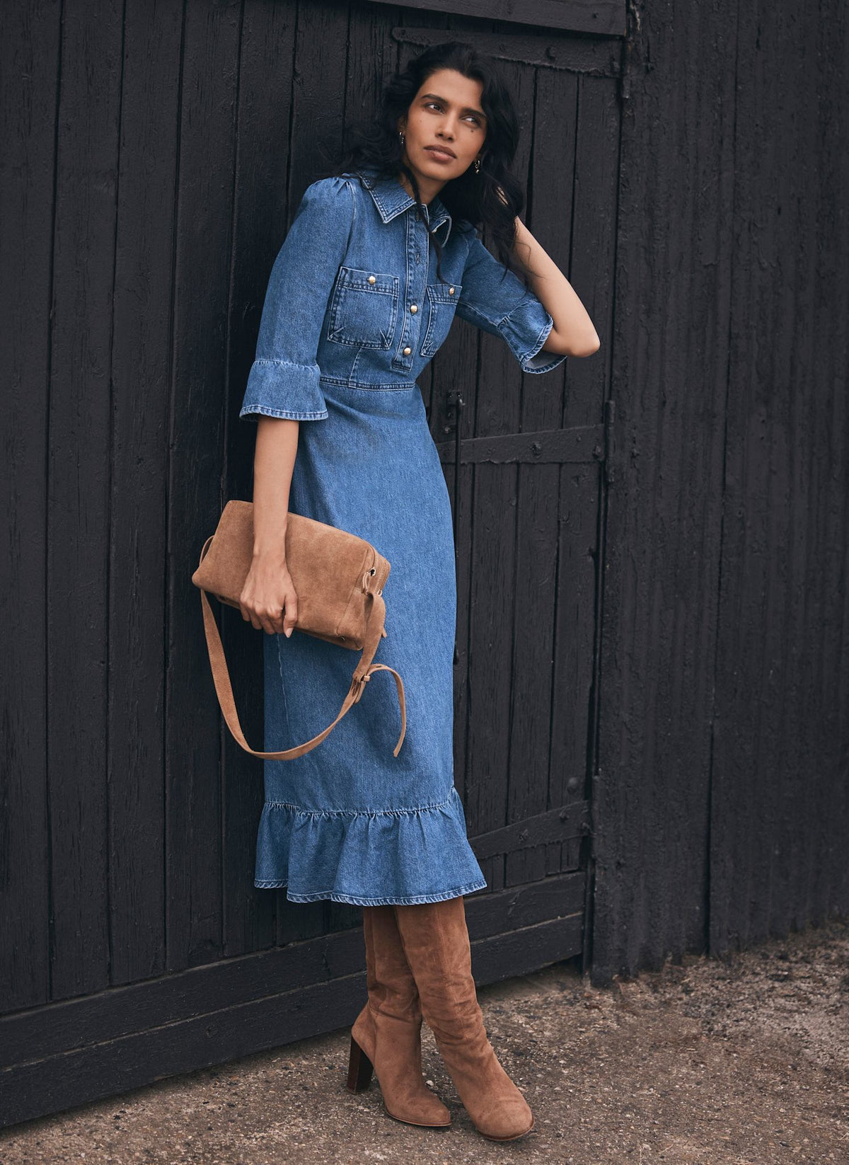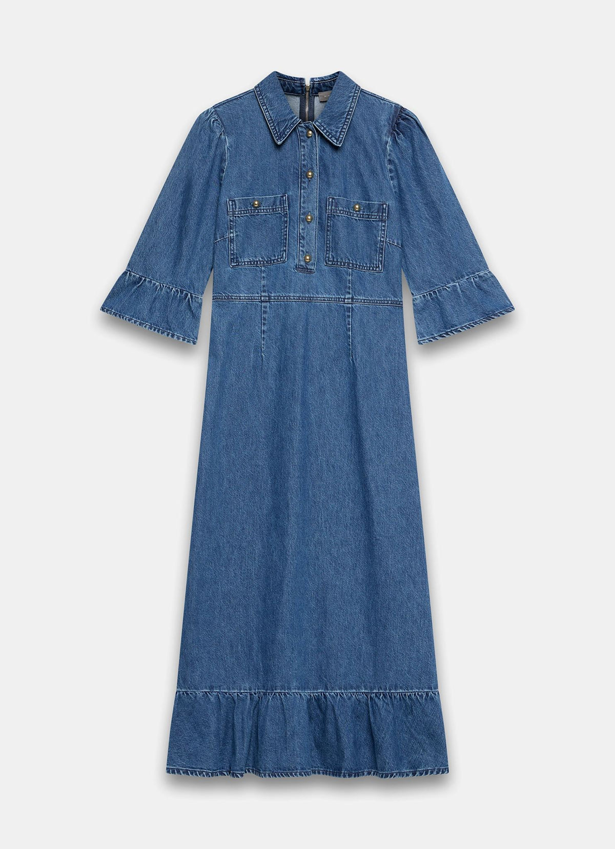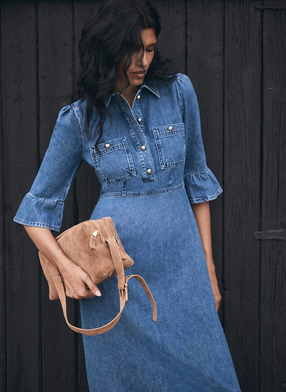 - Indigo denim shirt dress in a midi silhouette with a classic collar, 34 fluted sleeves, chest pockets, ruffle hemline, featuring button fastenings through the front and a zip fastening through the back.