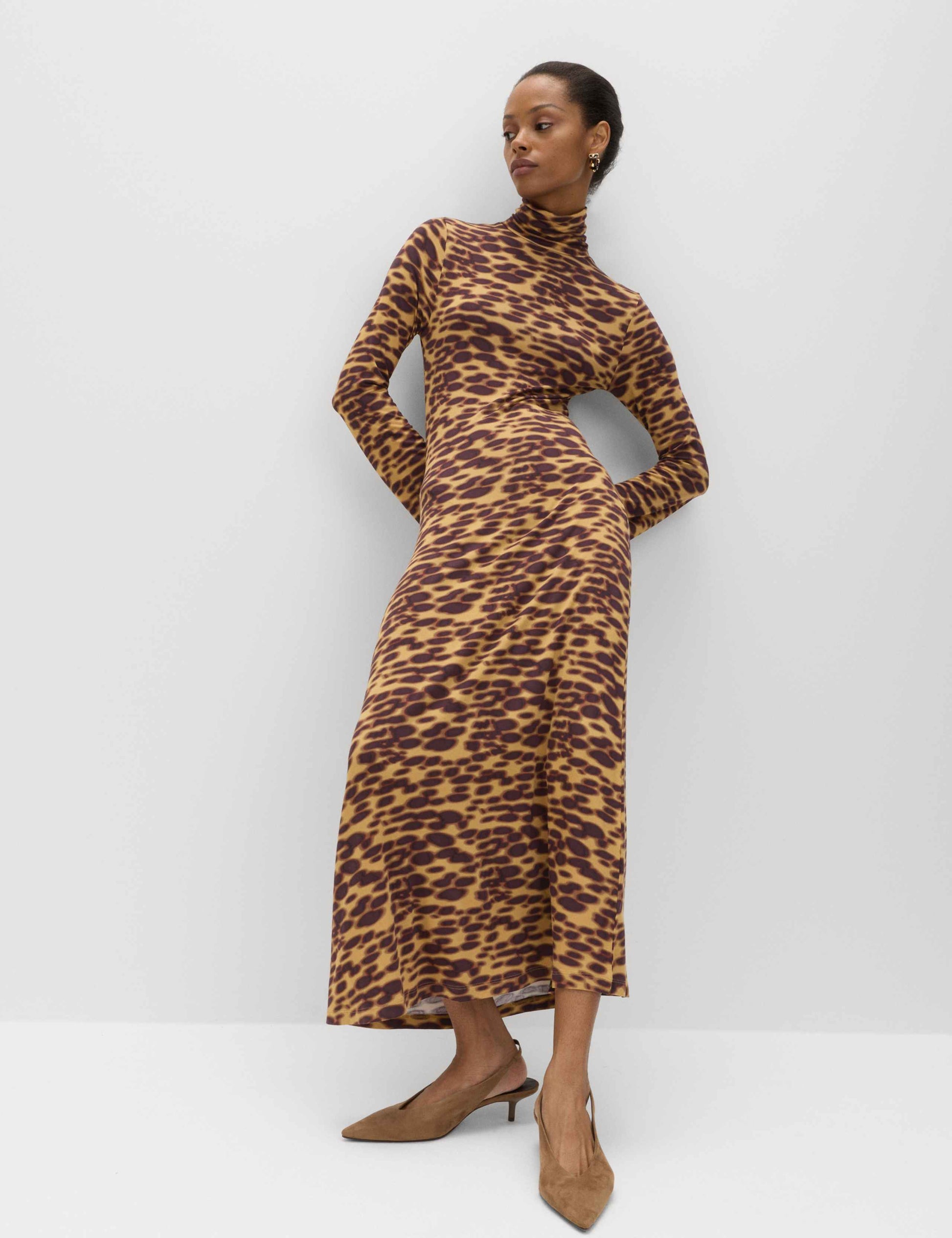 This jersey midaxi dress features a bold animal print for a statement look. It's designed in a flattering fitted shape, with added stretch in the fabric for comfort. The high neck and long sleeves offer a sophisticated finish.
