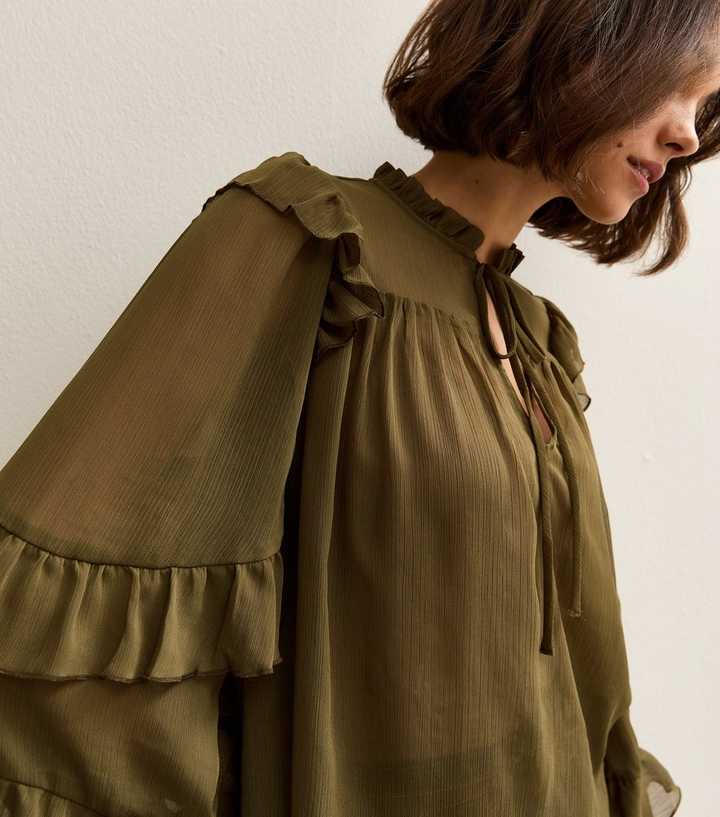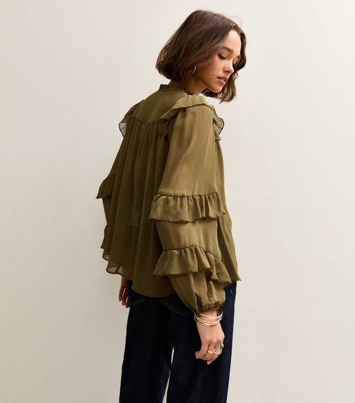 Cut from flowing chiffon, this khaki blouse has a chic keyhole neckline and frilly trims. Leave it as a floaty shape or tuck it into denim.