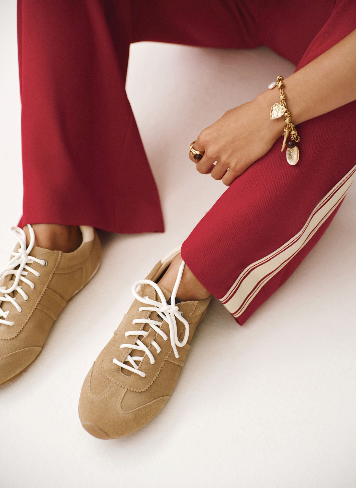 - Tan suede trainers with a round toe, rubber sole, pinked finish pull tab and lace up fastening.