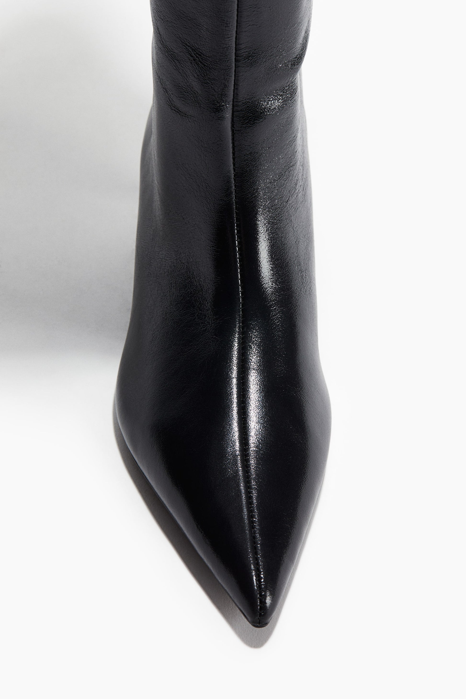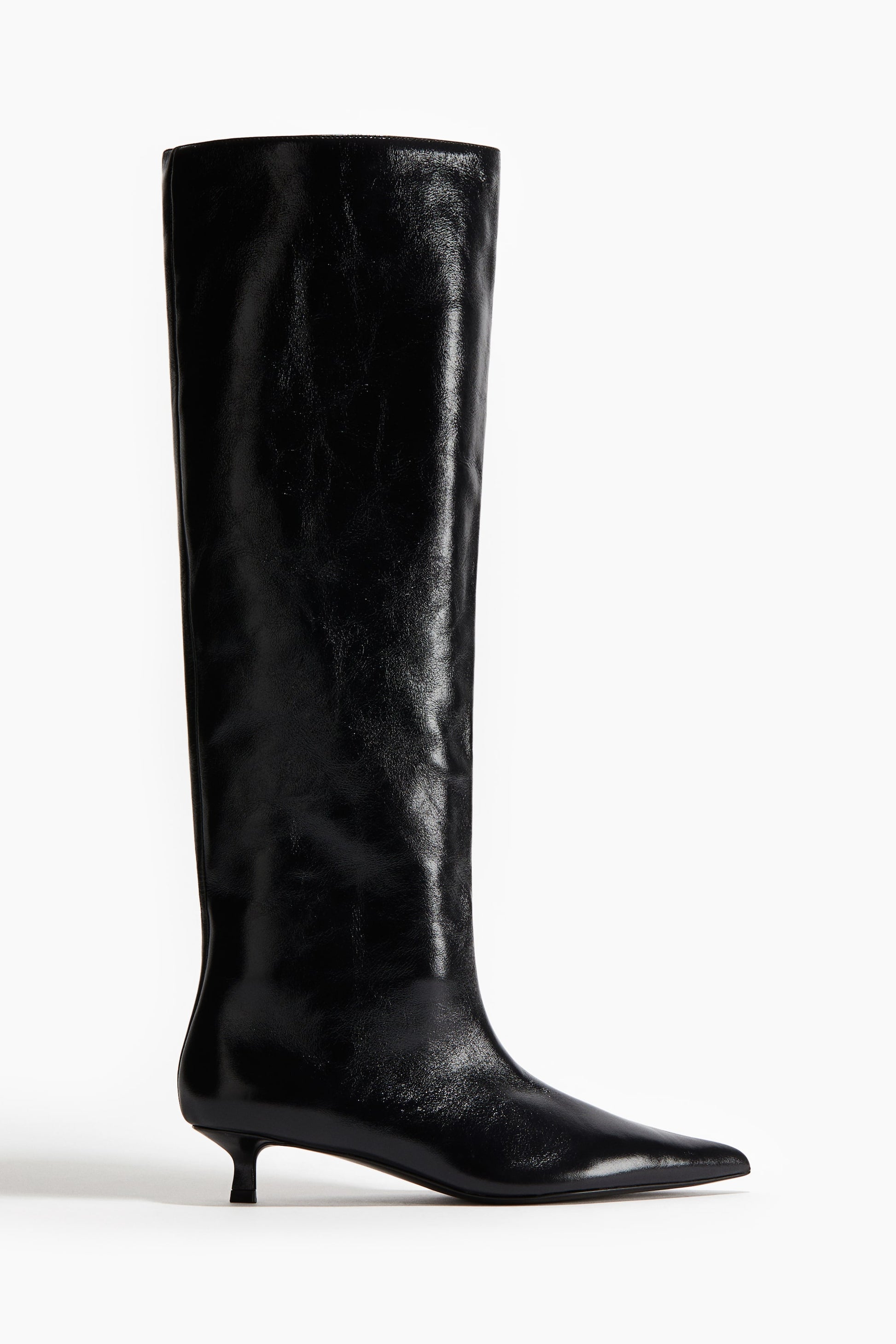 Boots in soft leather with slouchy shafts, pointed toes and kitten heels. Jersey linings and leather insoles.