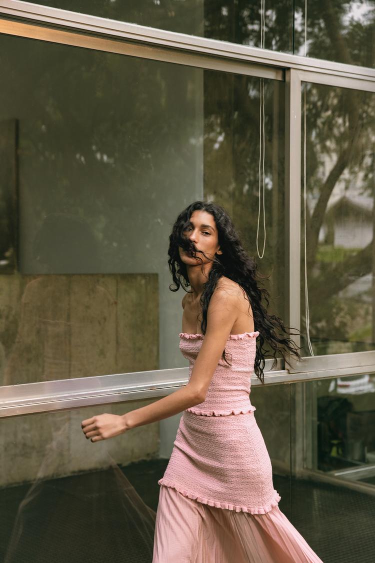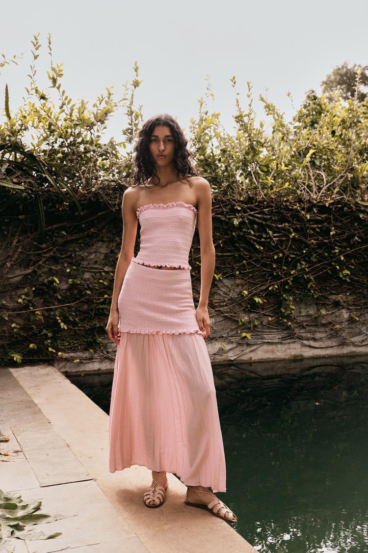 Stretch knit bandeau top. Straight neckline and exposed shoulders. Frill detail.