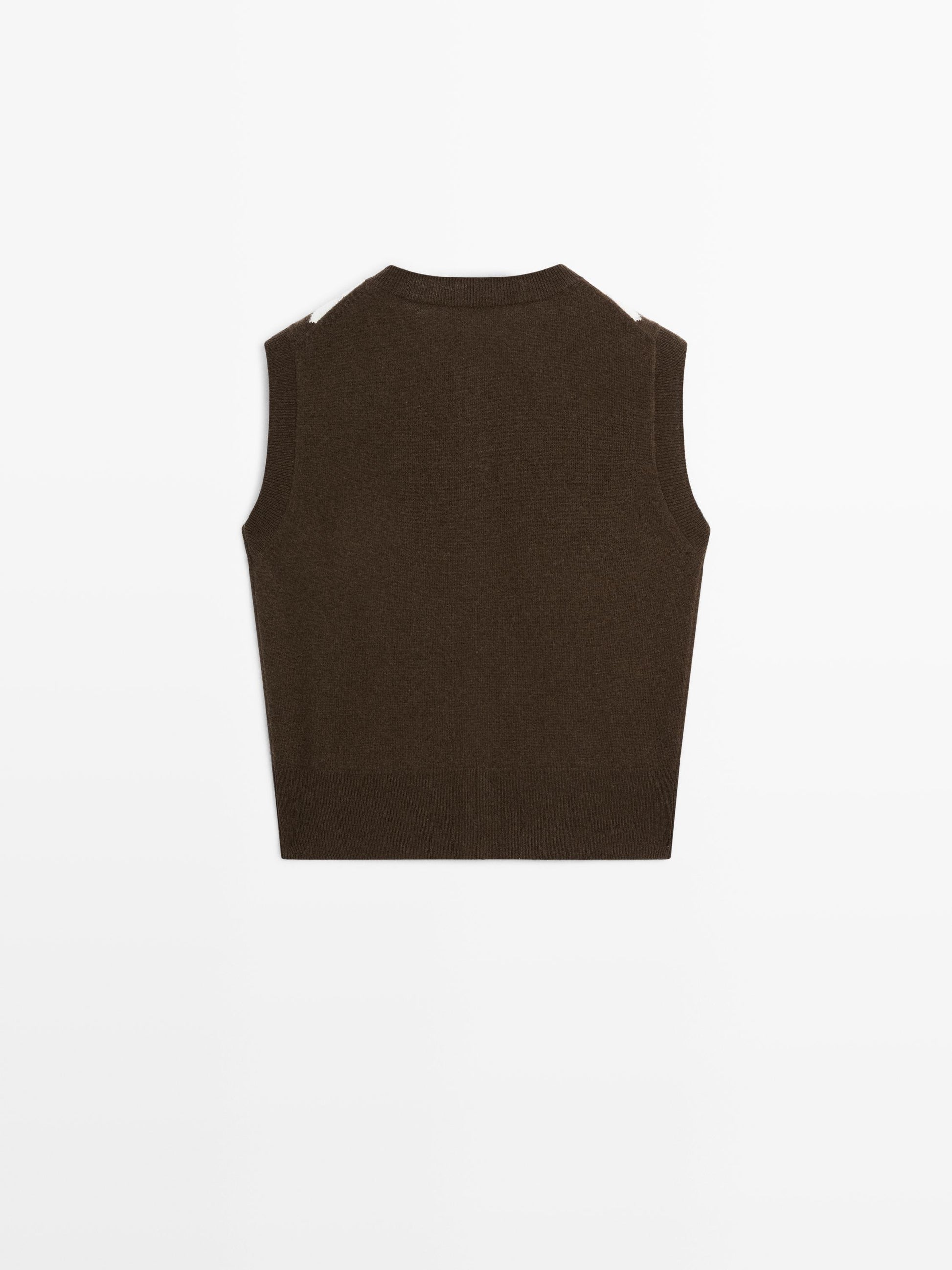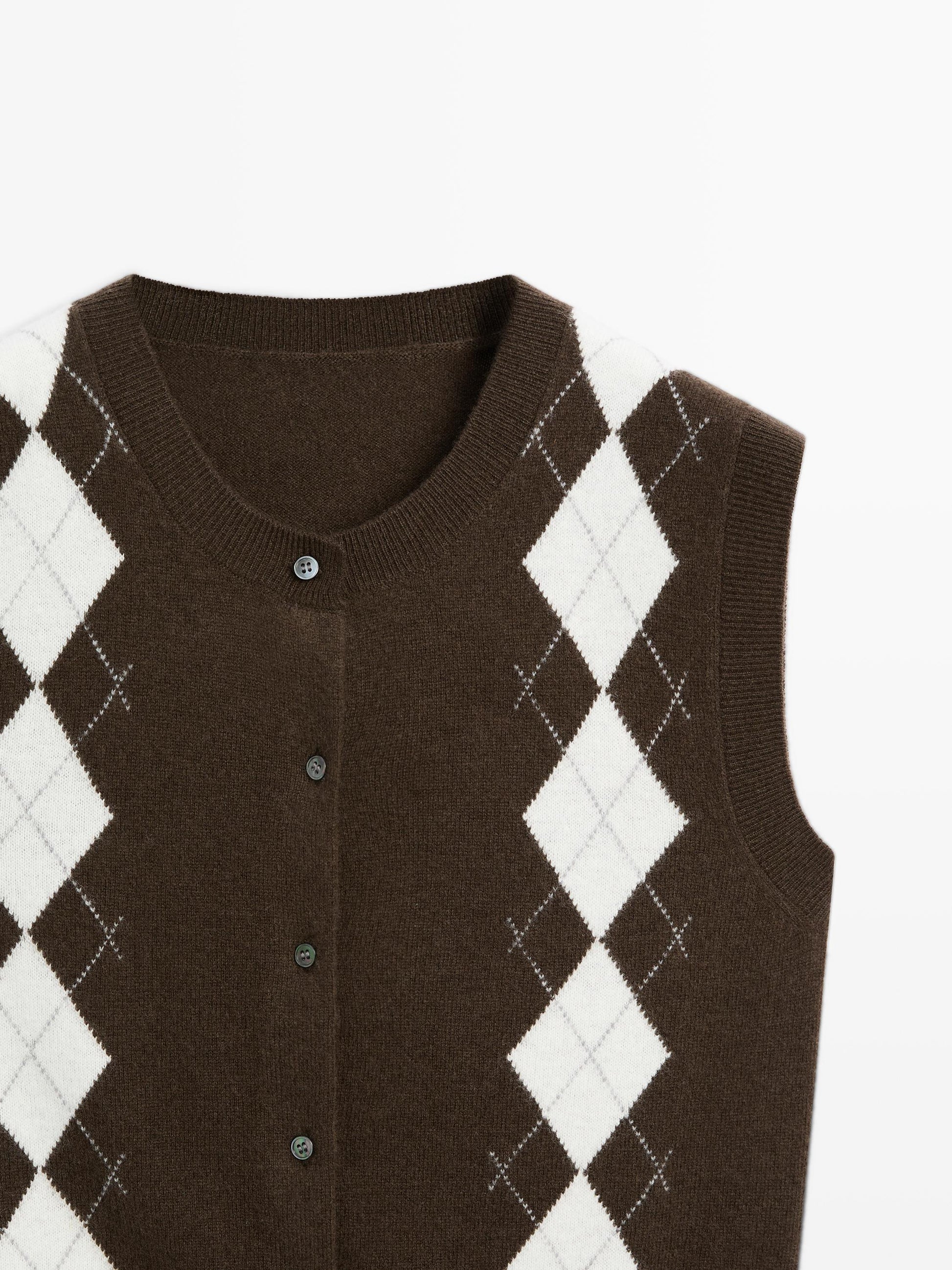 Waistcoat made with wool blend knit fabric. Crew neck. Button-up front. Diamond pattern detail. Ribbed trims .