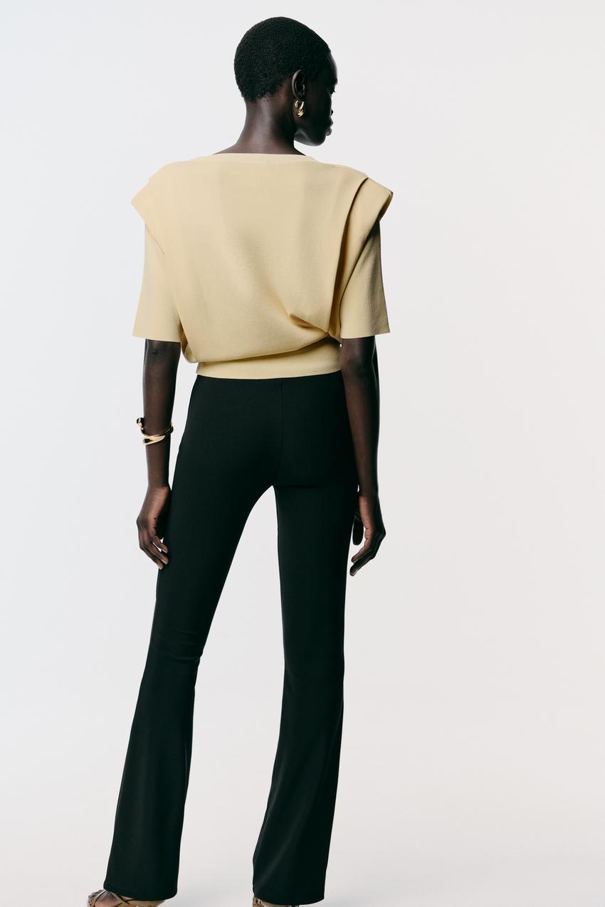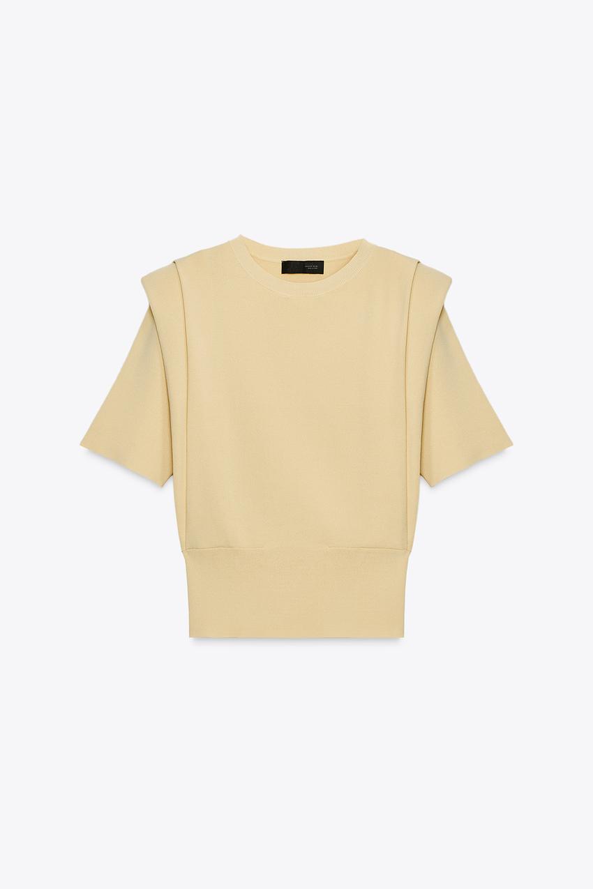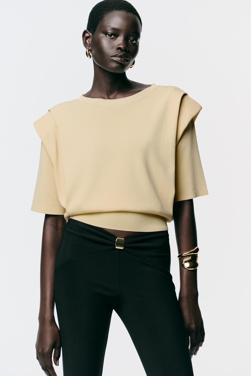 Top featuring a round neck and short sleeves with shoulder pads and pleats.