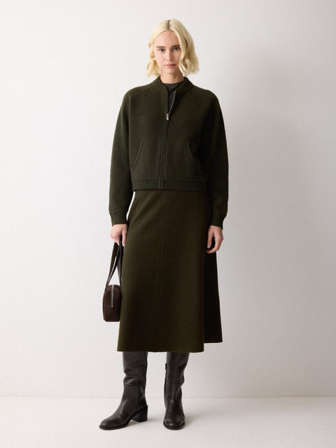 A classic outerwear style, reimagined as a knit. A cropped shape with a zip fastening, the bomber style is a perfect smart casual layer, pairing well with jeans and skirts alike. The cotton-wool-cashmere blend gives it an rich, extra-soft handfeel. Aden is 5'11 and wears a size 8