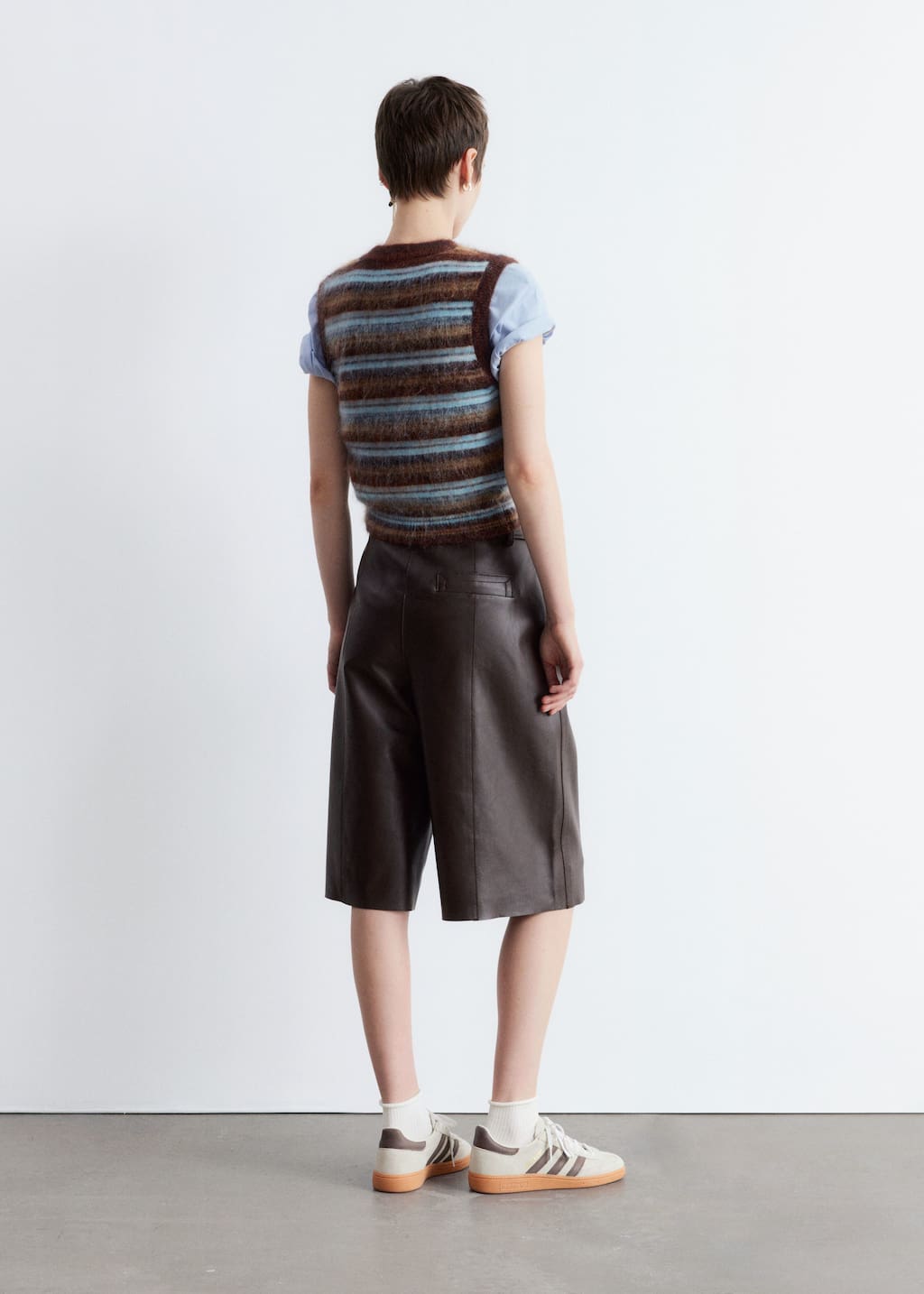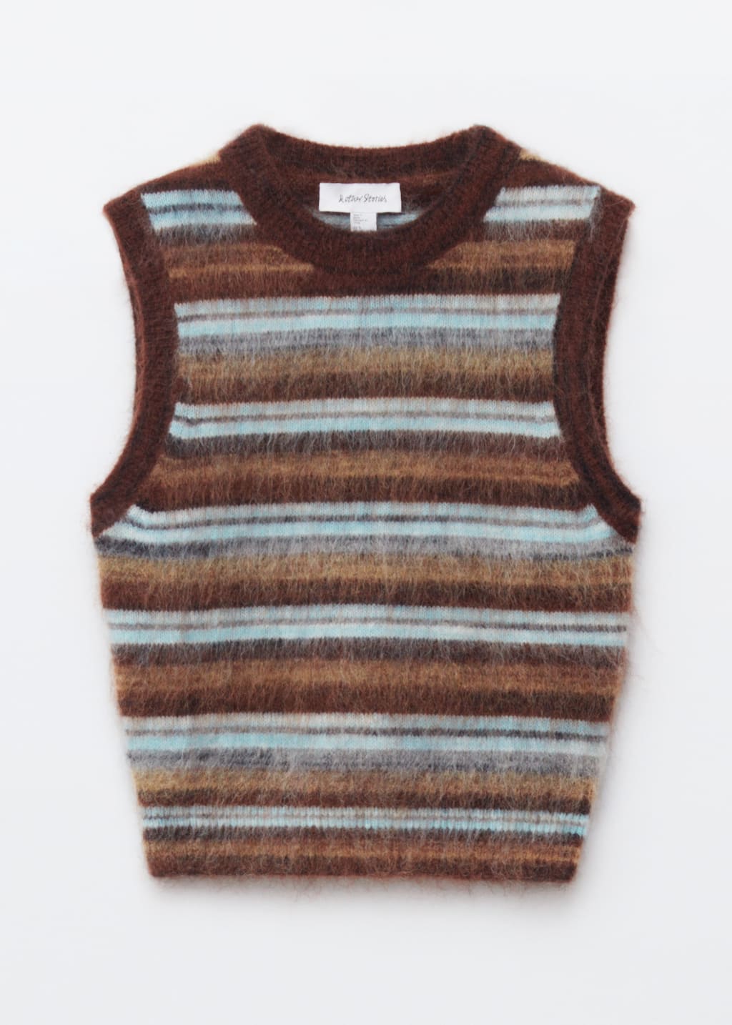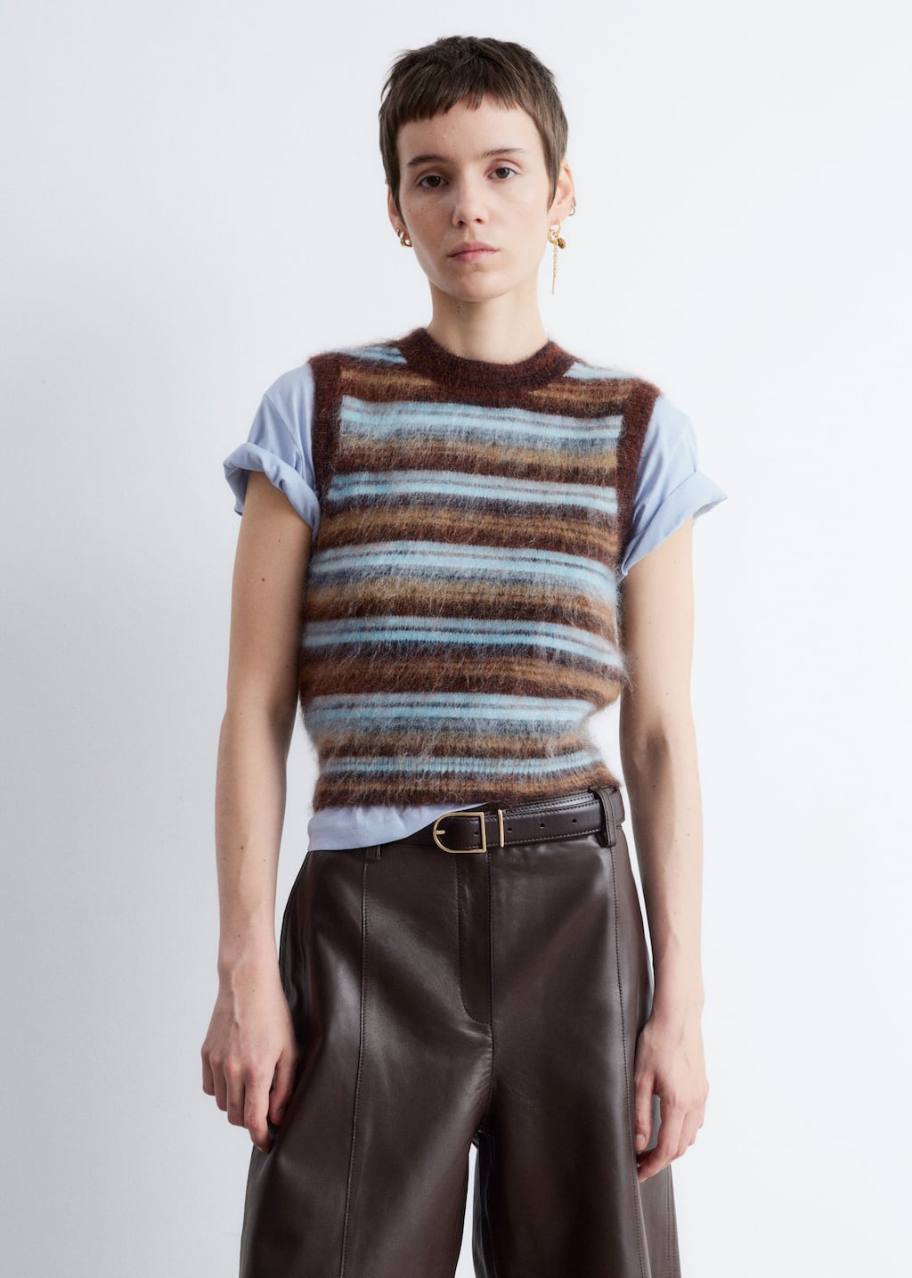 This vest is knitted from a mohair-wool blend with a brushed, tactile finish and features horizontal stripes in contrast colours. Its cut in a straight shape with a round neck and ribbed trims. Wear it solo or layered over T-shirts and shirts.