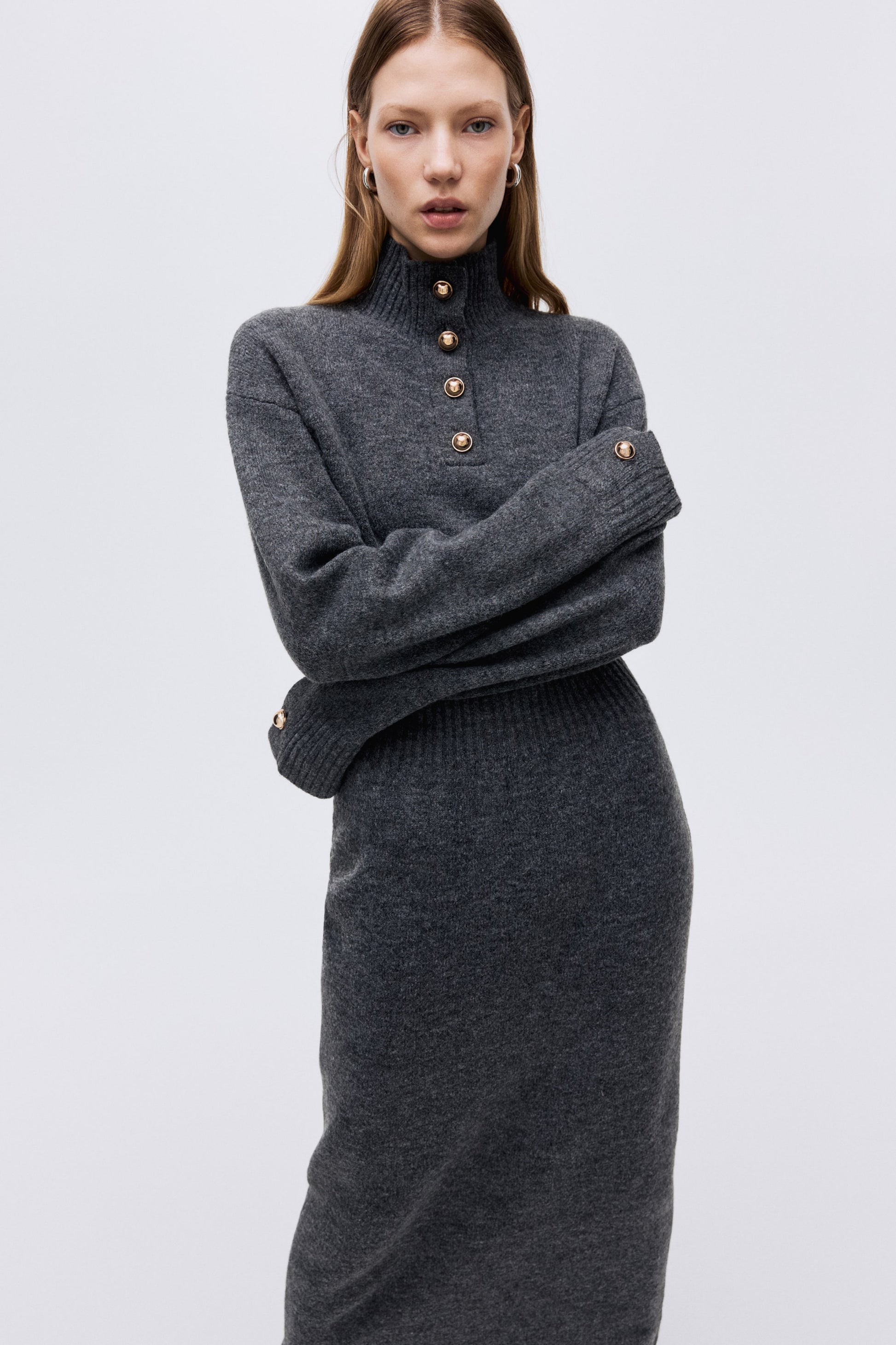 Calf-length dress in a soft knit with a ribbed turtleneck and domed metal buttons at the top. Gently dropped shoulders and long sleeves with ribbing and a button at the cuffs. Ribbing at the waist and narrow ribbing at the hem.