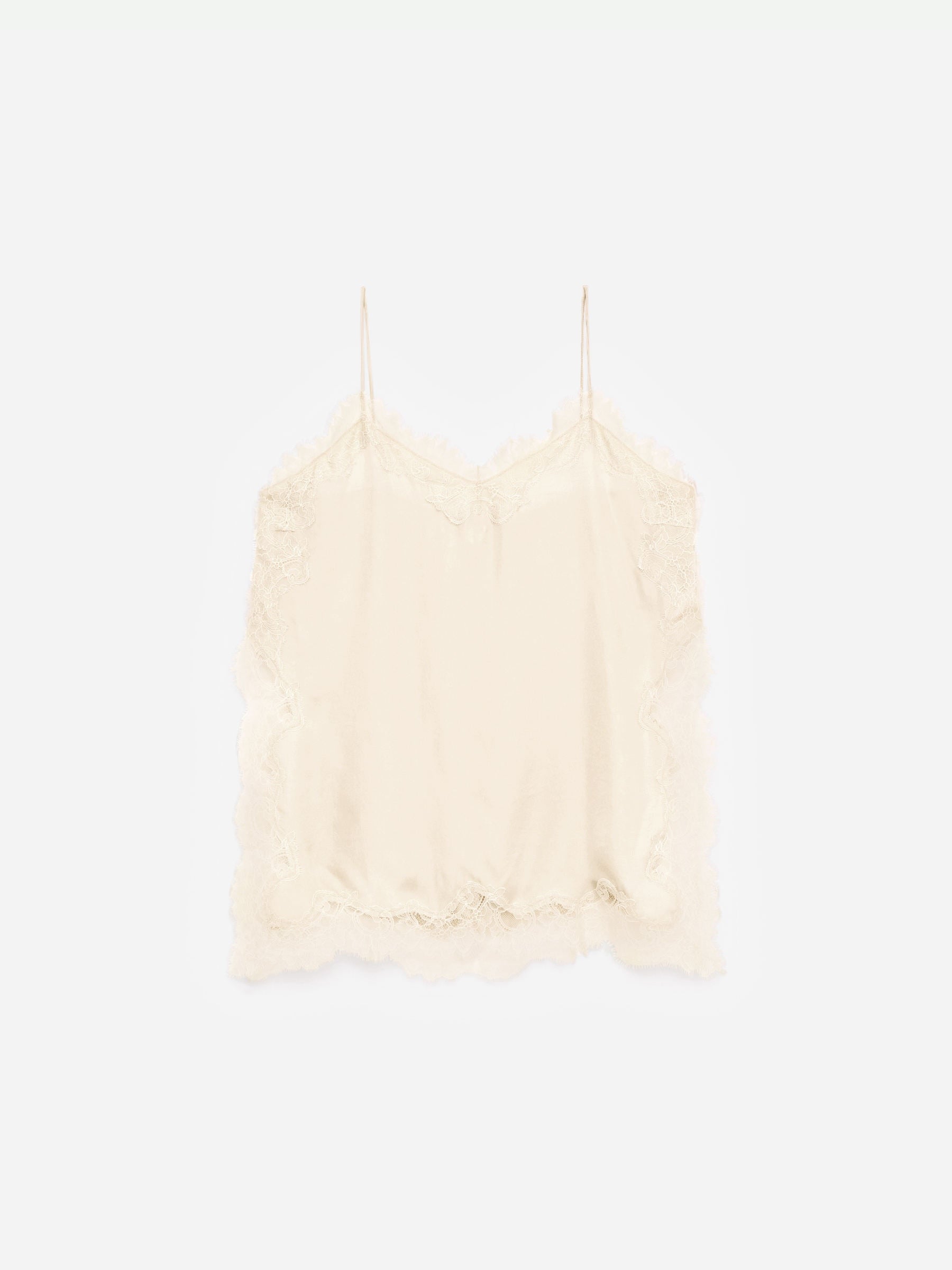 Strap top crafted from satin woven in cellulose acetate. Features delicate lace detailing and high side slits. Regular fit.